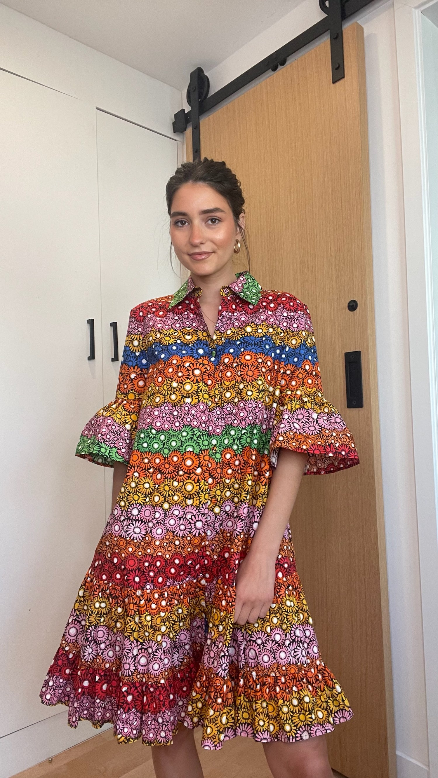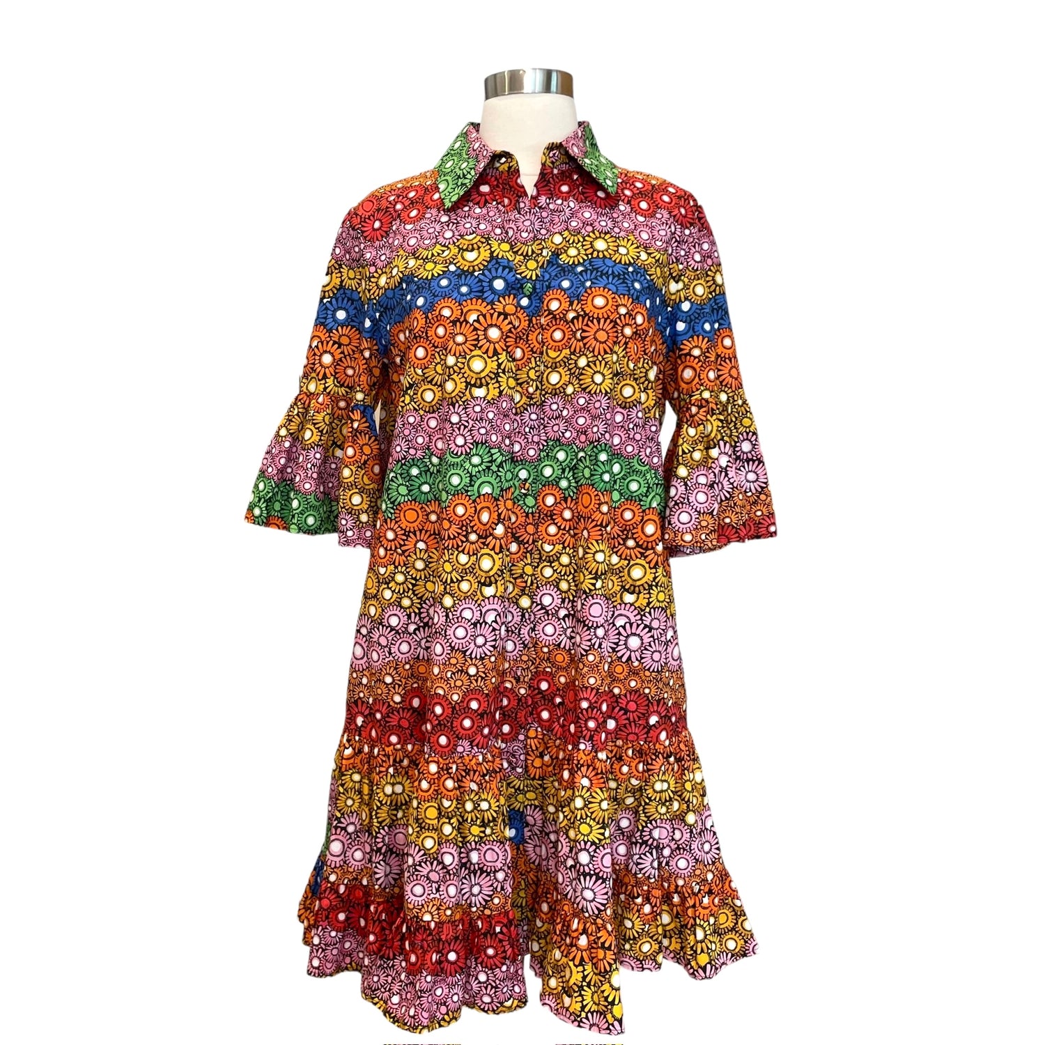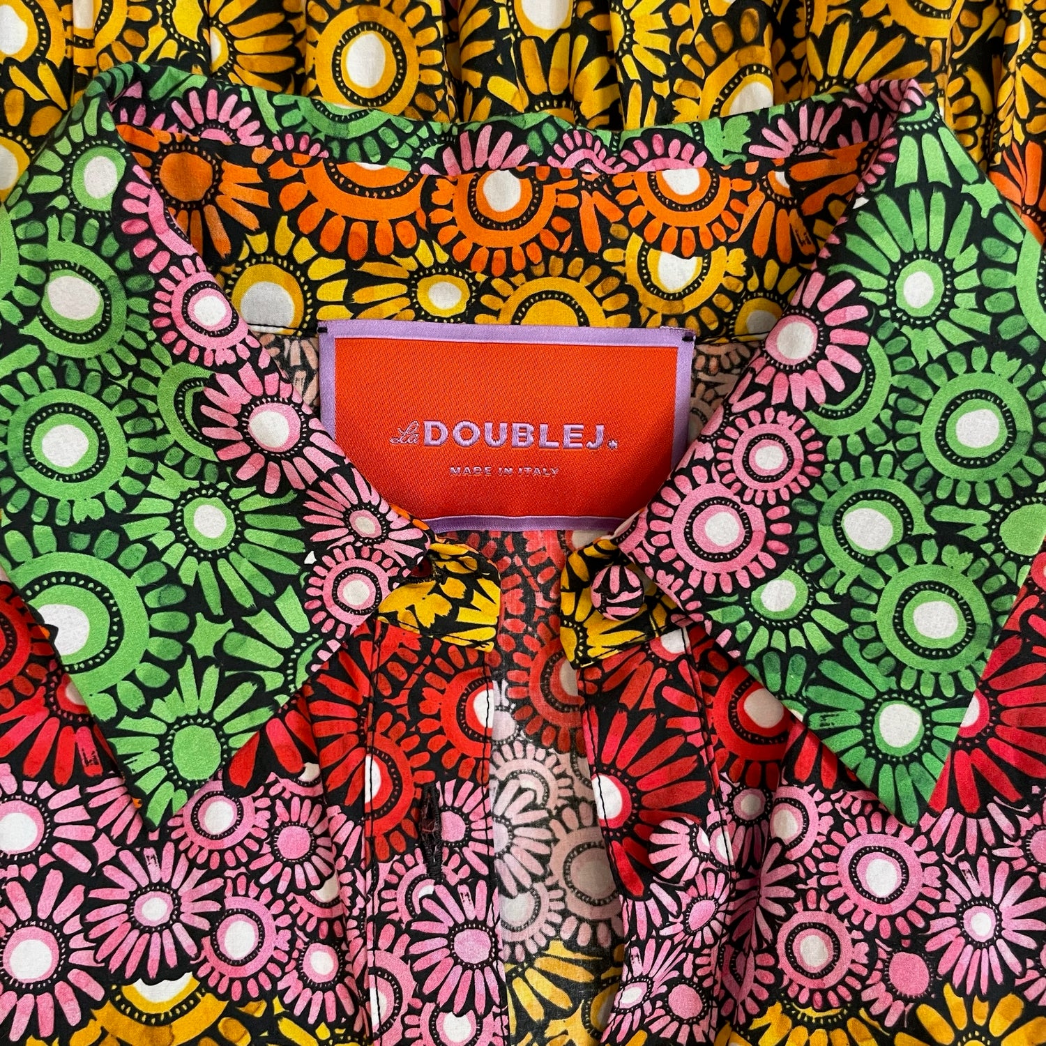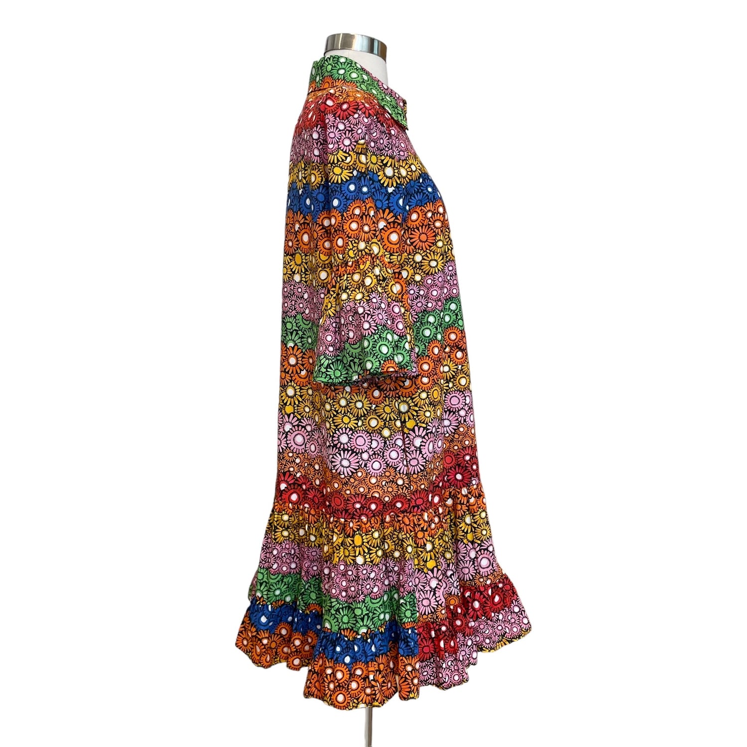 La Double J dress. Rainbow floral print. Button closure at front. Pointed collar. Slit pockets. Designer size medium.