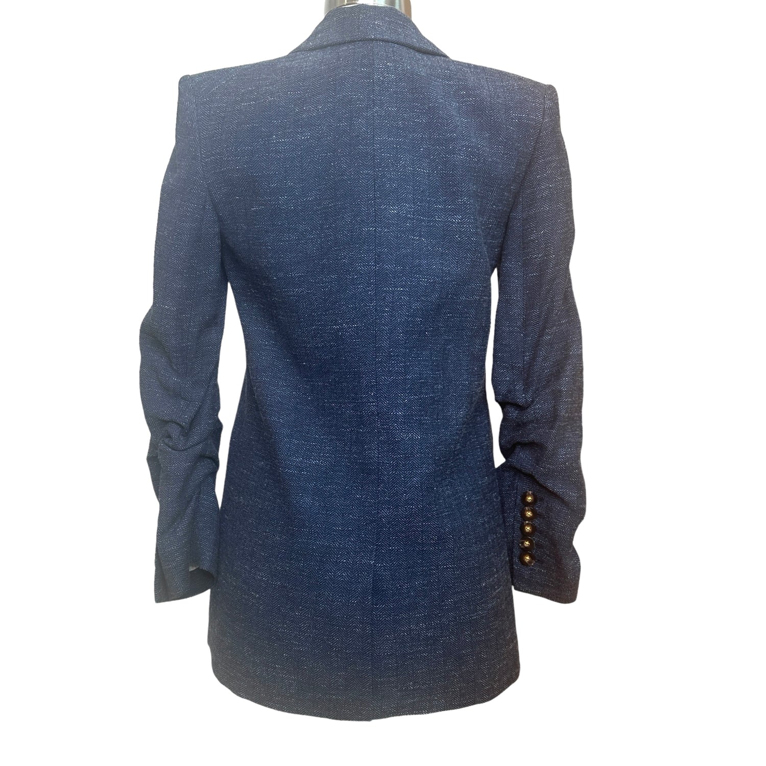 Veronica Bead suit. Blue blazer and pants. Buttons at front and pockets. Designer size (blazer) 0 and (pants) 00.