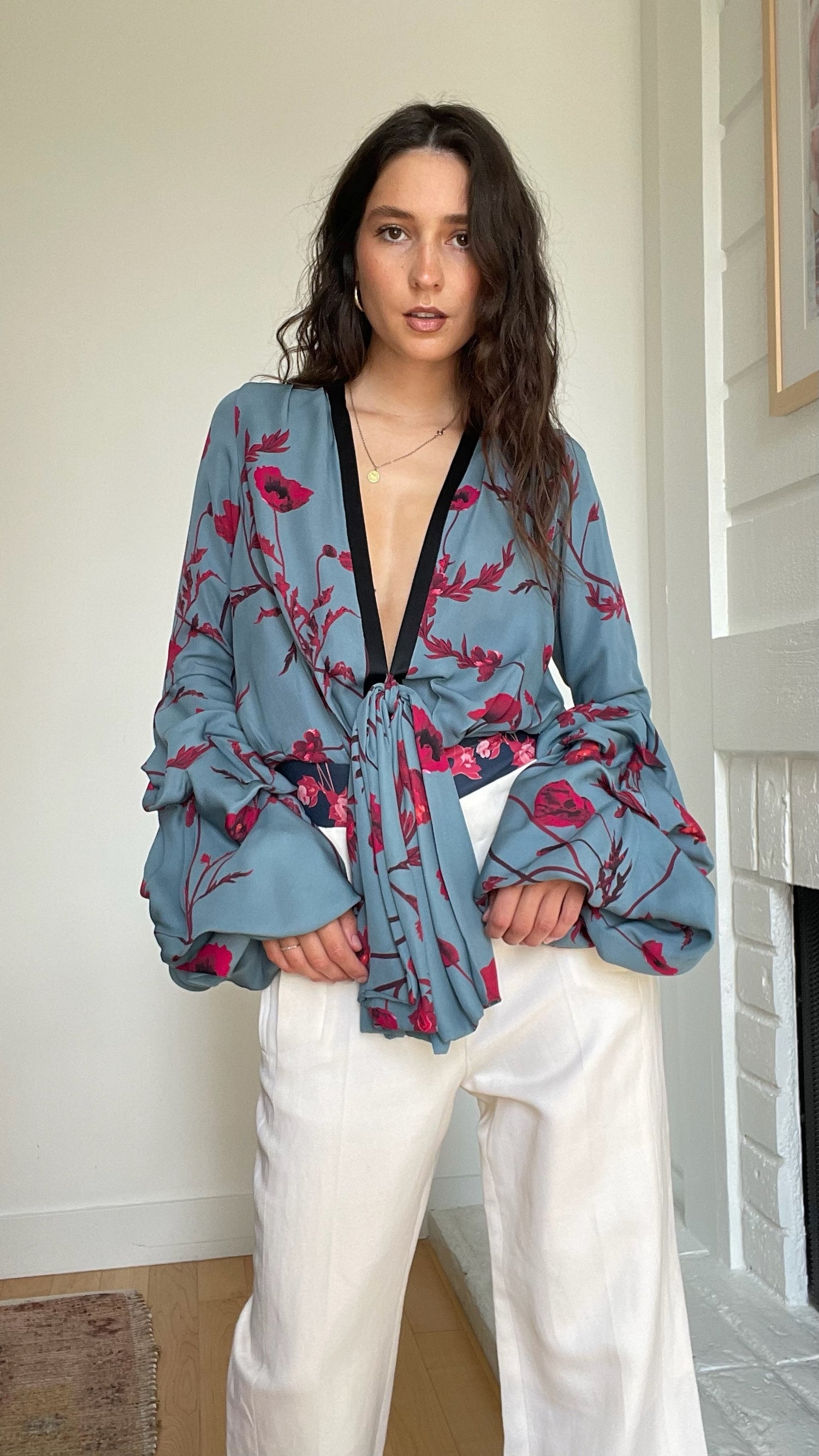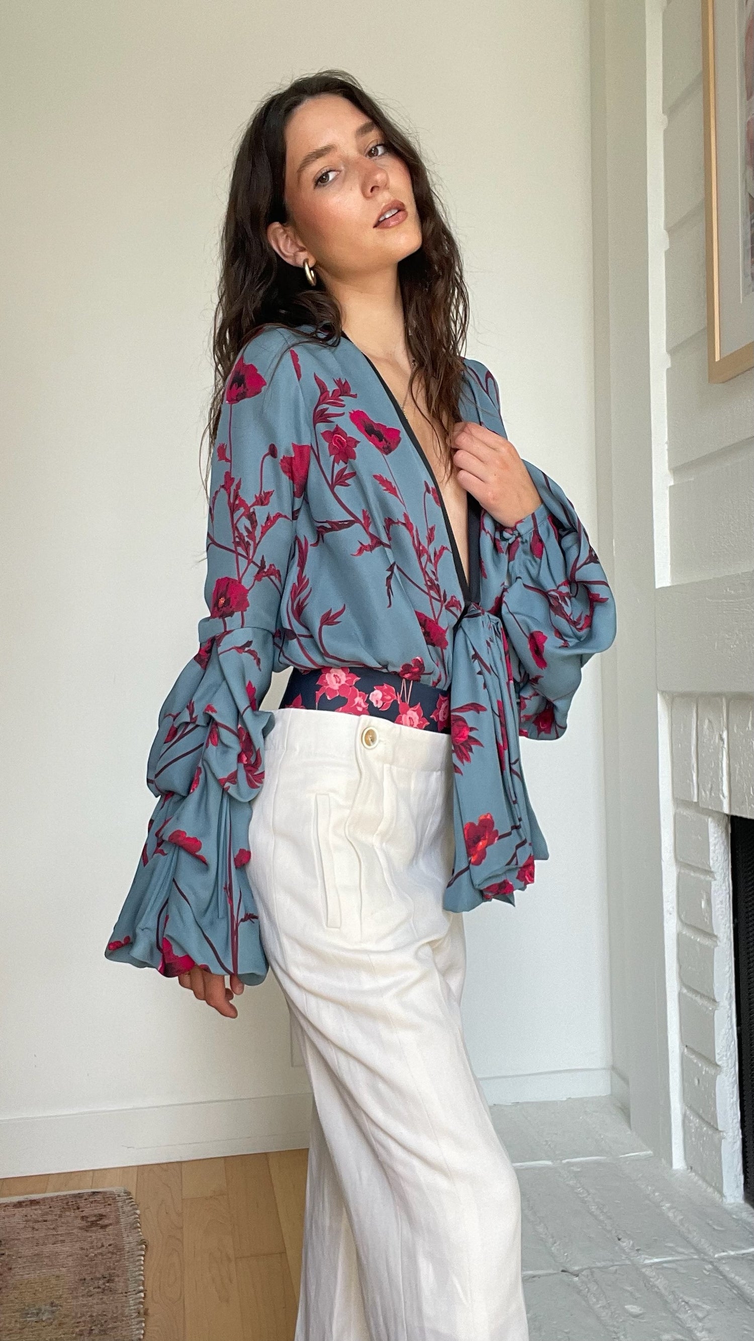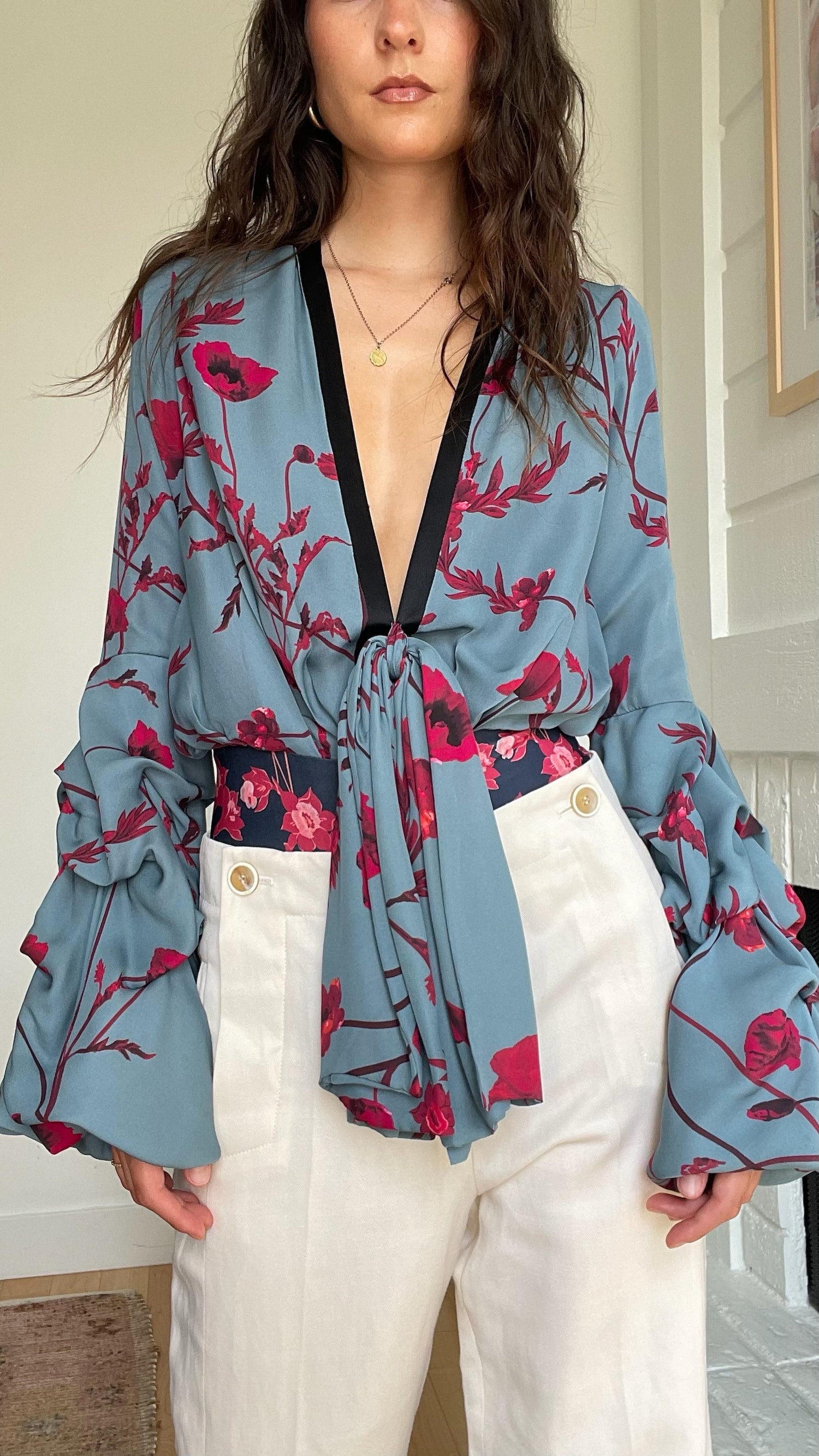 Johanna Ortiz bodysuit. Blue and red floral top. Long sleeves. Designer size 2.