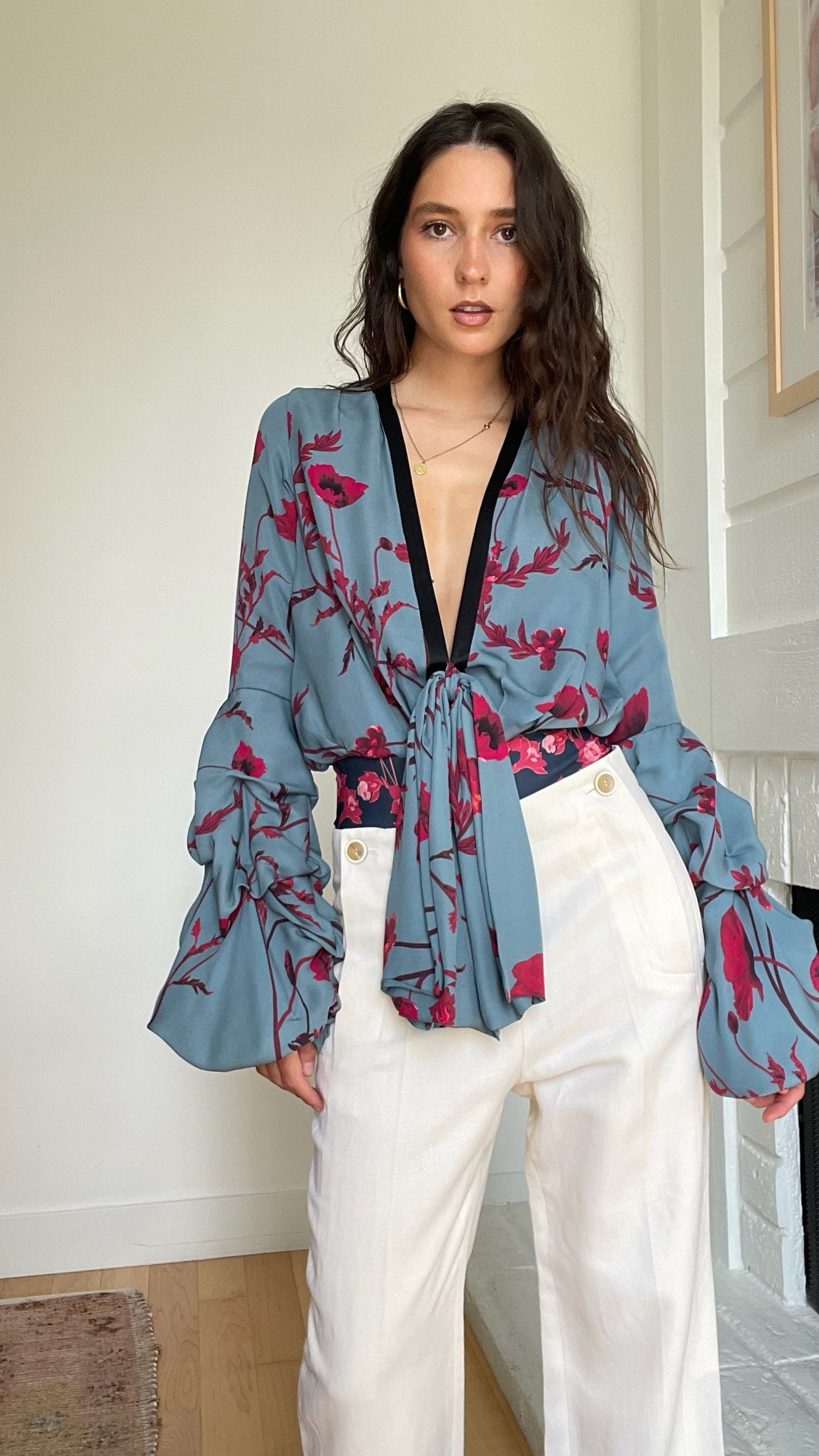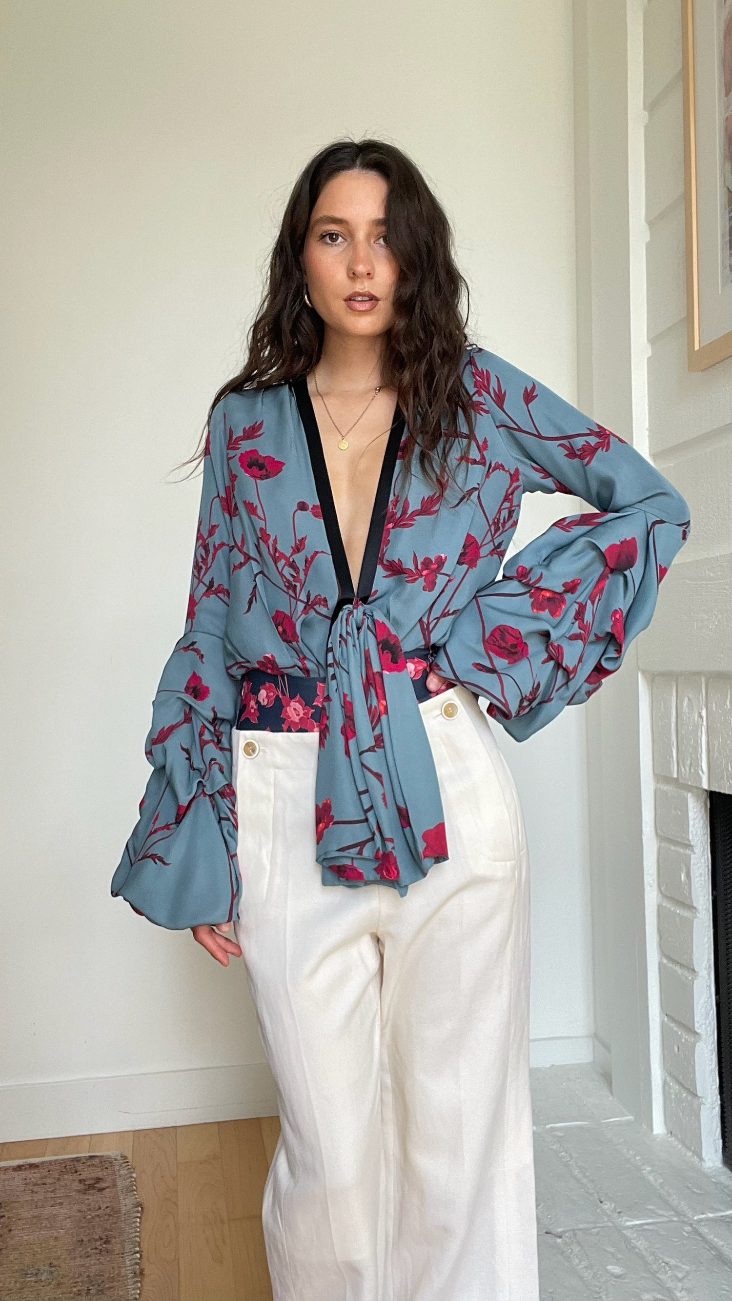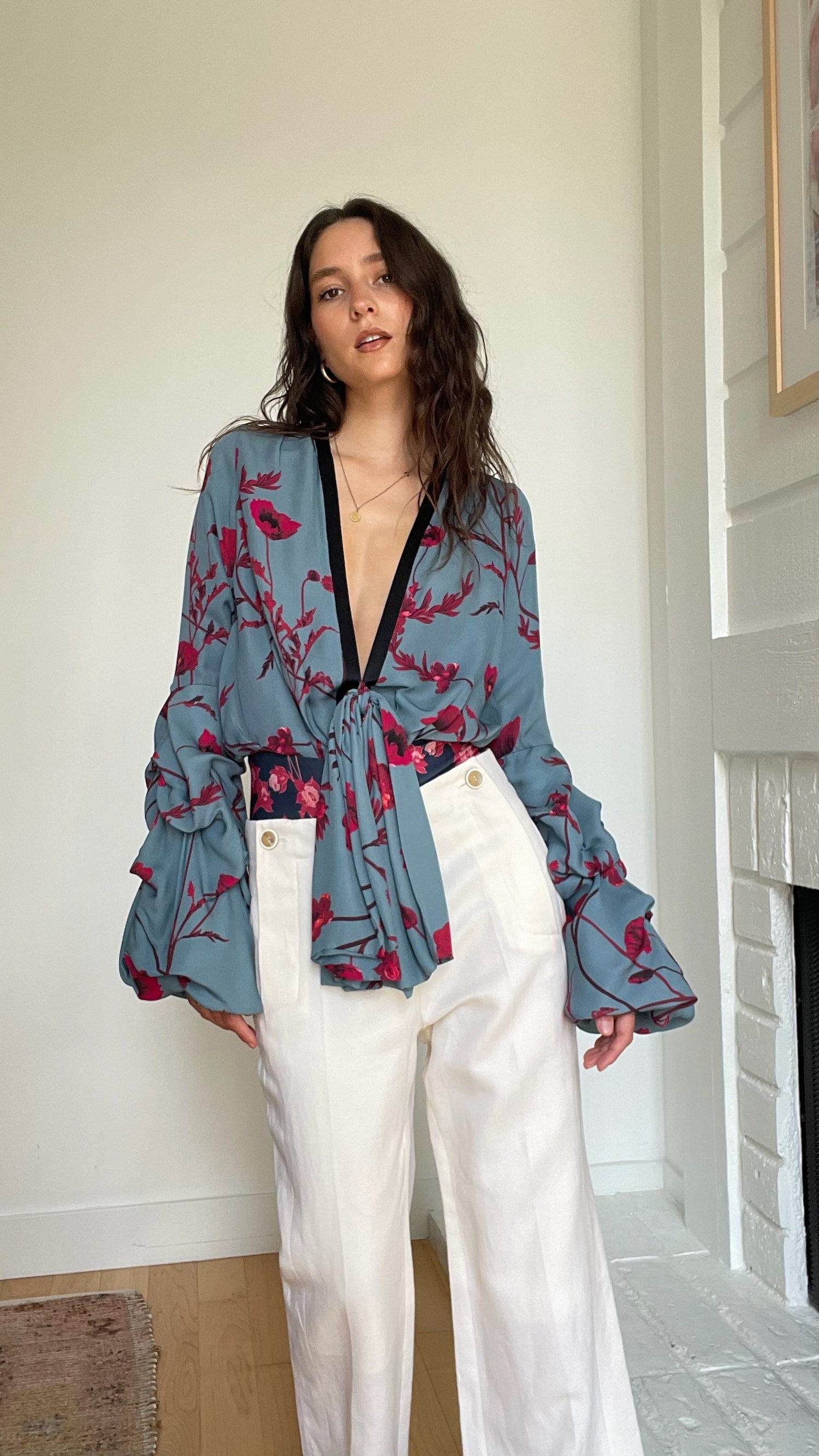 Johanna Ortiz bodysuit. Blue and red floral top. Long sleeves. Designer size 2.