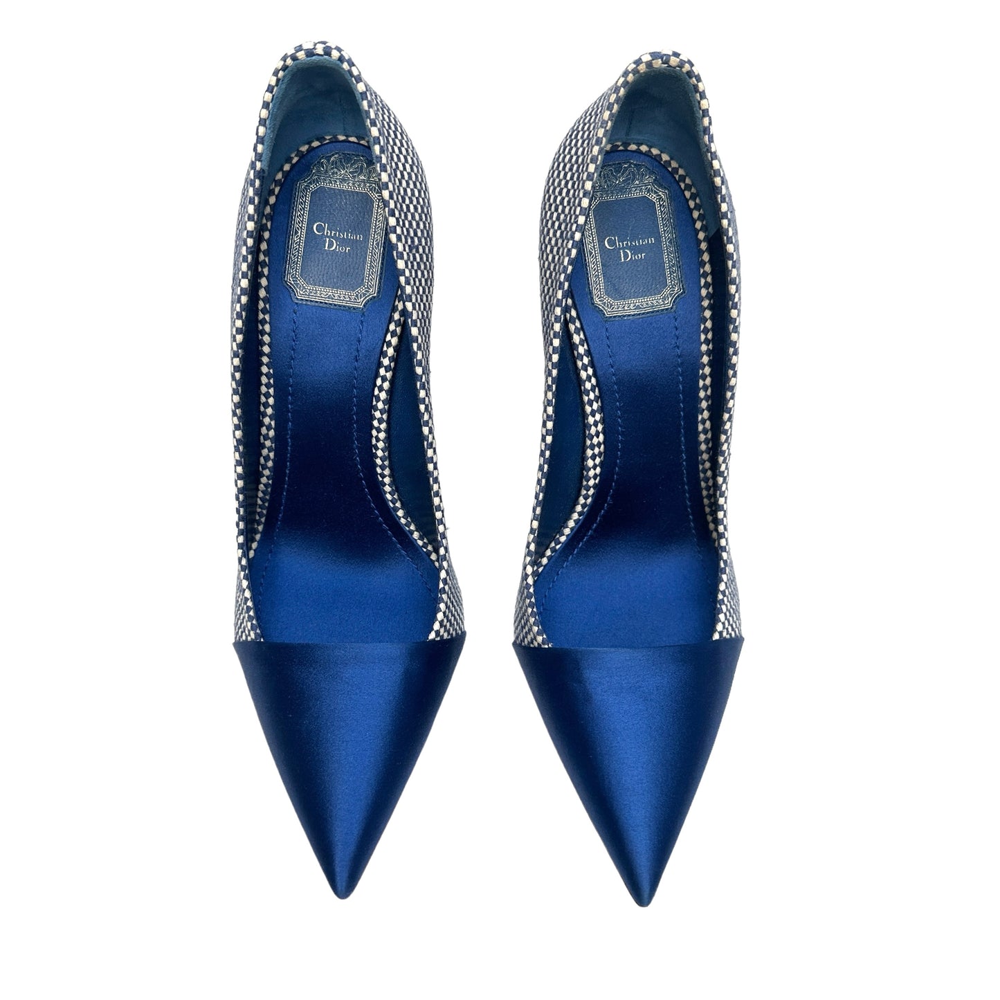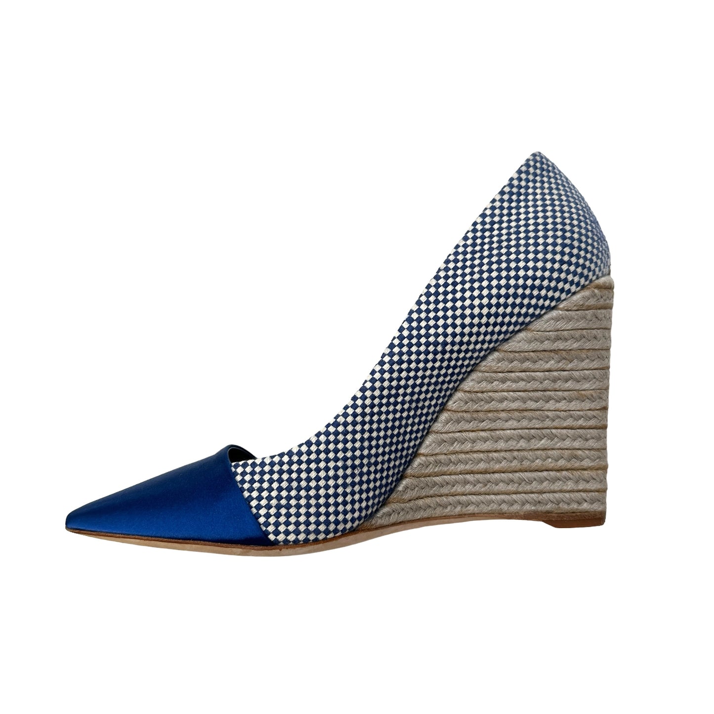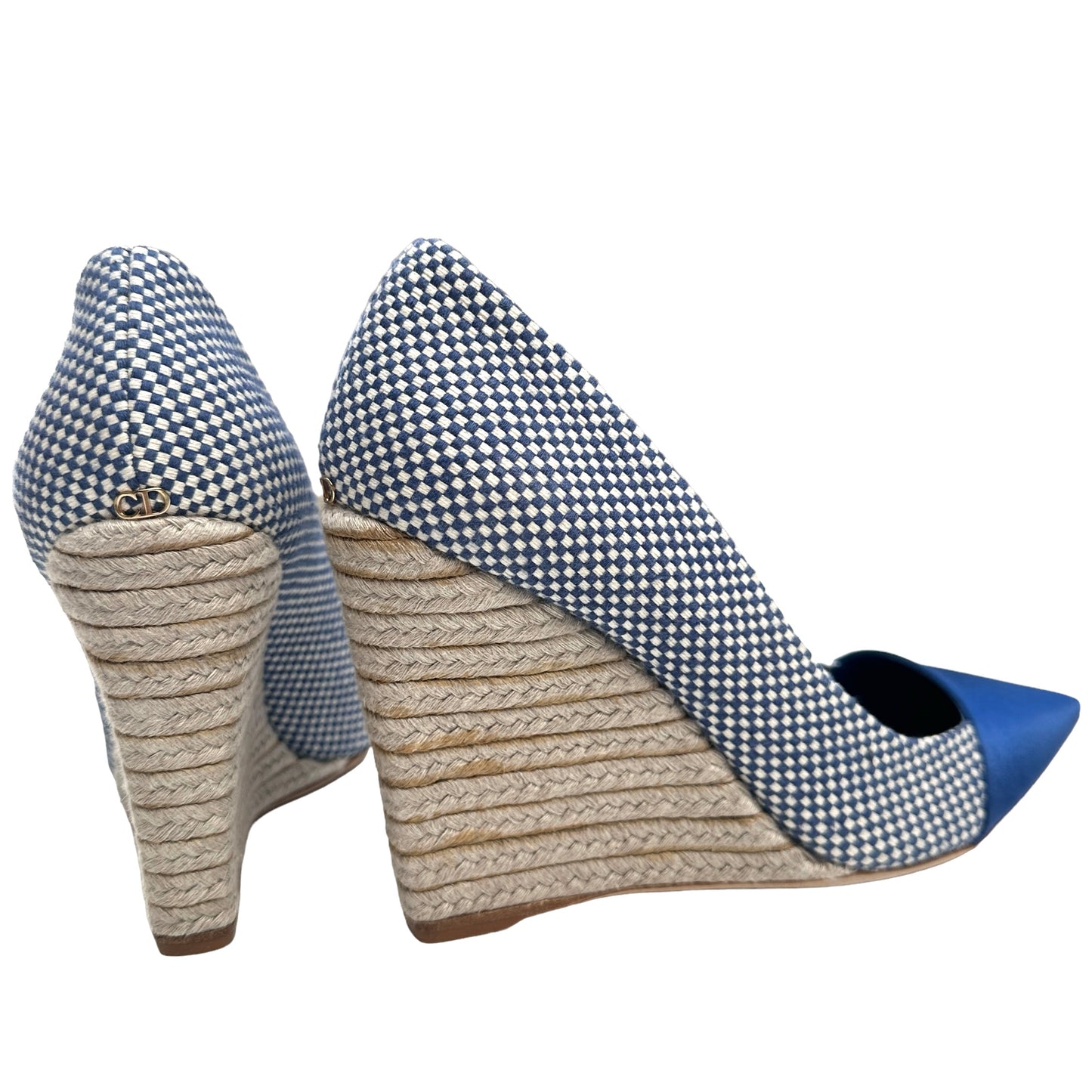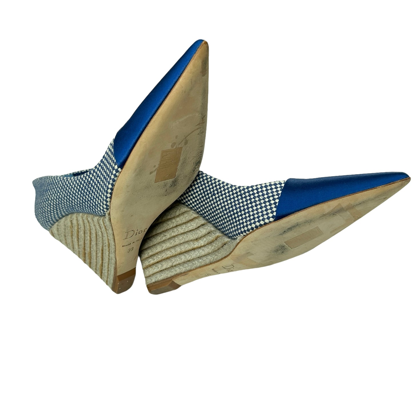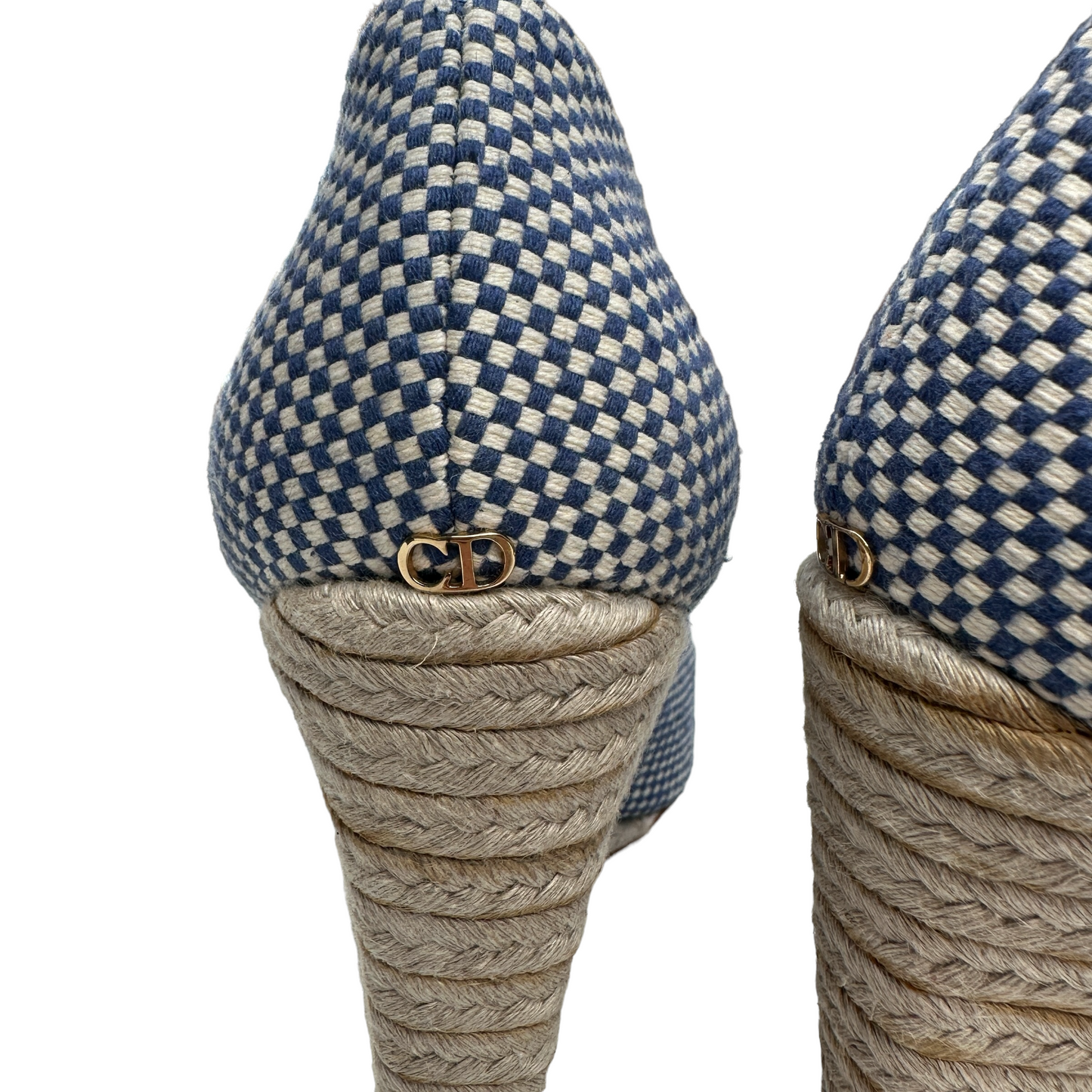 Christian Dior satin heels with rope wedges. Blue satin pointy toes. Checker pattern. CD logo at back. Designer size 39.