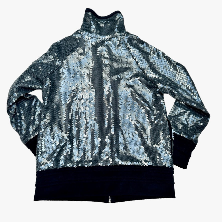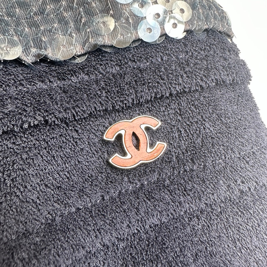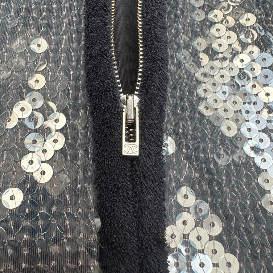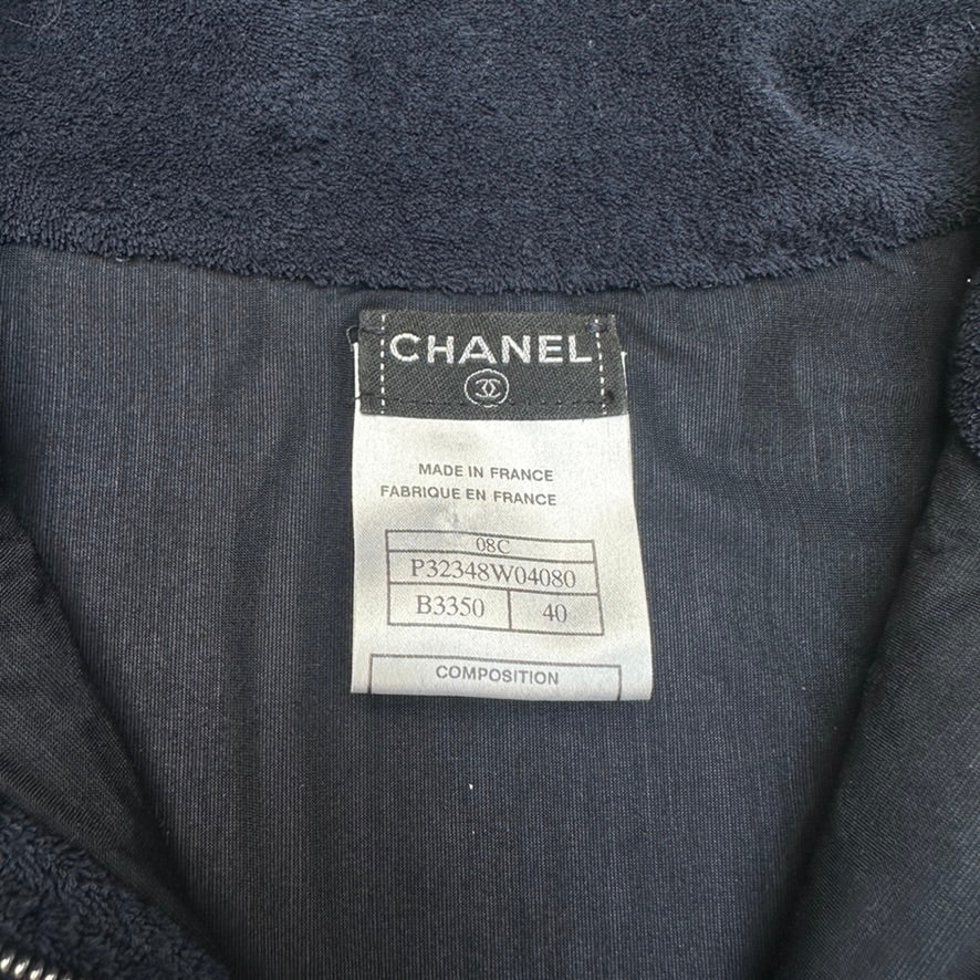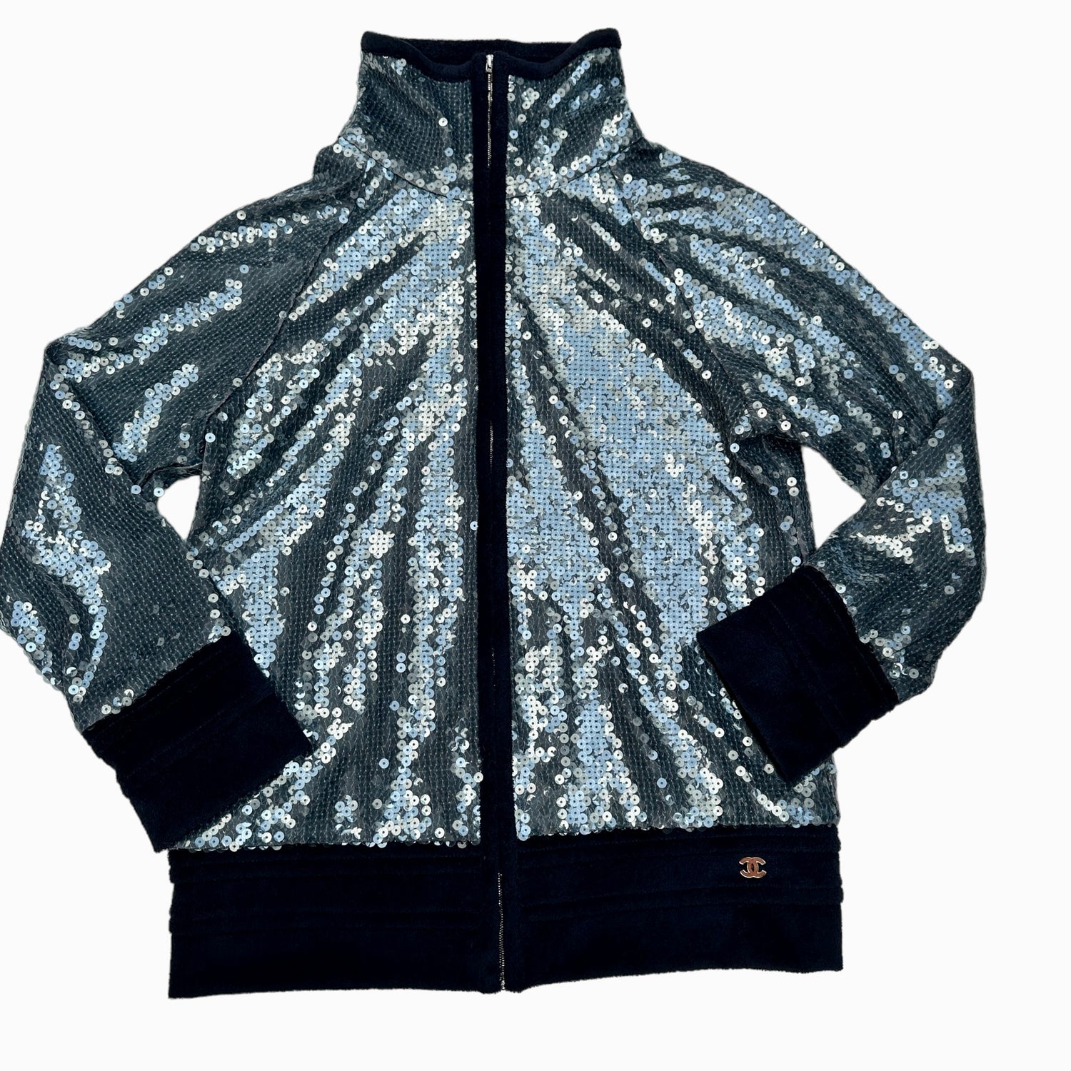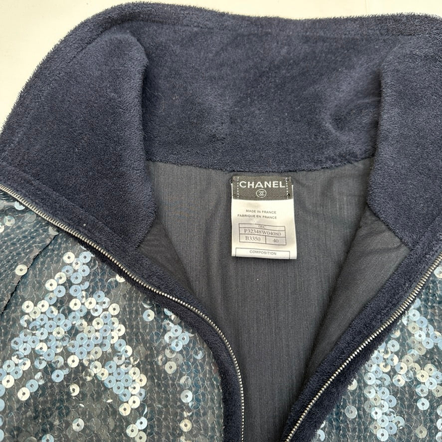 Chanel blue sequins jacket and terry cloth. Vintage. From the Cruise 2008 Collection by Karl Lagerfeld. Interlocking CC logo in wood and silver-tone hardware. Stand collar. Zipper closure at front. Designer size 40.