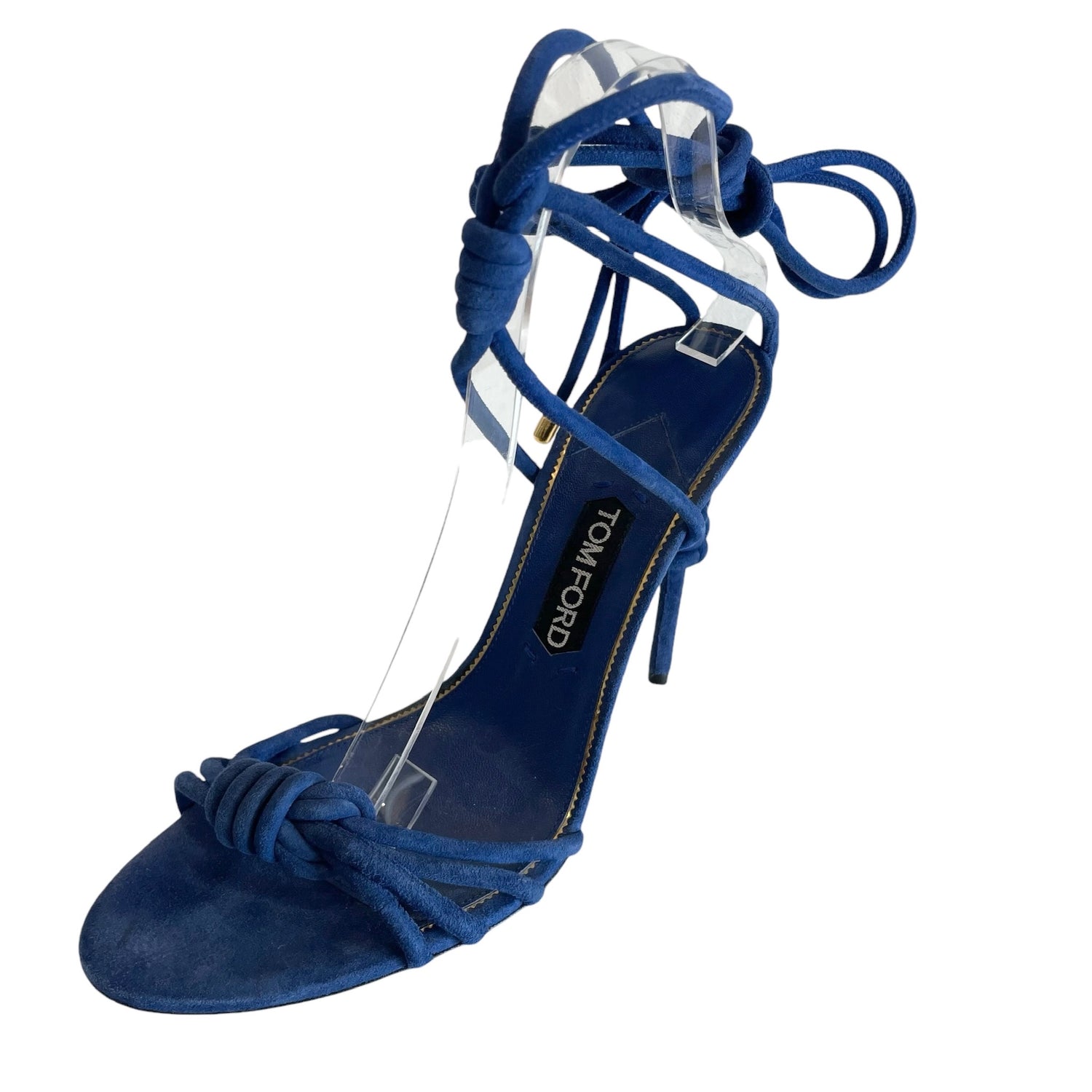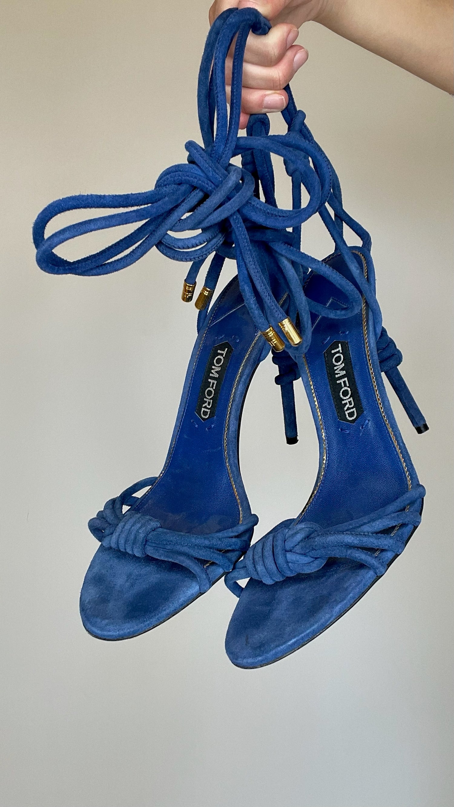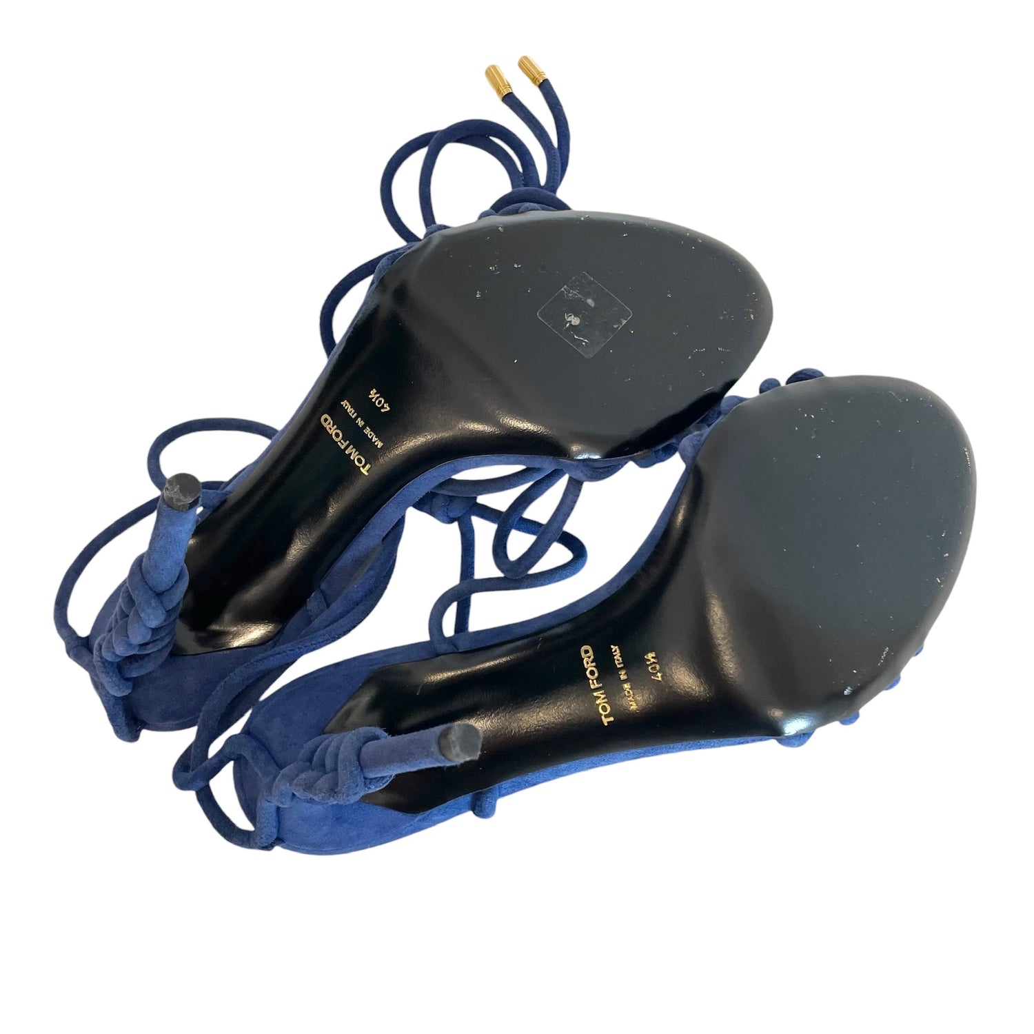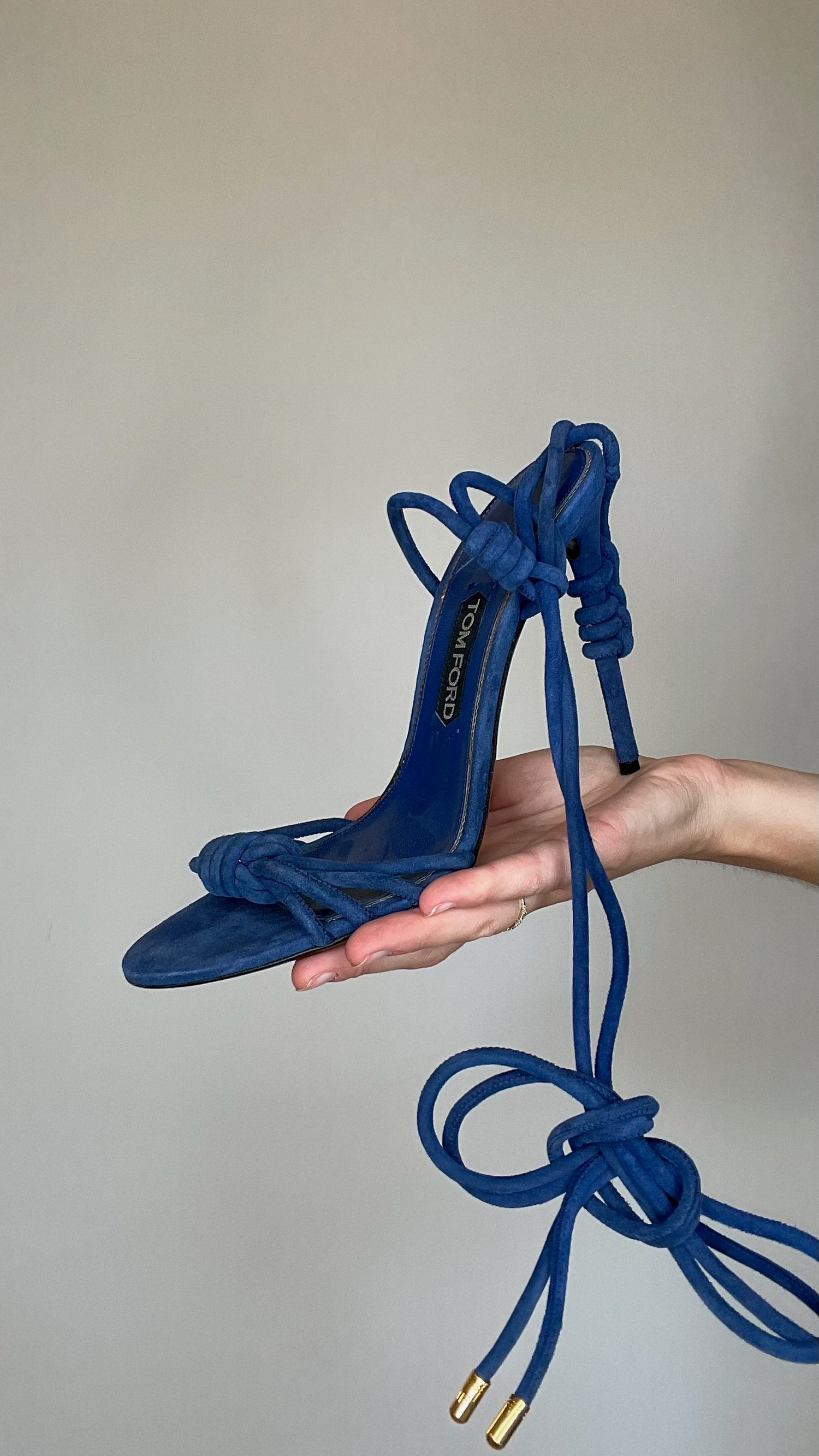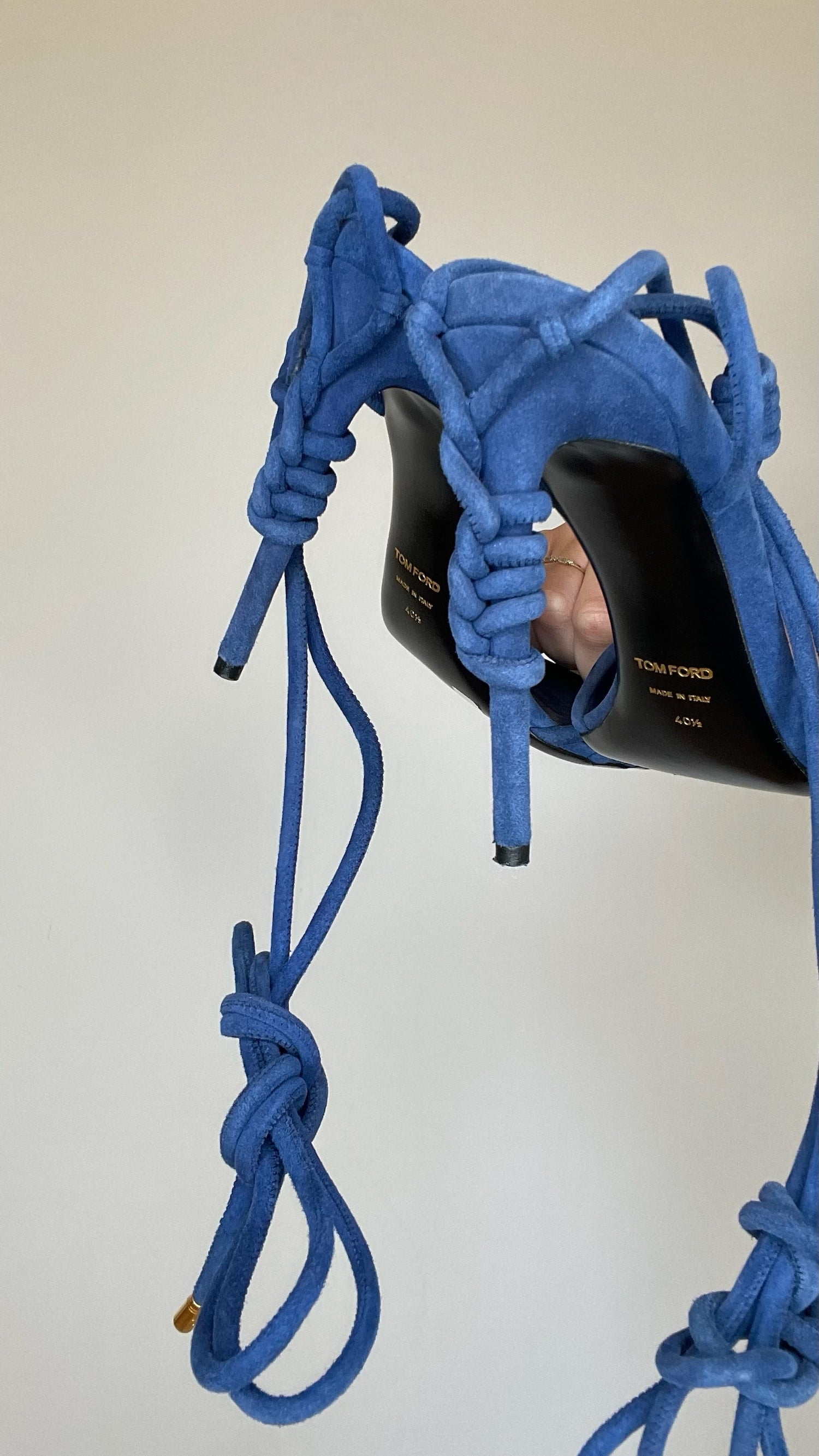 Tom Ford blue suede heels. Ankle ties. Round open toe. Designer size 40.5