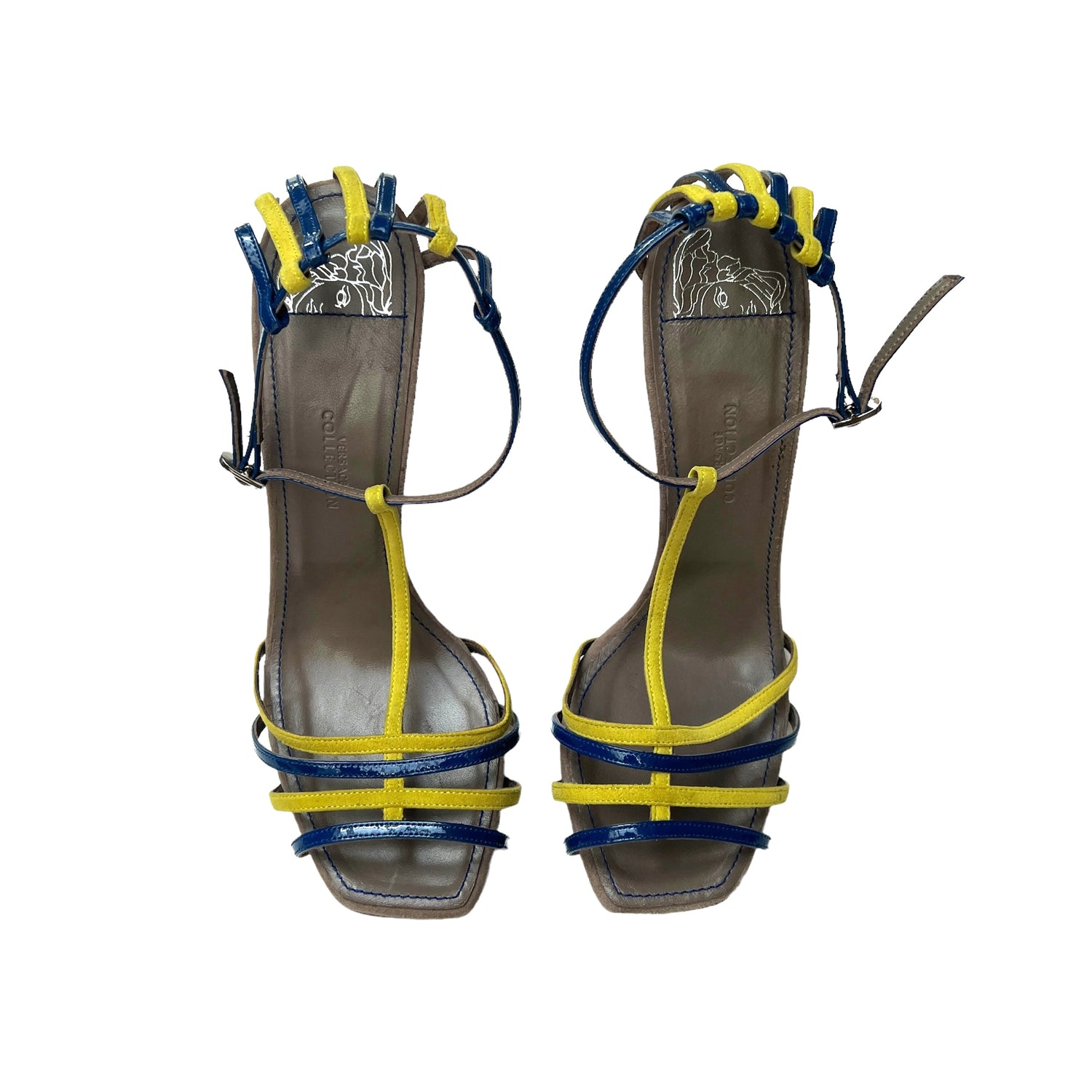Vintage Versace heels. Yellow suede straps and blue patent straps mixed. Square toe. Designer size 38.5