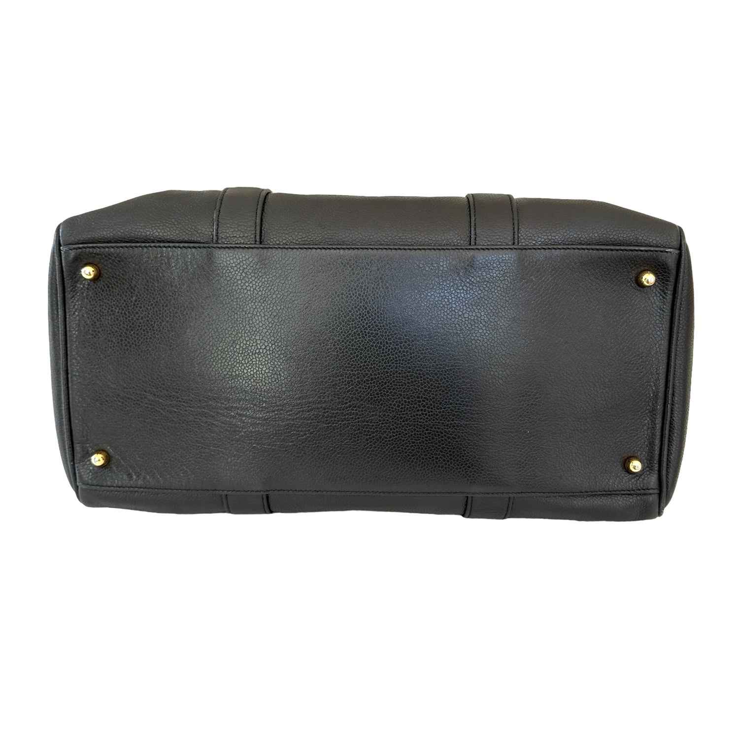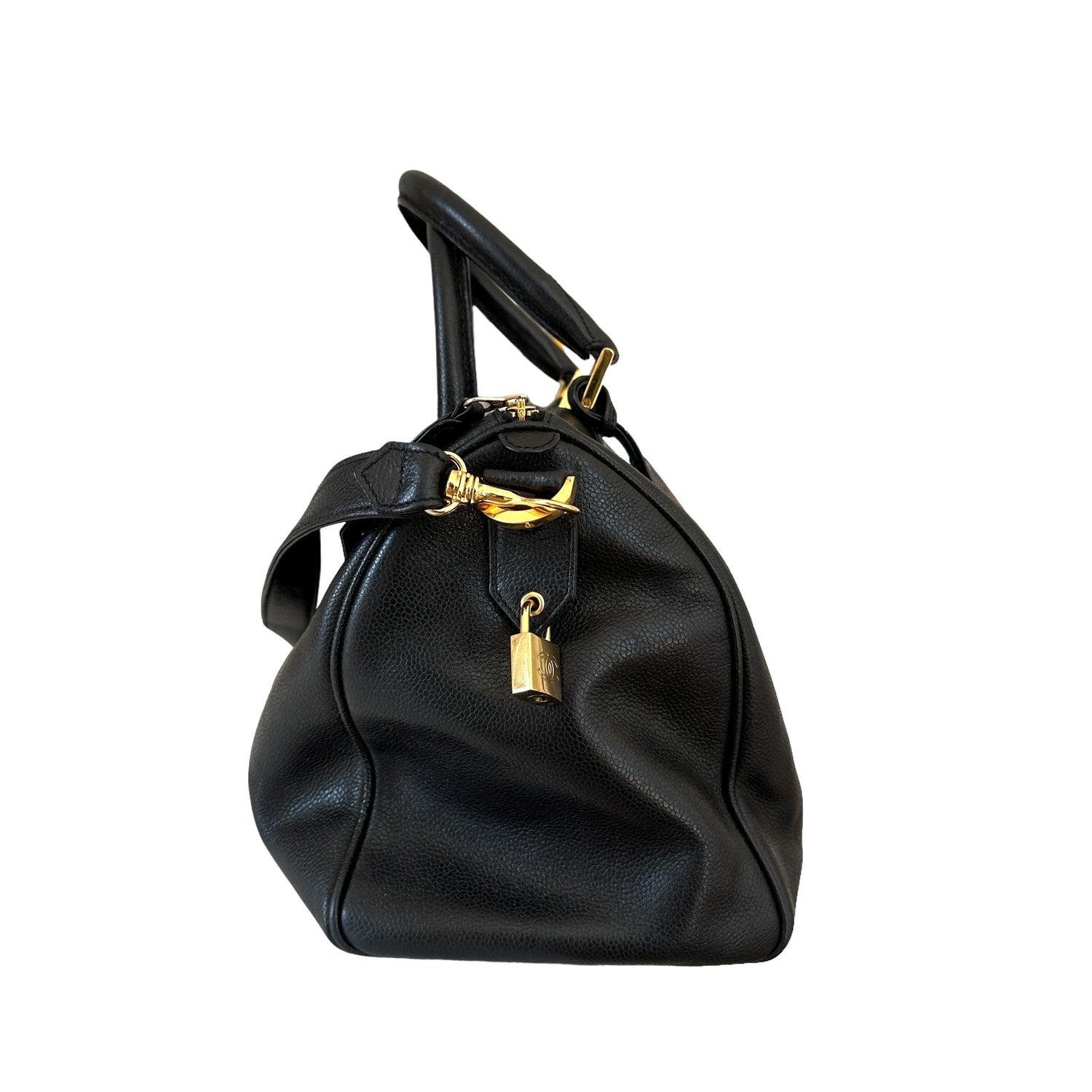 Chanel black caviar boston bag. 35cm. Removable crossbody strap. CC gold tone tag. Clochette, keys and lock. Zipper closure at top. Double rolled handles.