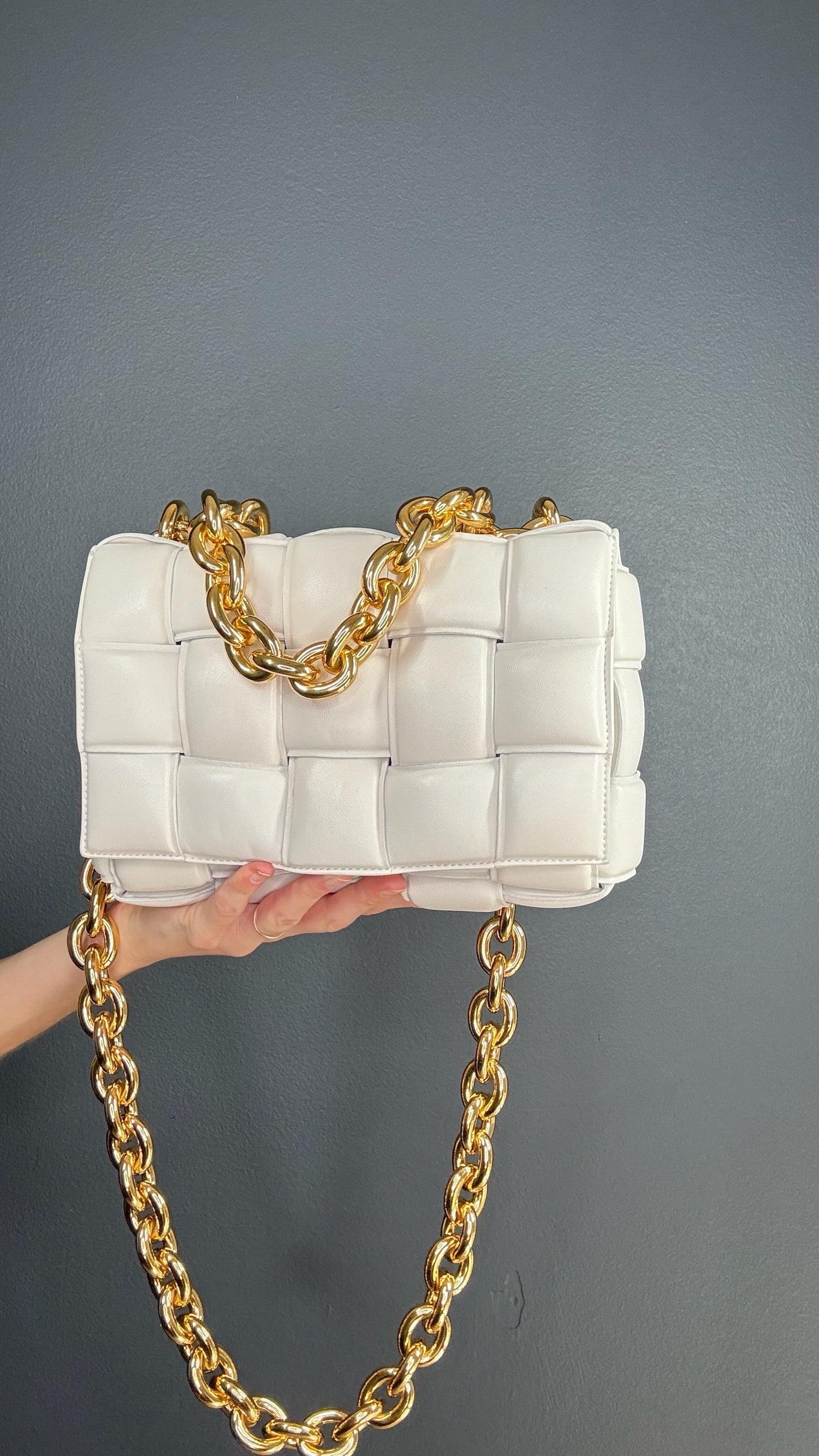 This exquisite Bottega Veneta shoulder bag showcases a sophisticated quilted pattern in a pristine white hue, complemented by a striking gold chain strap. The luxurious combination of colors and textures makes it a standout accessory for any elegant occasion.