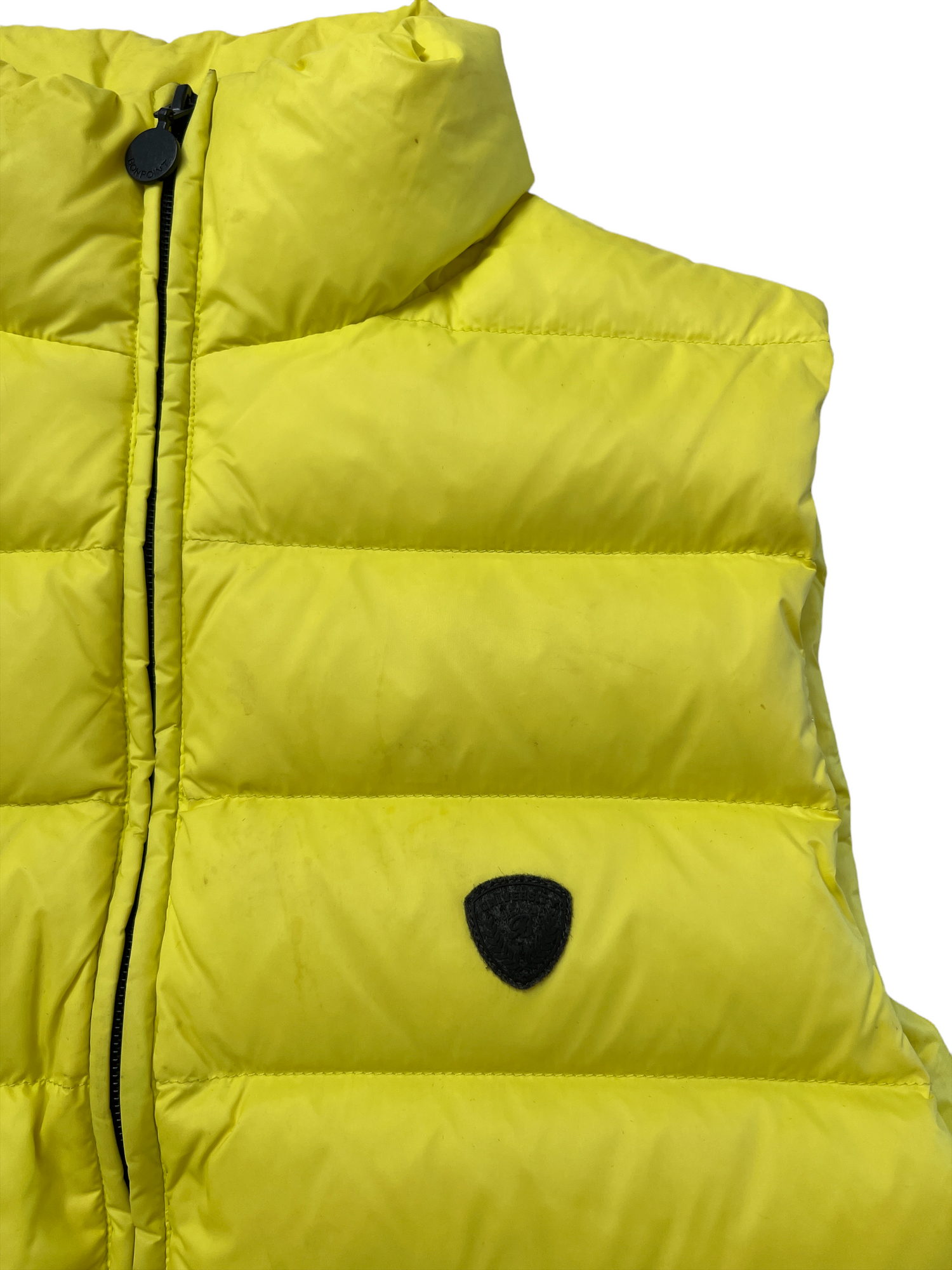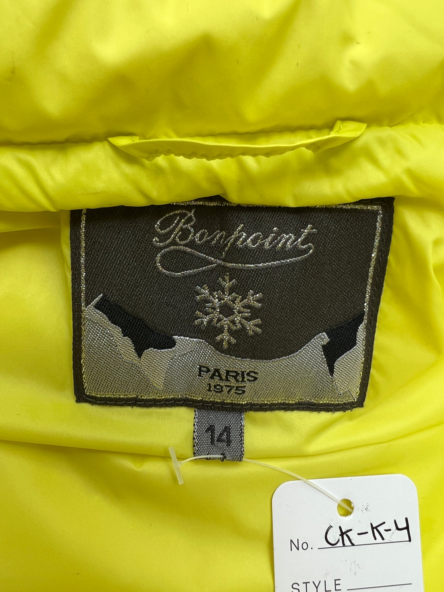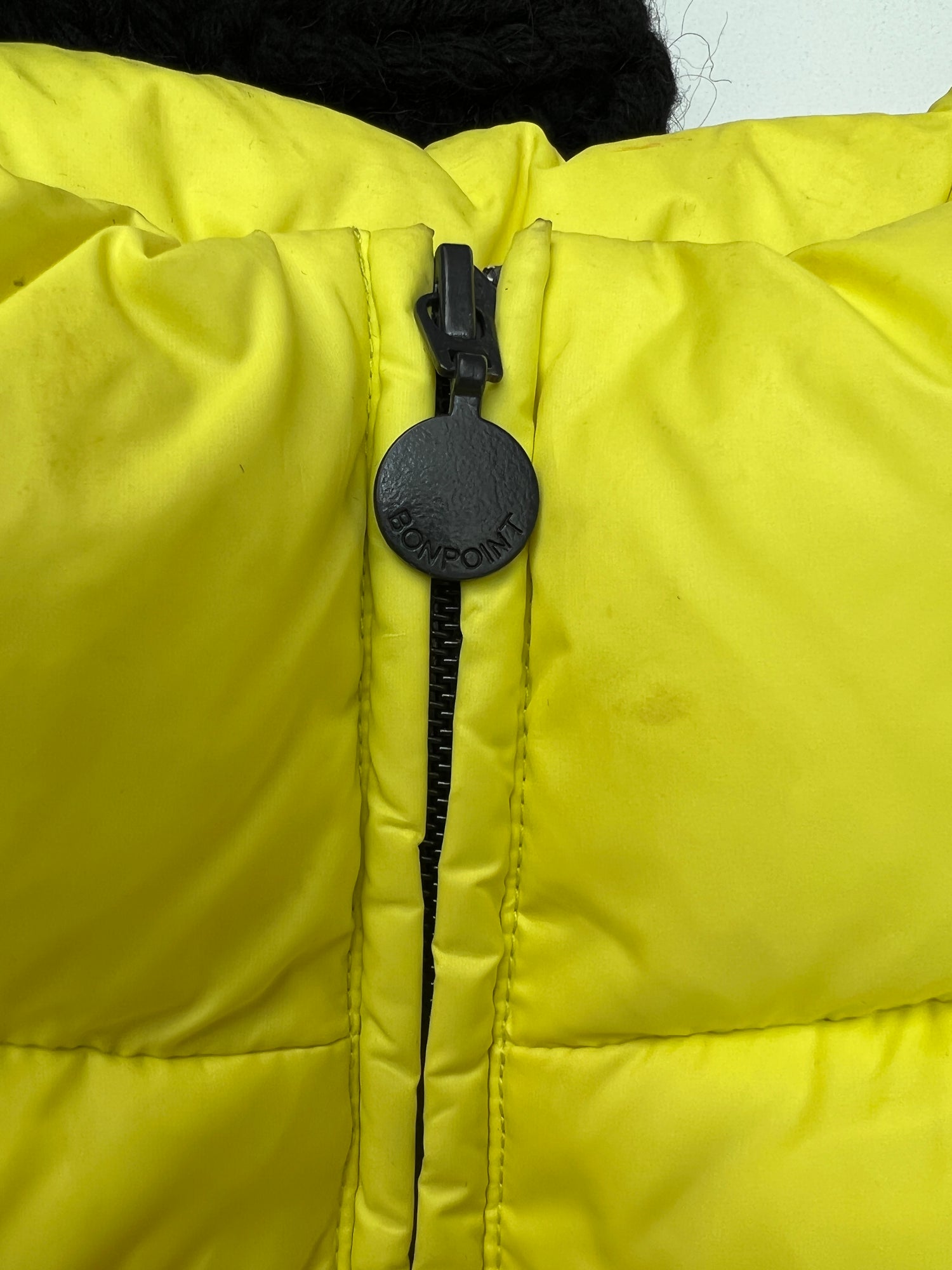 Neon Yellow puffer vest for boys or girls from Bonpoint. Size 12 years old. 80% Down / 20% Feather Filling. 100% Polyamide Shell.