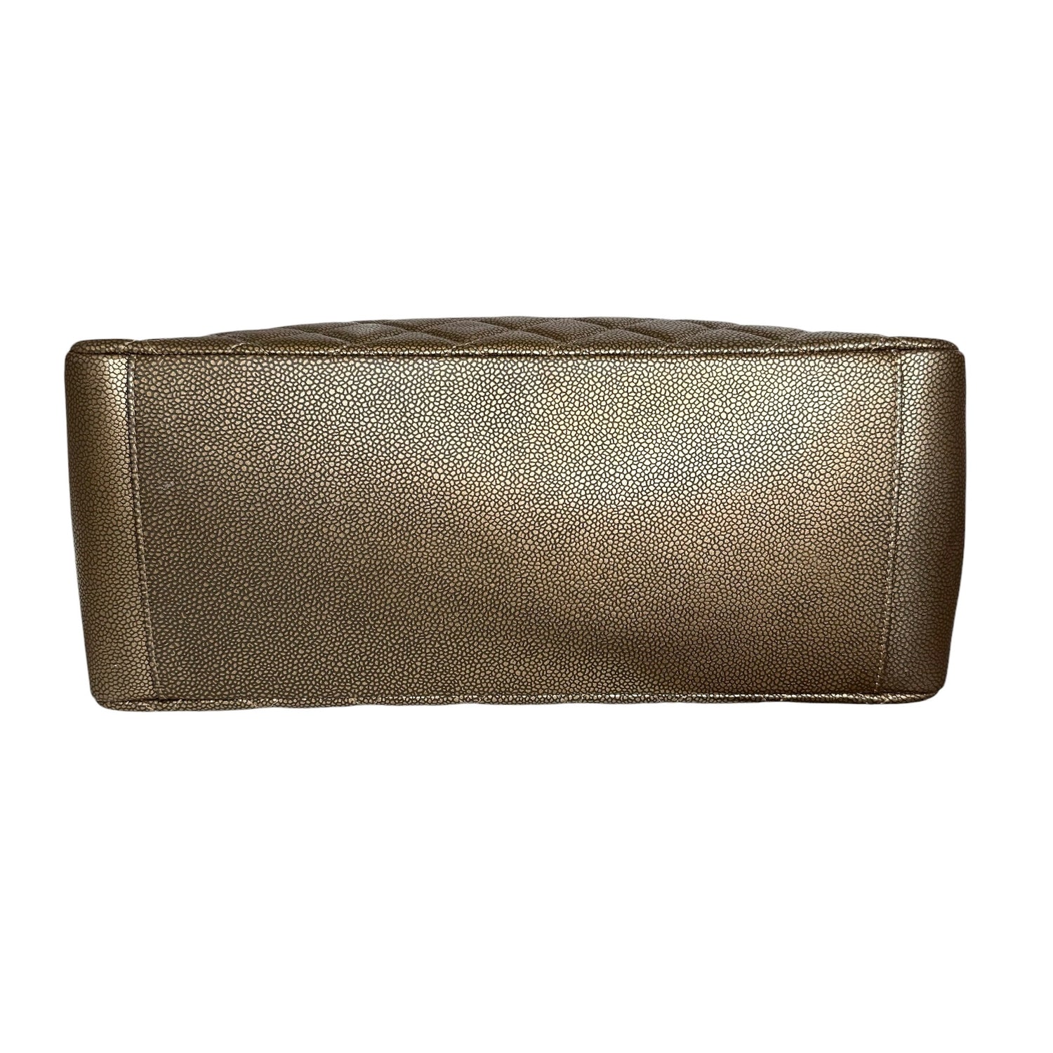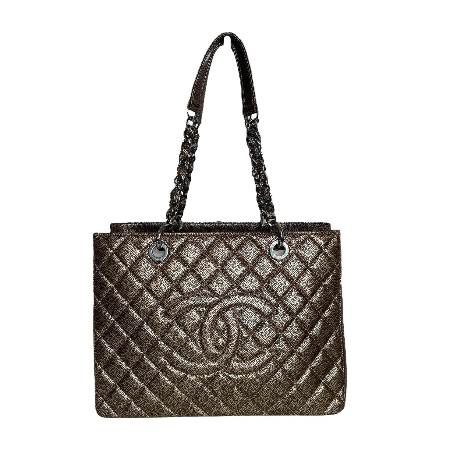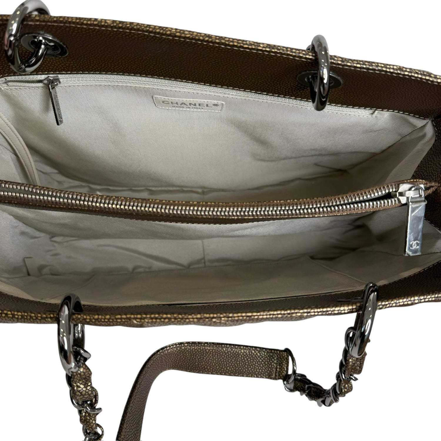 Chanel bronze caviar Grand Shopping tote. Silver hardware. Double compartment at interior. Two interior zipper pocket. Cream grosgrain lining.