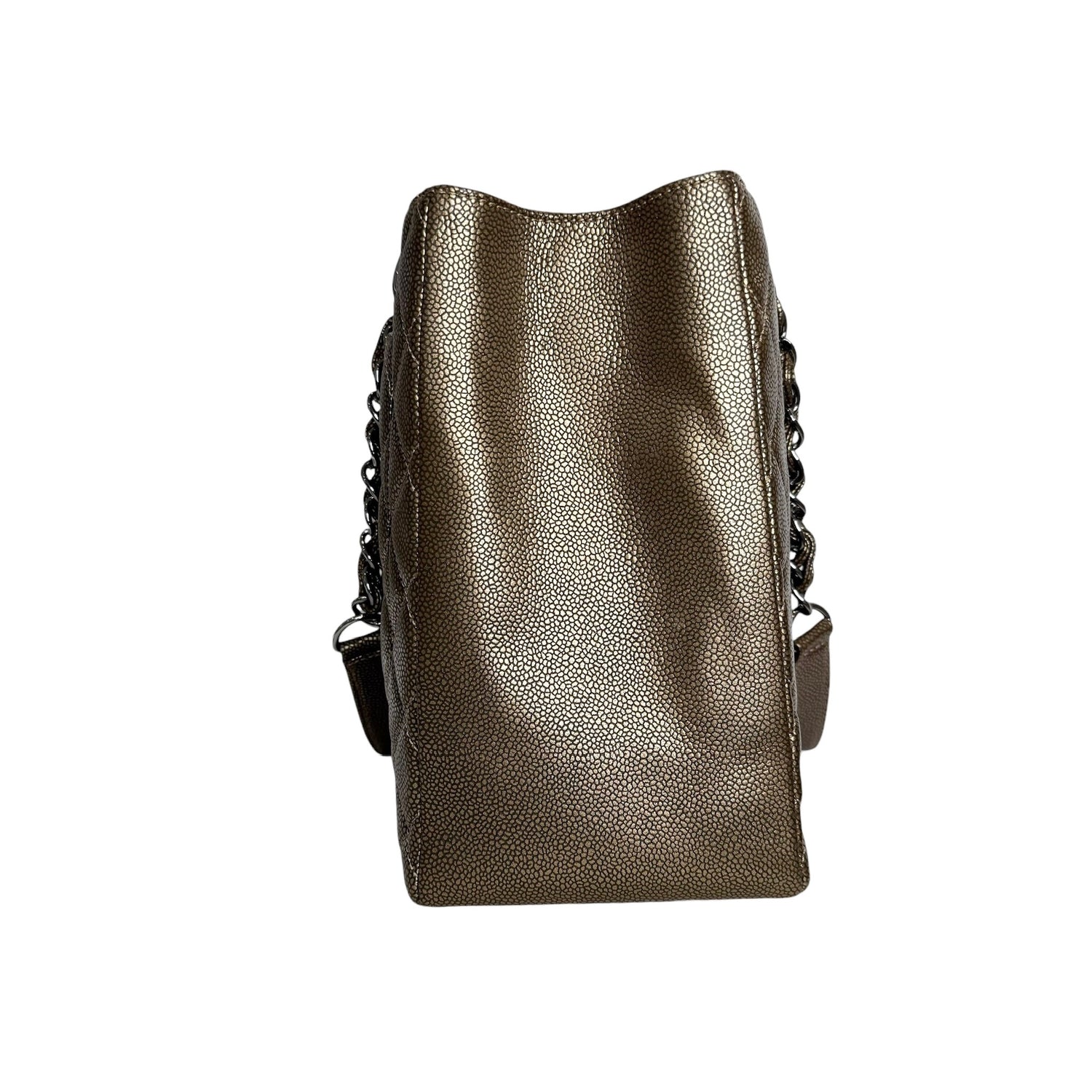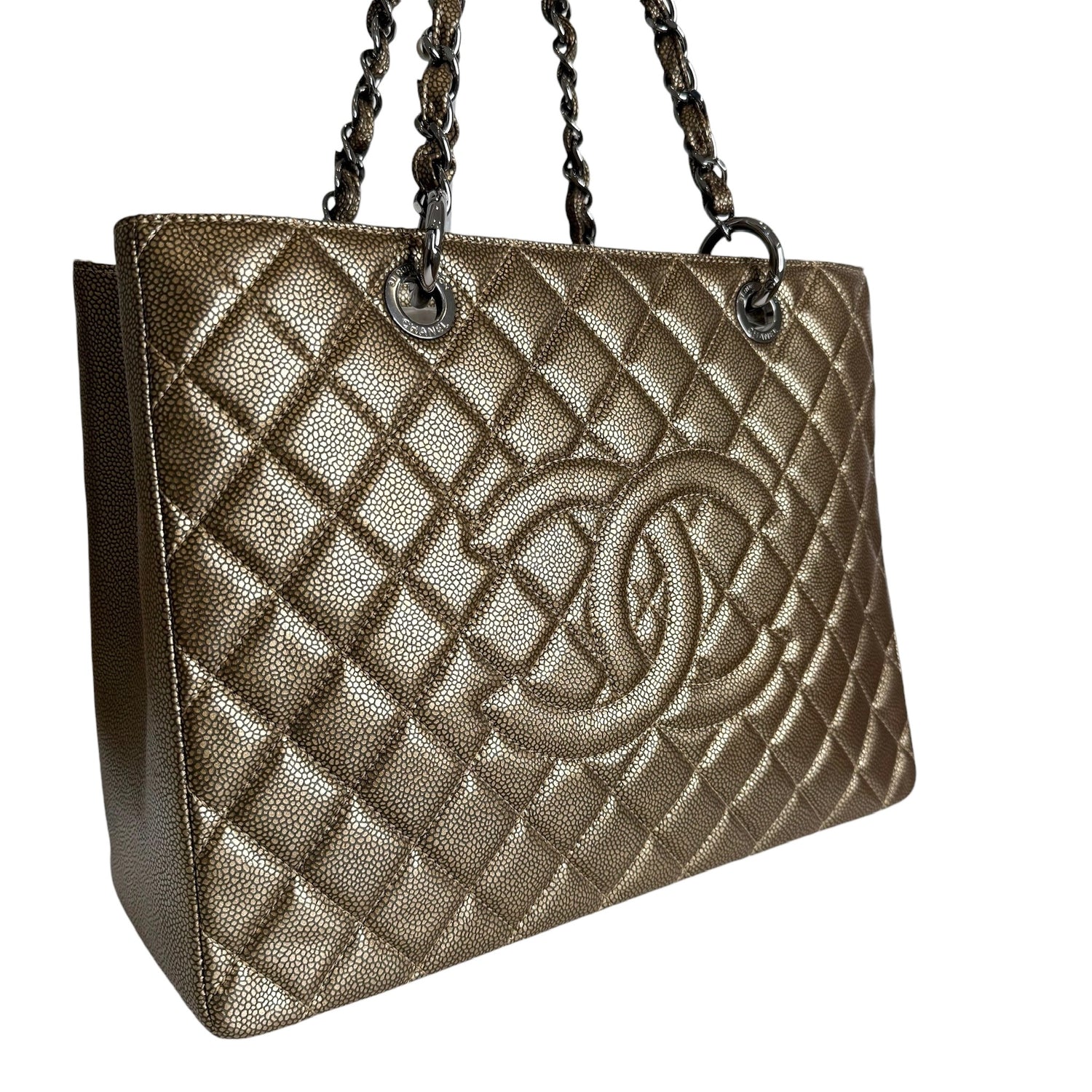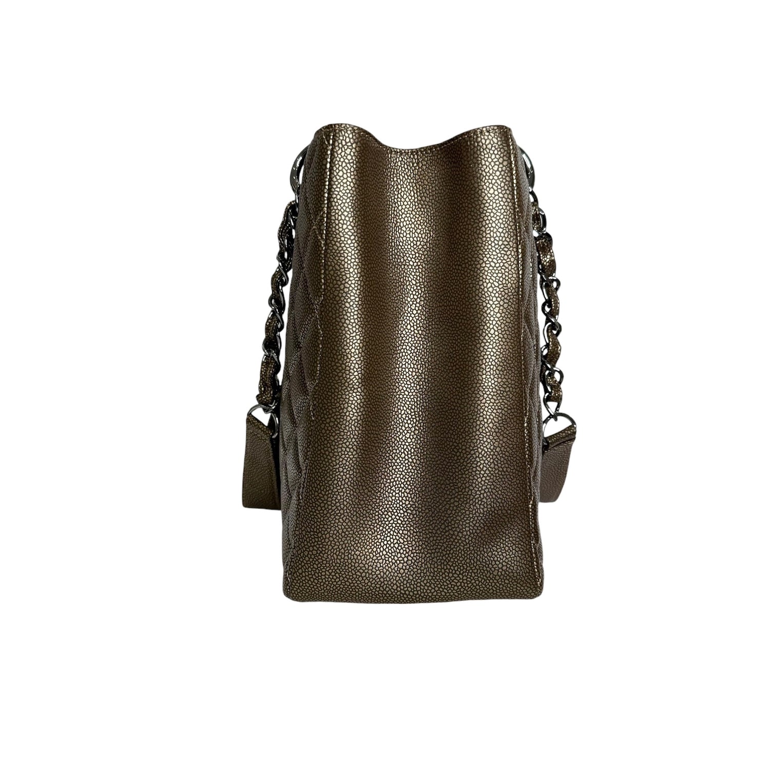 Chanel bronze caviar Grand Shopping tote. Silver hardware. Double compartment at interior. Two interior zipper pocket. Cream grosgrain lining.