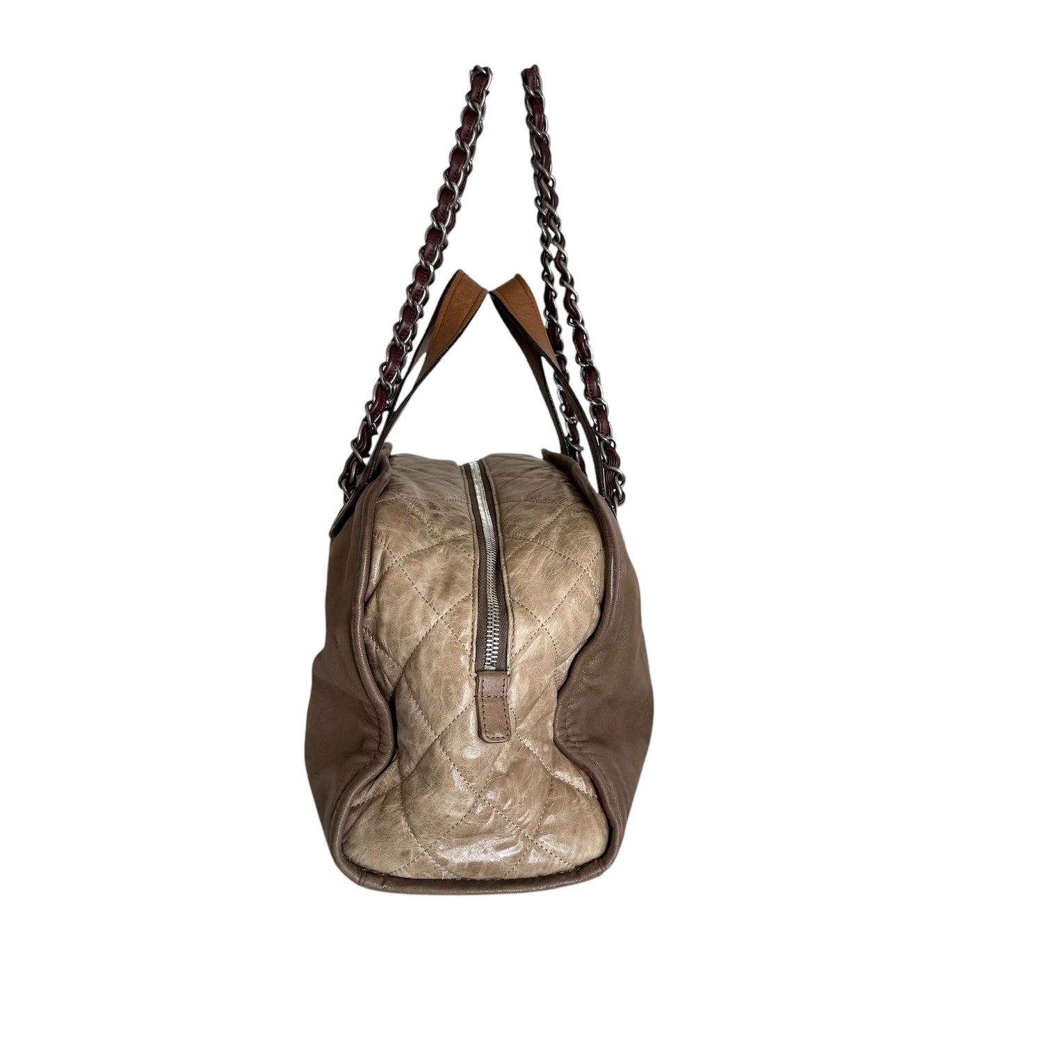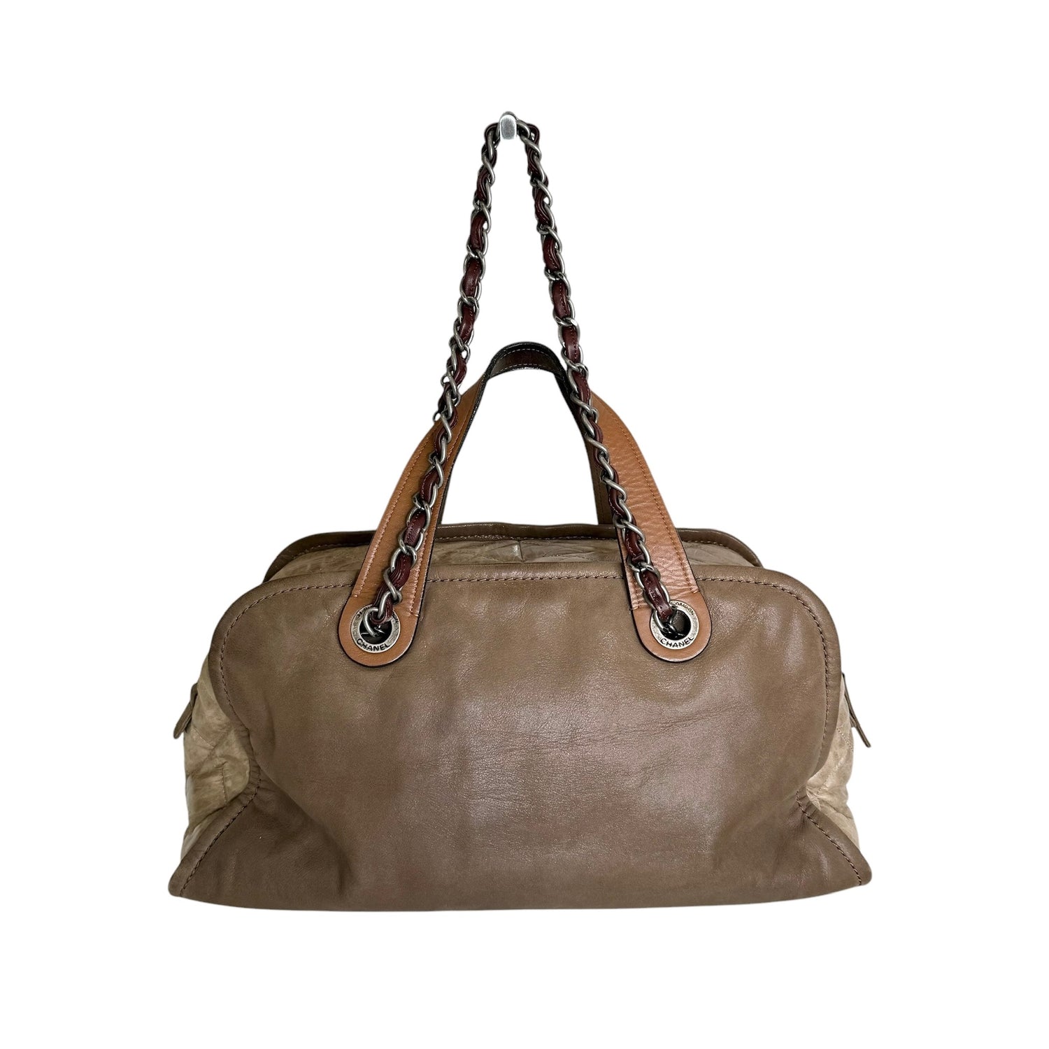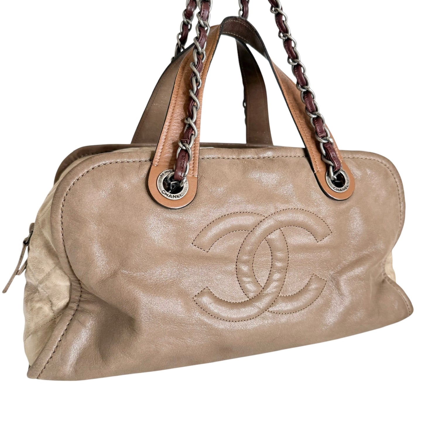 Chanel beige and taupe lambskin bowler bag. Brown leather handles. Dark brown and chain straps. Brushed gunmetal hardware. Zipper closure at top. Bordeaux cotton canvas lining. One interior pocket.