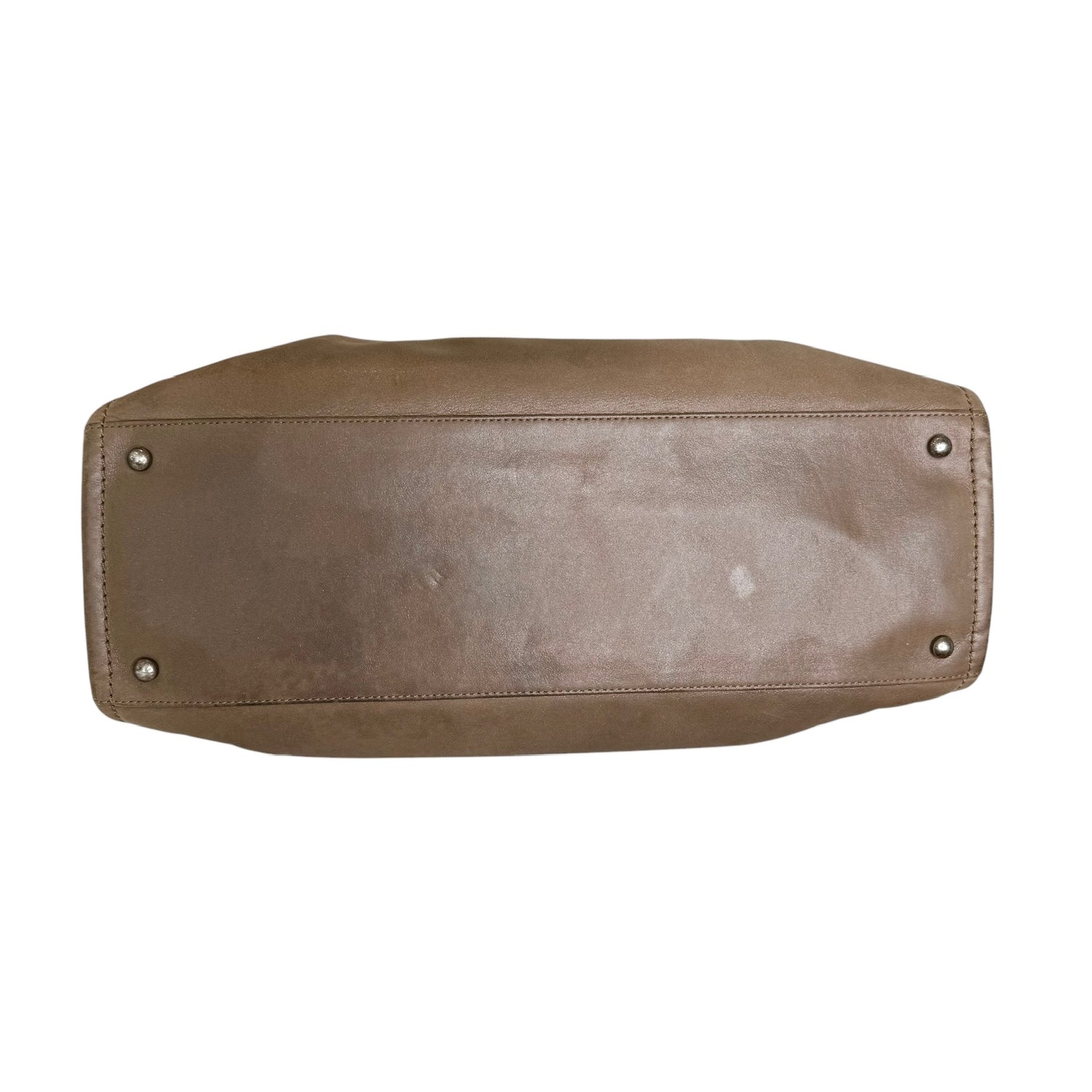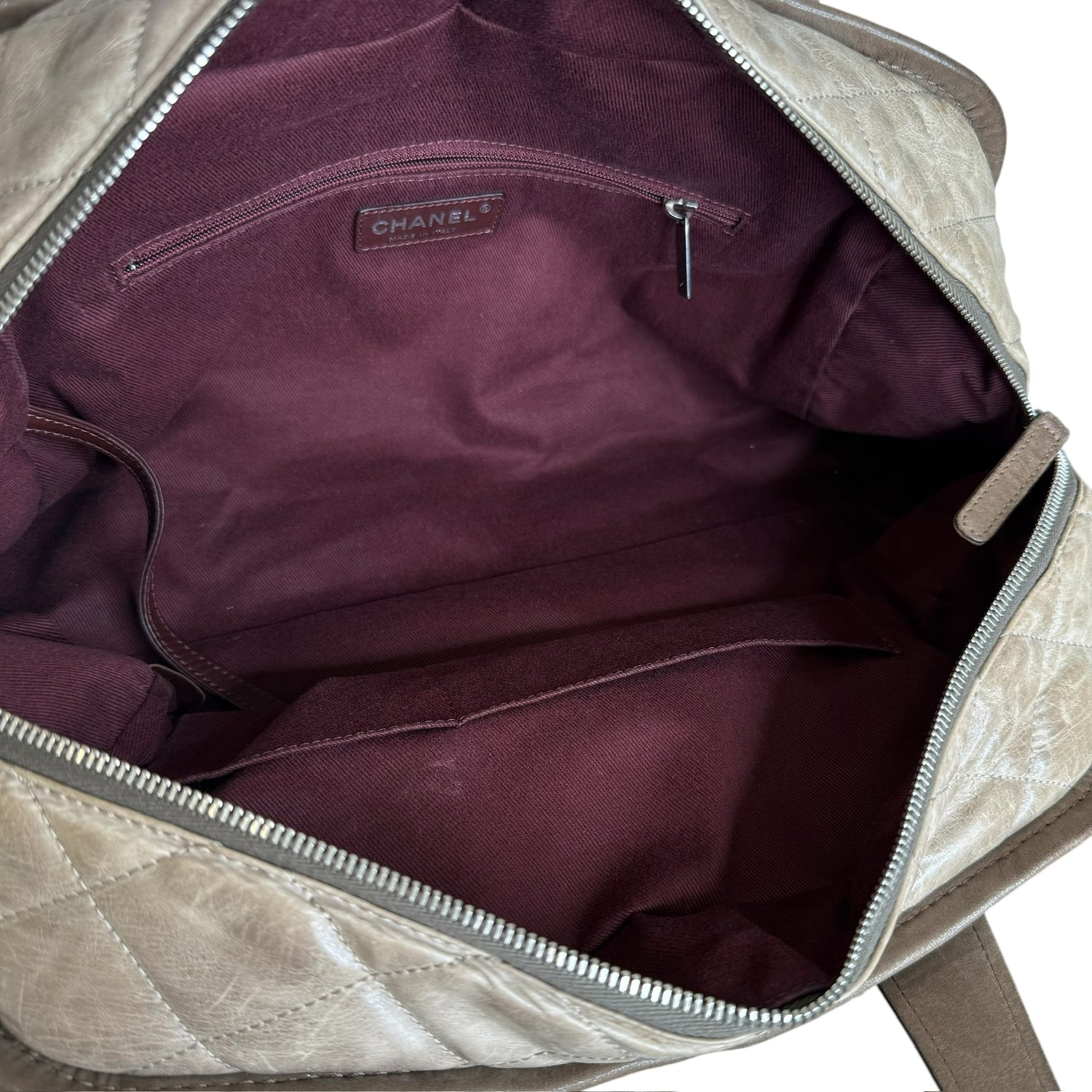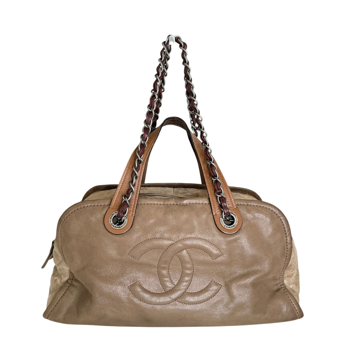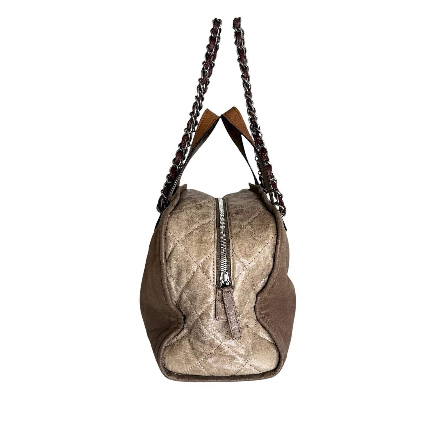 Chanel beige and taupe lambskin bowler bag. Brown leather handles. Dark brown and chain straps. Brushed gunmetal hardware. Zipper closure at top. Bordeaux cotton canvas lining. One interior pocket.