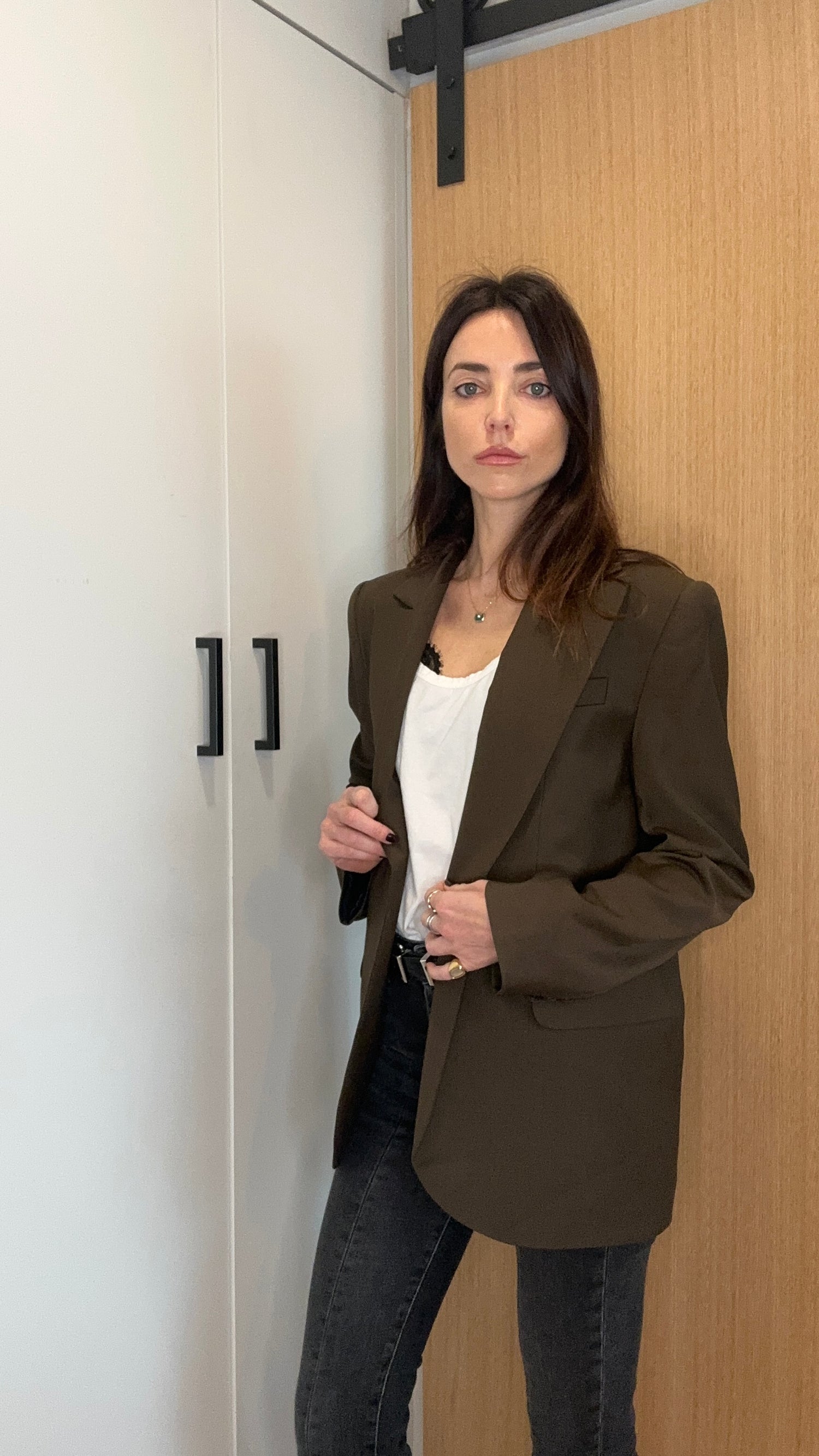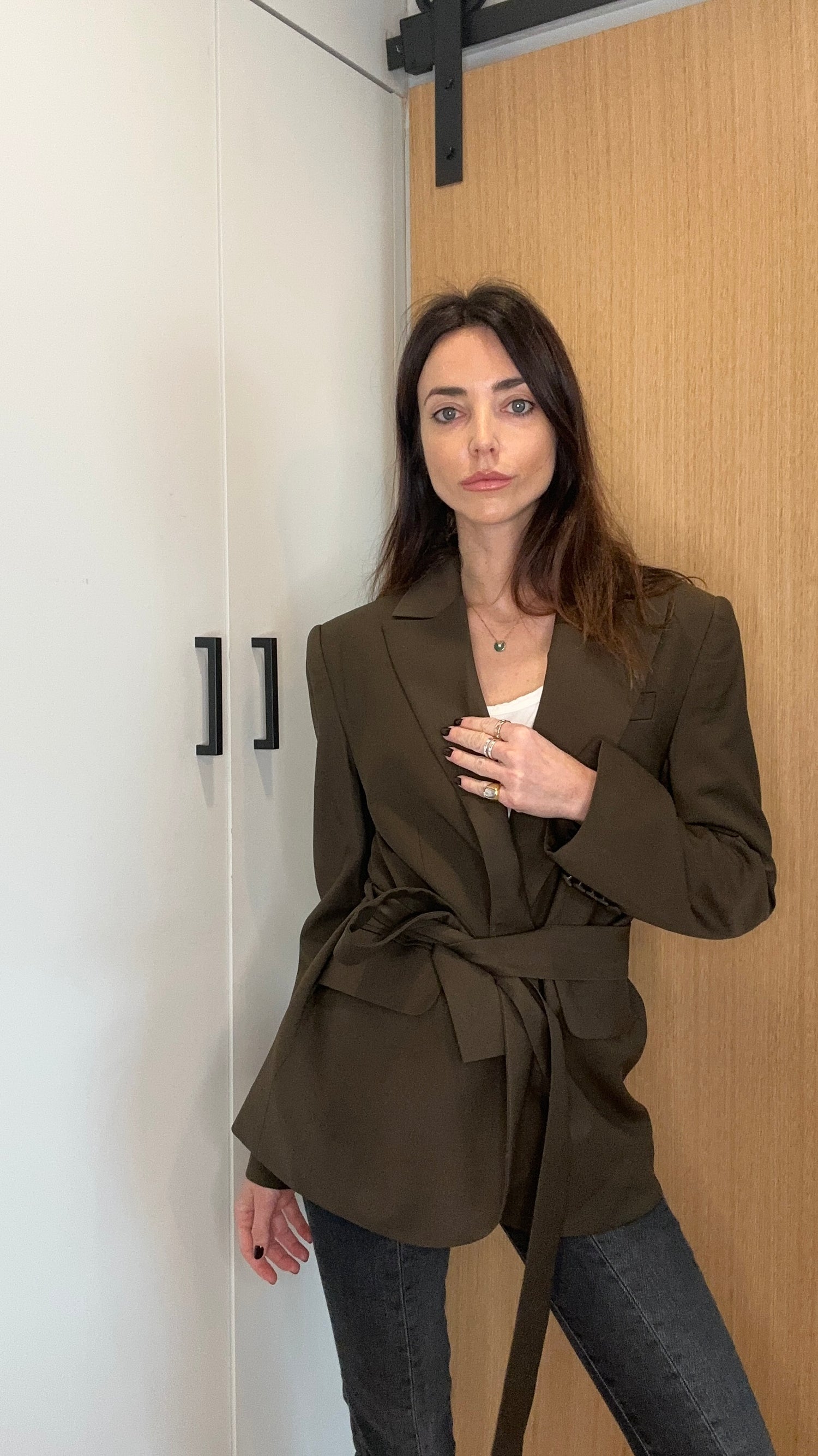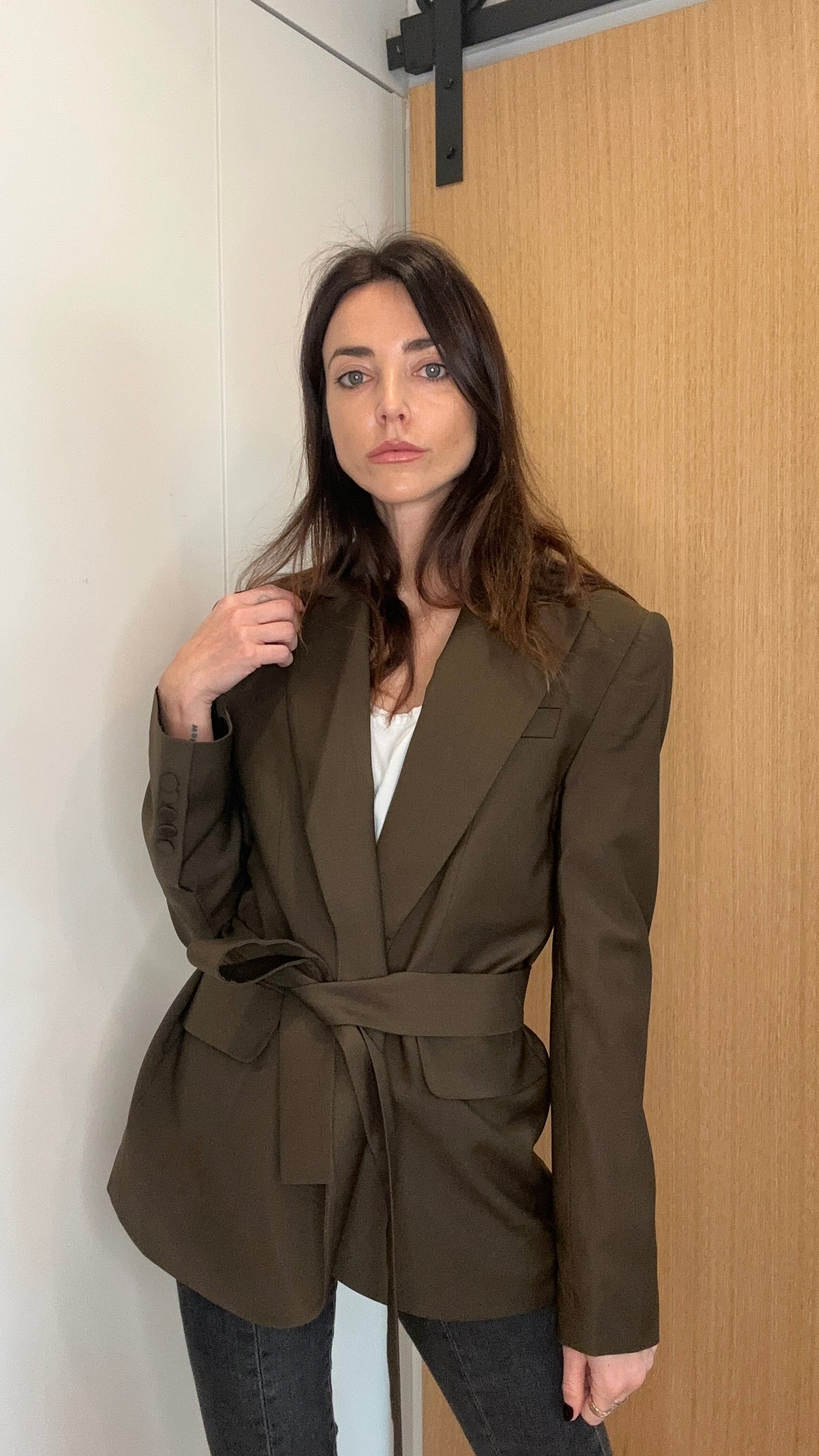 Aya Muse brown blazer. Slightly oversized. Pointed collar. Open front with tie at waste. Designer size medium.