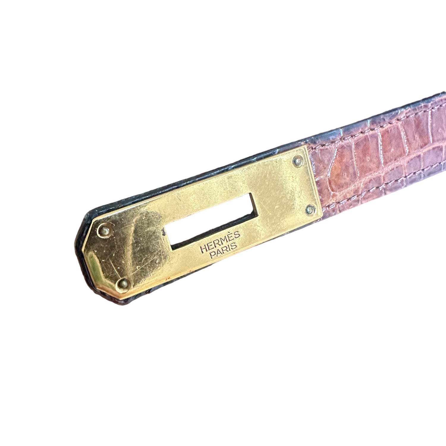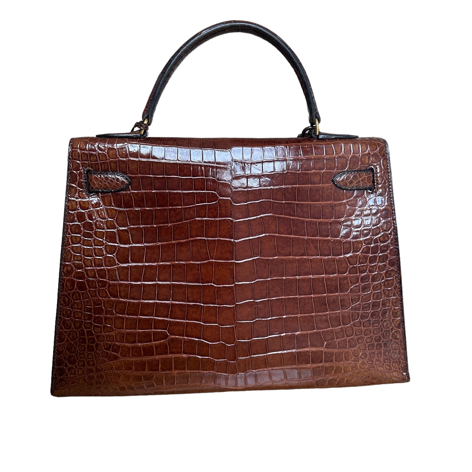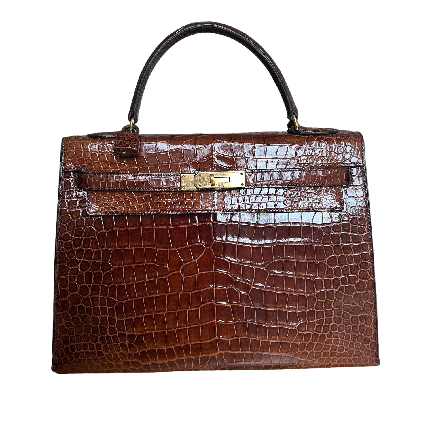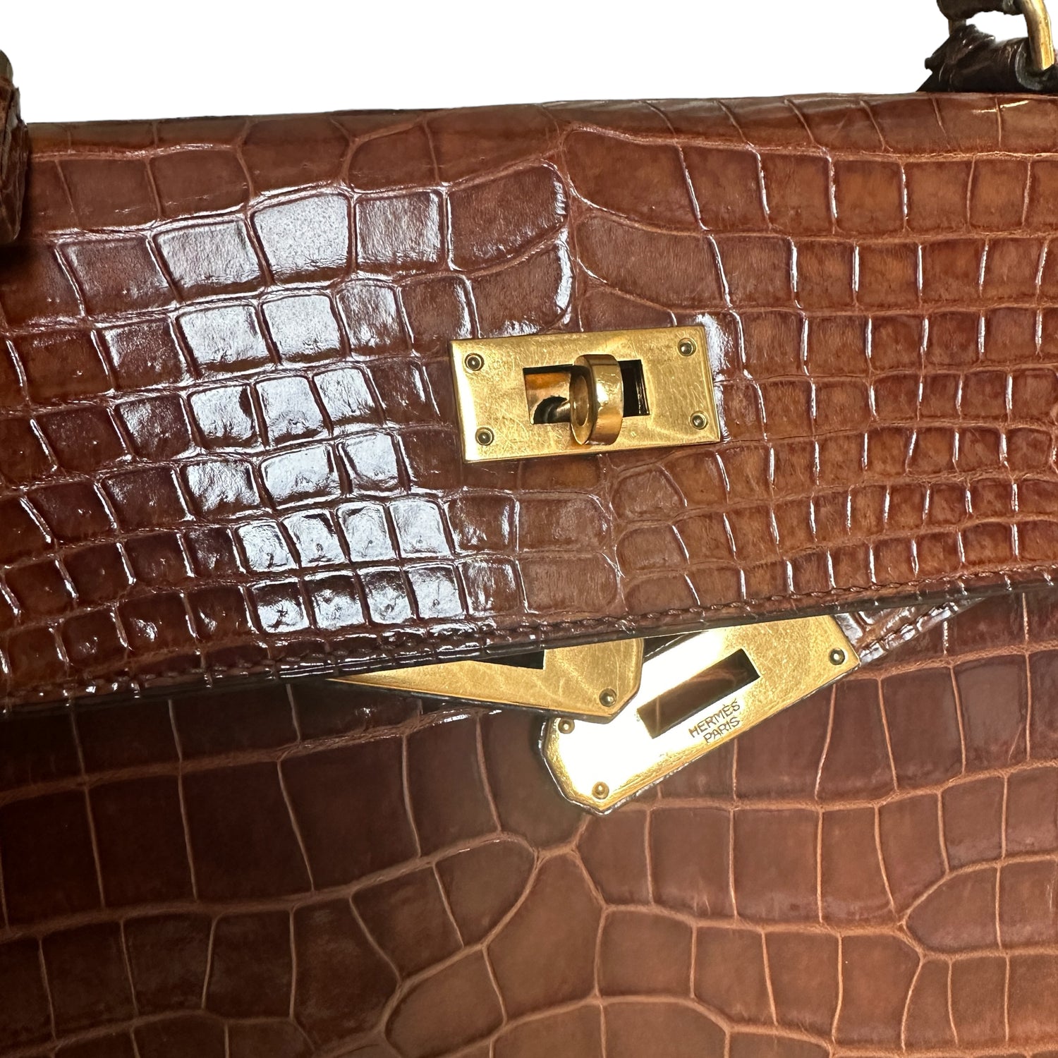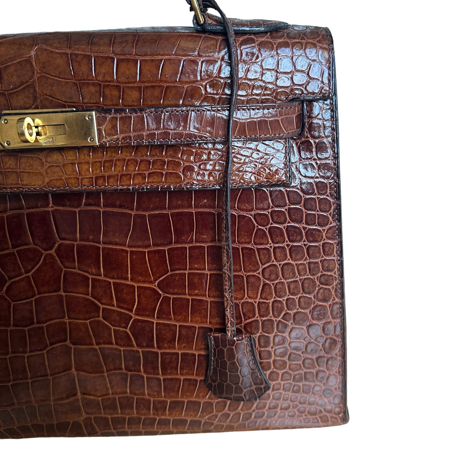 Hermes Kelly 32 handbag. Brown shiny crocodile leather. Gold hardware. Special order sport strap with brown crocodile and cotton. This bag is in excellent vintage condition. It is a true gem which was acquired by a collector in 1972 in Megeve while vacationing away from New-York. It remained in her private collection until today and we are excited to make it available to you.