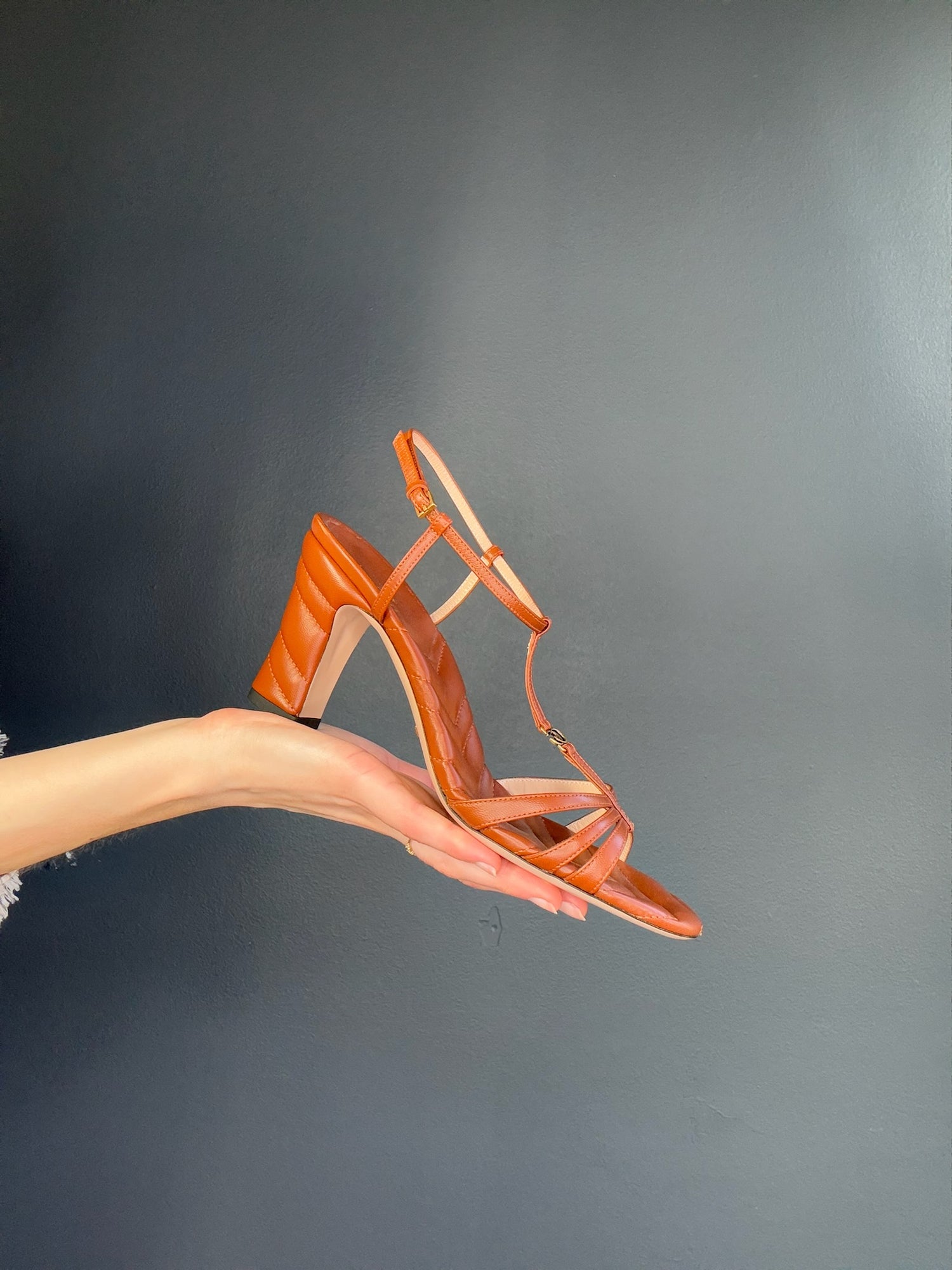 Gucci brown quilted leather heeled sandals w/ logo at front strap. Designer size 39.5