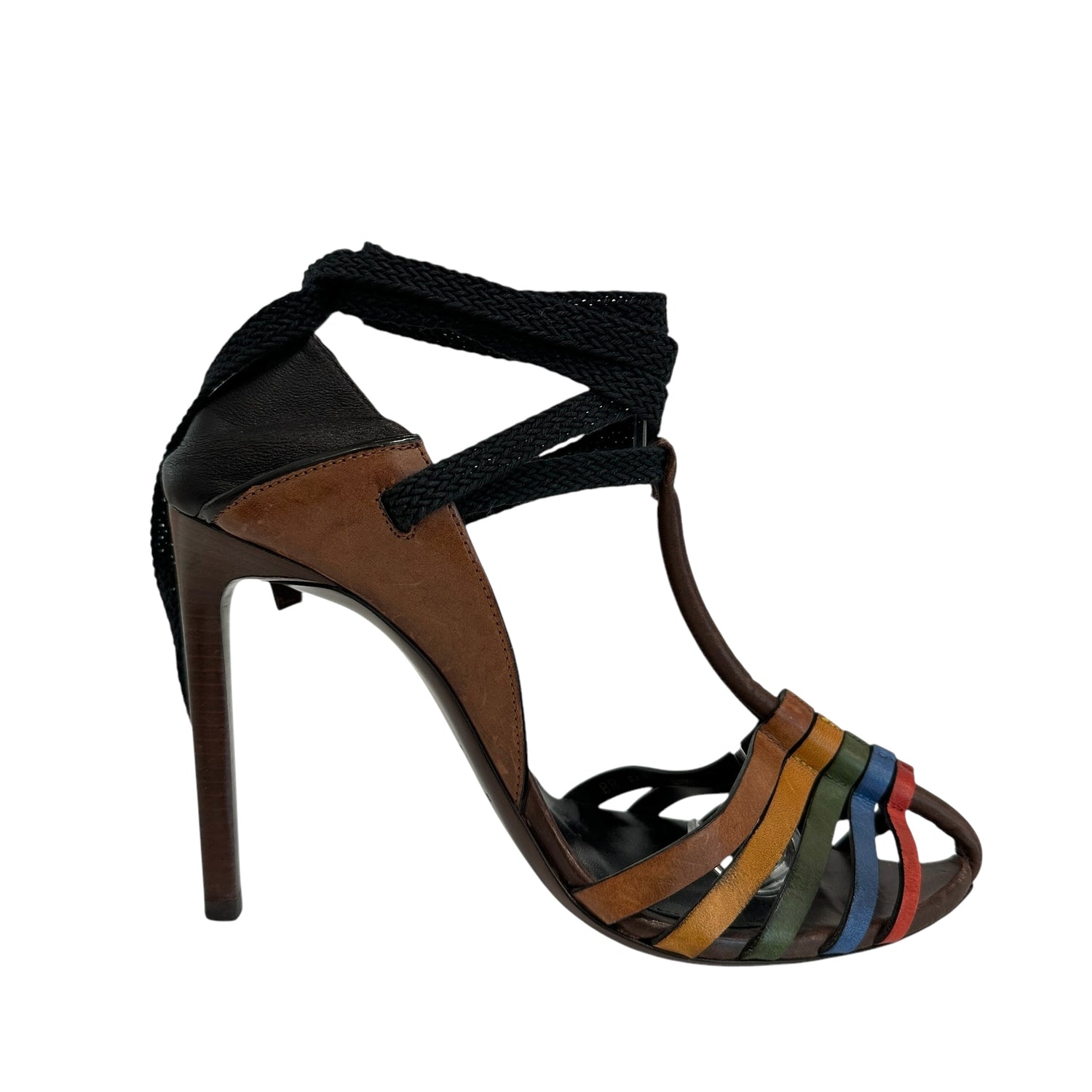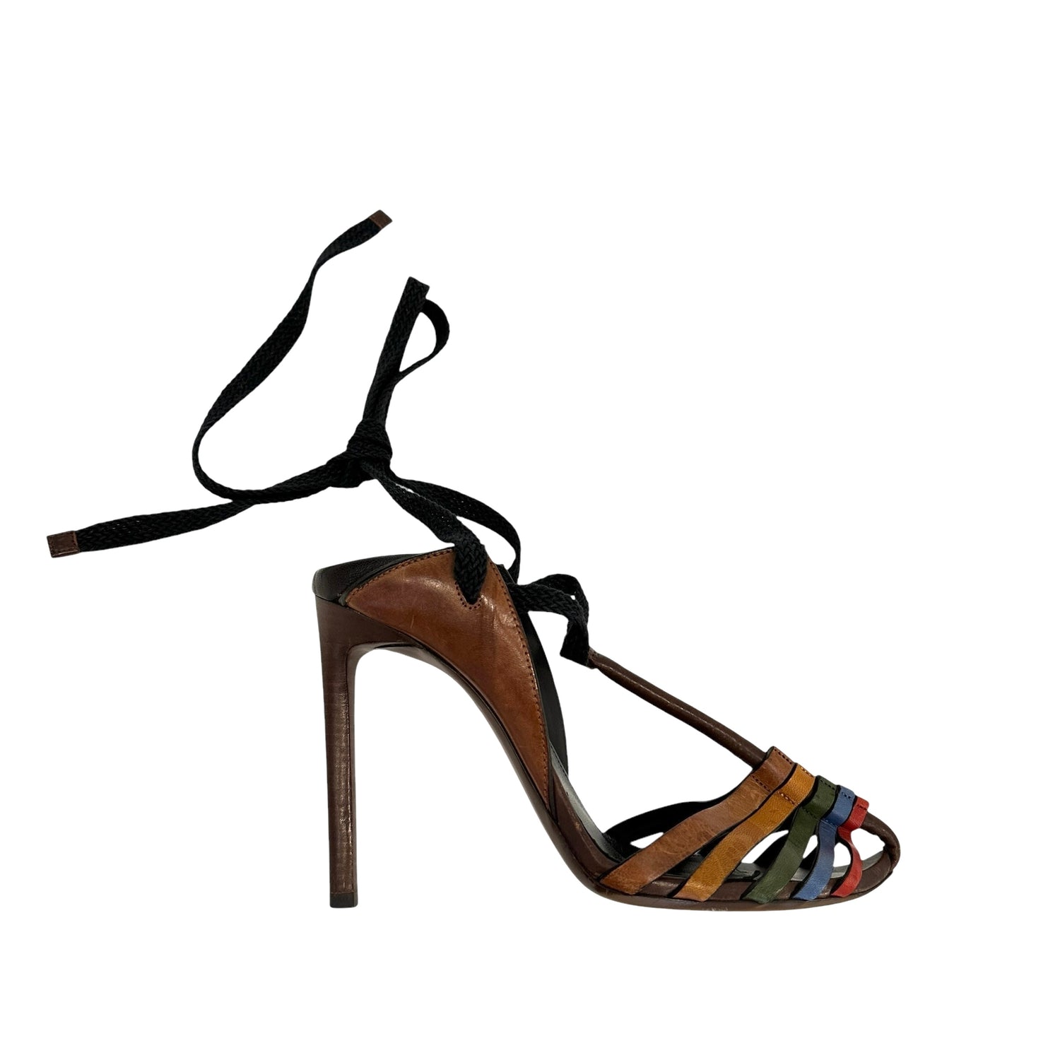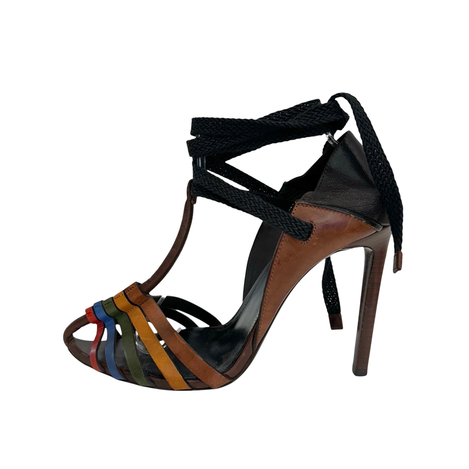 Saint Laurent brown leather heels. Multicolor leather straps on top. Ankle tie closure. These are be worn with the back on or off as mules. Designer size 39.