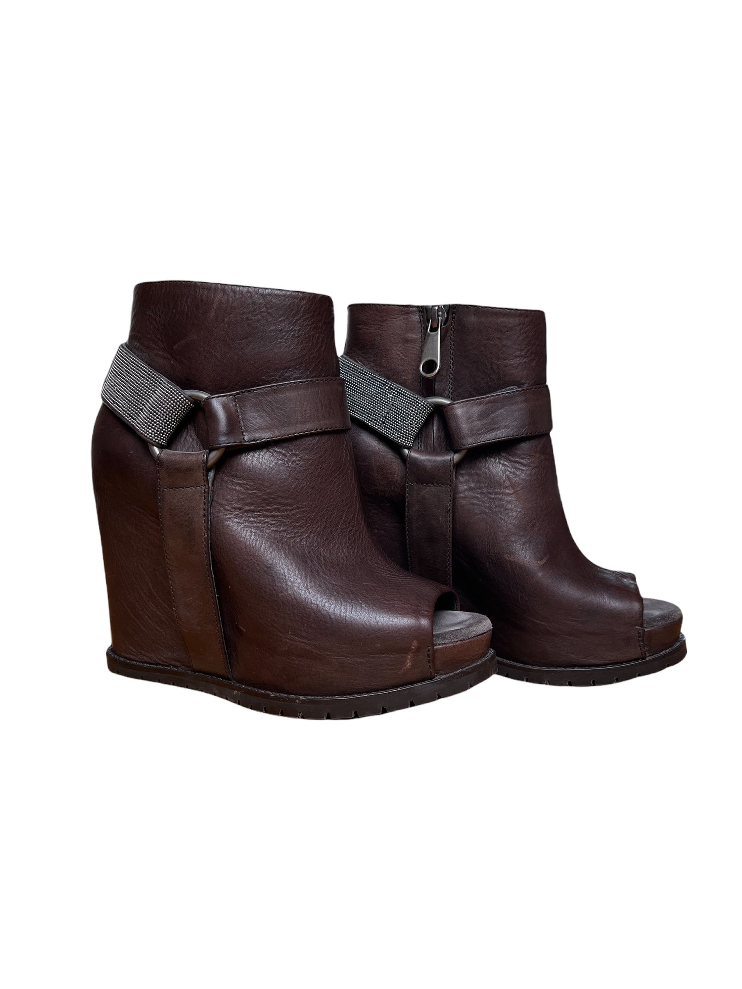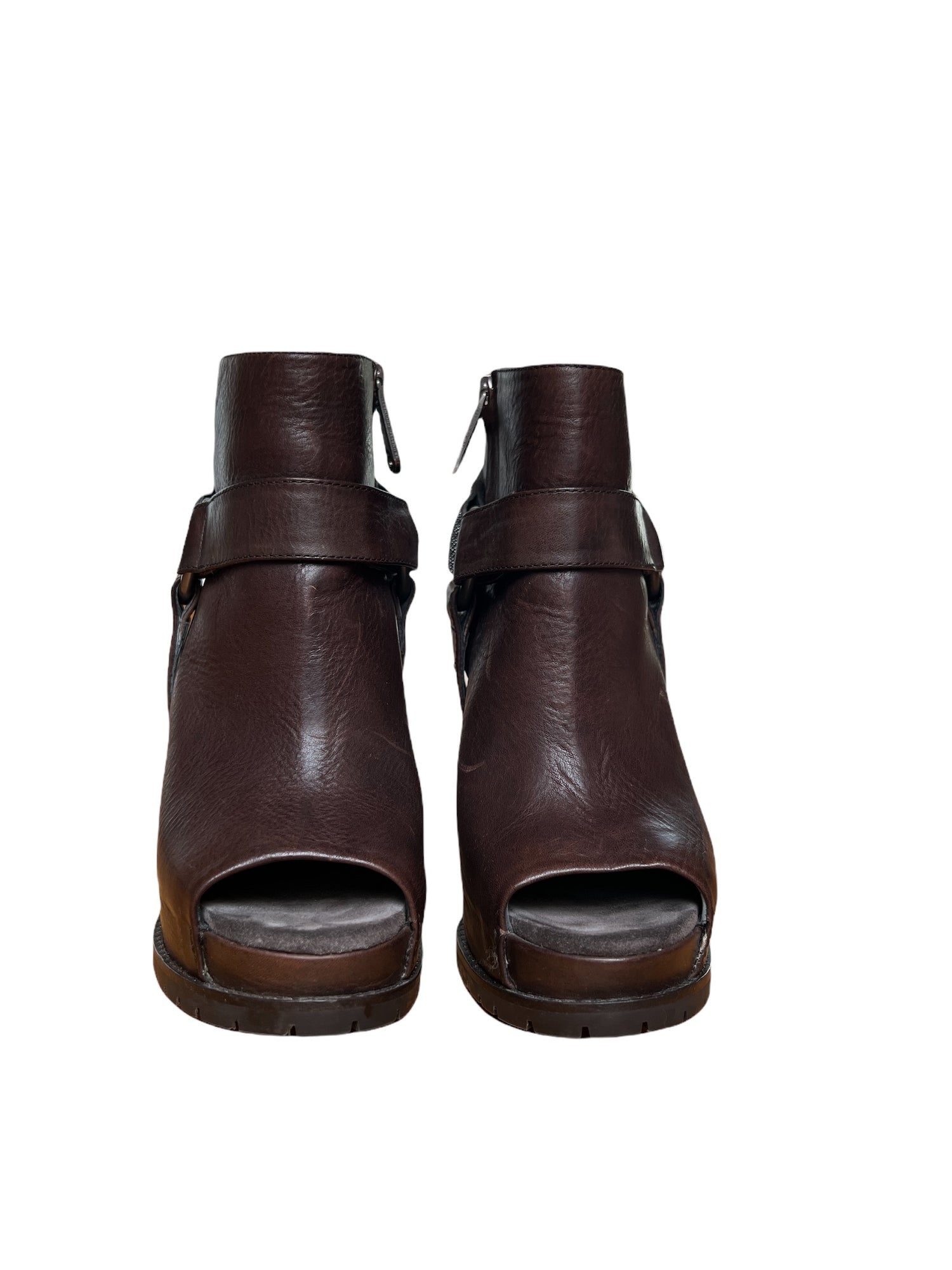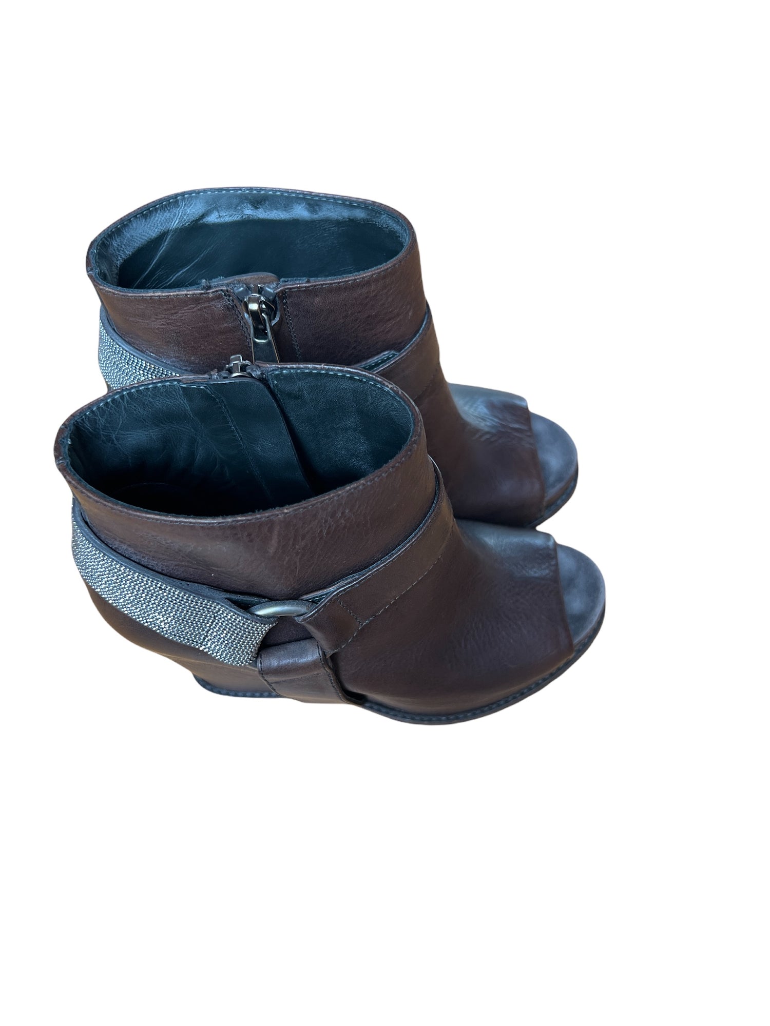 Brown Leather and Silver straps. Concealed zipper. Open Toe. Very comfortable as it is a platform heel. Size 36.