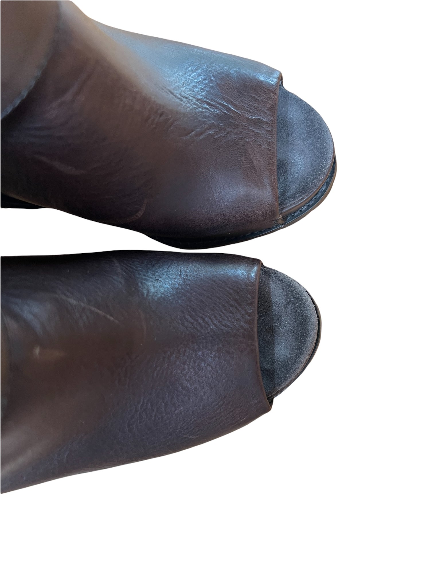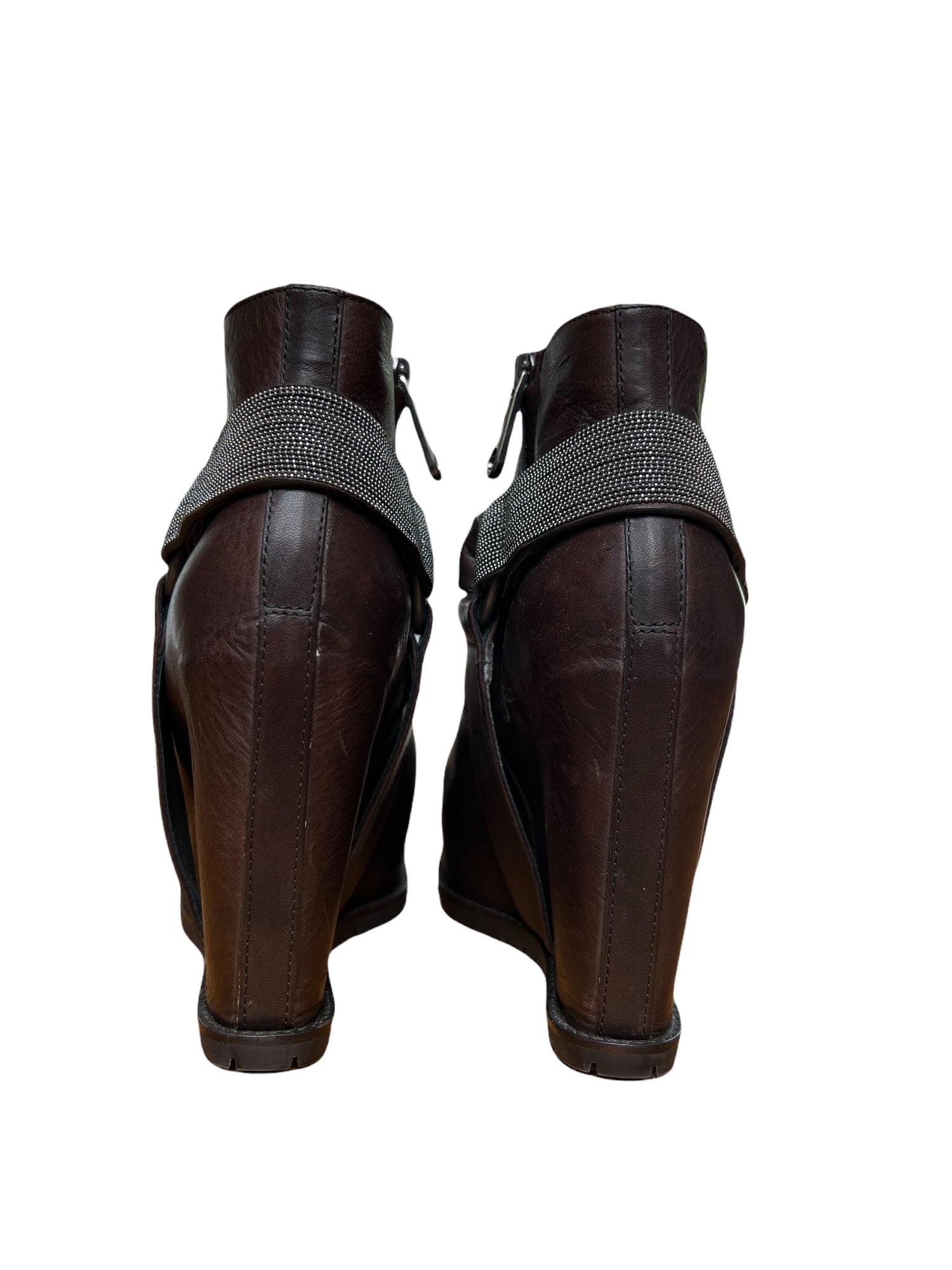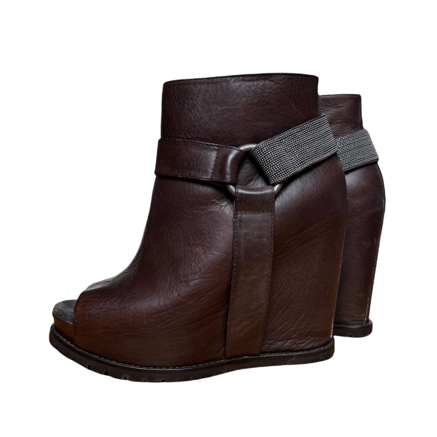 Brown Leather and Silver straps. Concealed zipper. Open Toe. Very comfortable as it is a platform heel. Size 36.