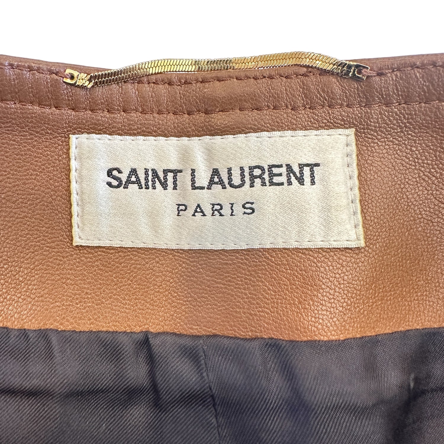 Saint Laurent mini shorts. Brown buttery leather. Button and zipper closure. Slit pockets at front. Designer size 38.