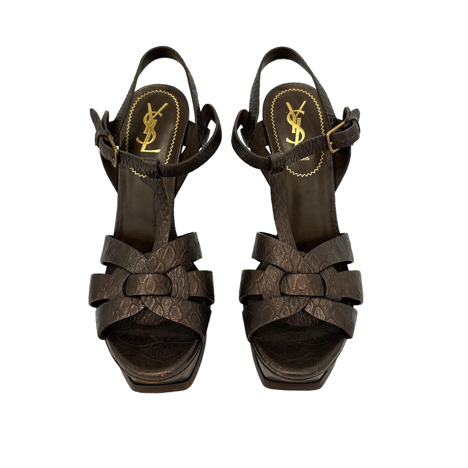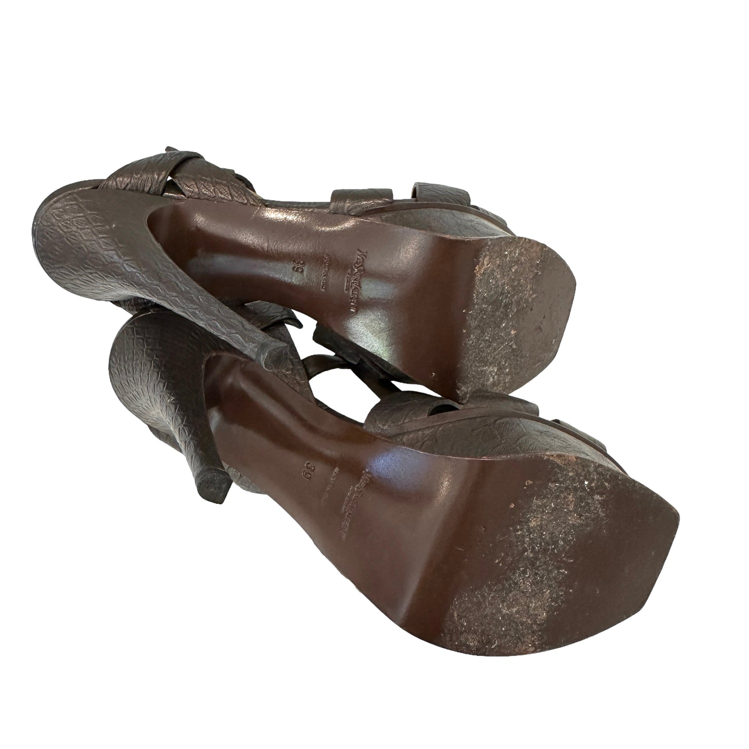 Saint Laurent Tribute heels. Platform heels for style and comfort. Brown embossed leather. Designer size 39.