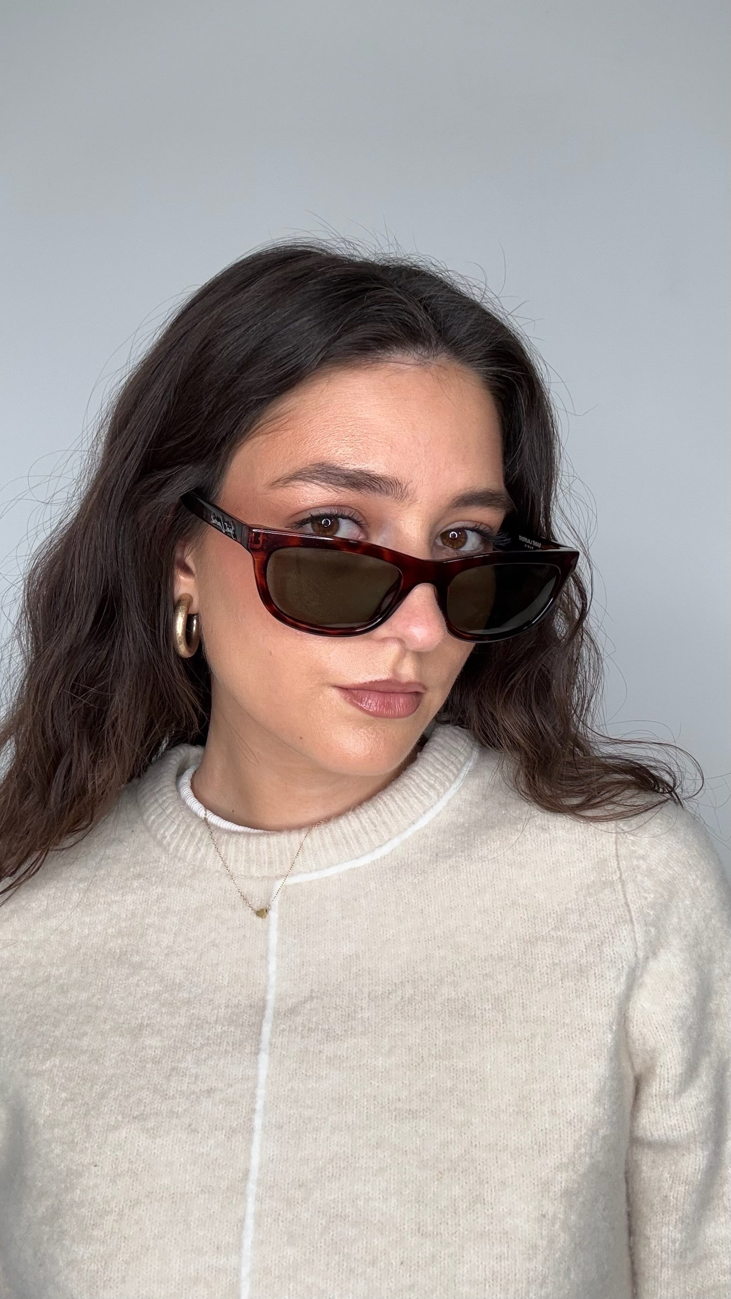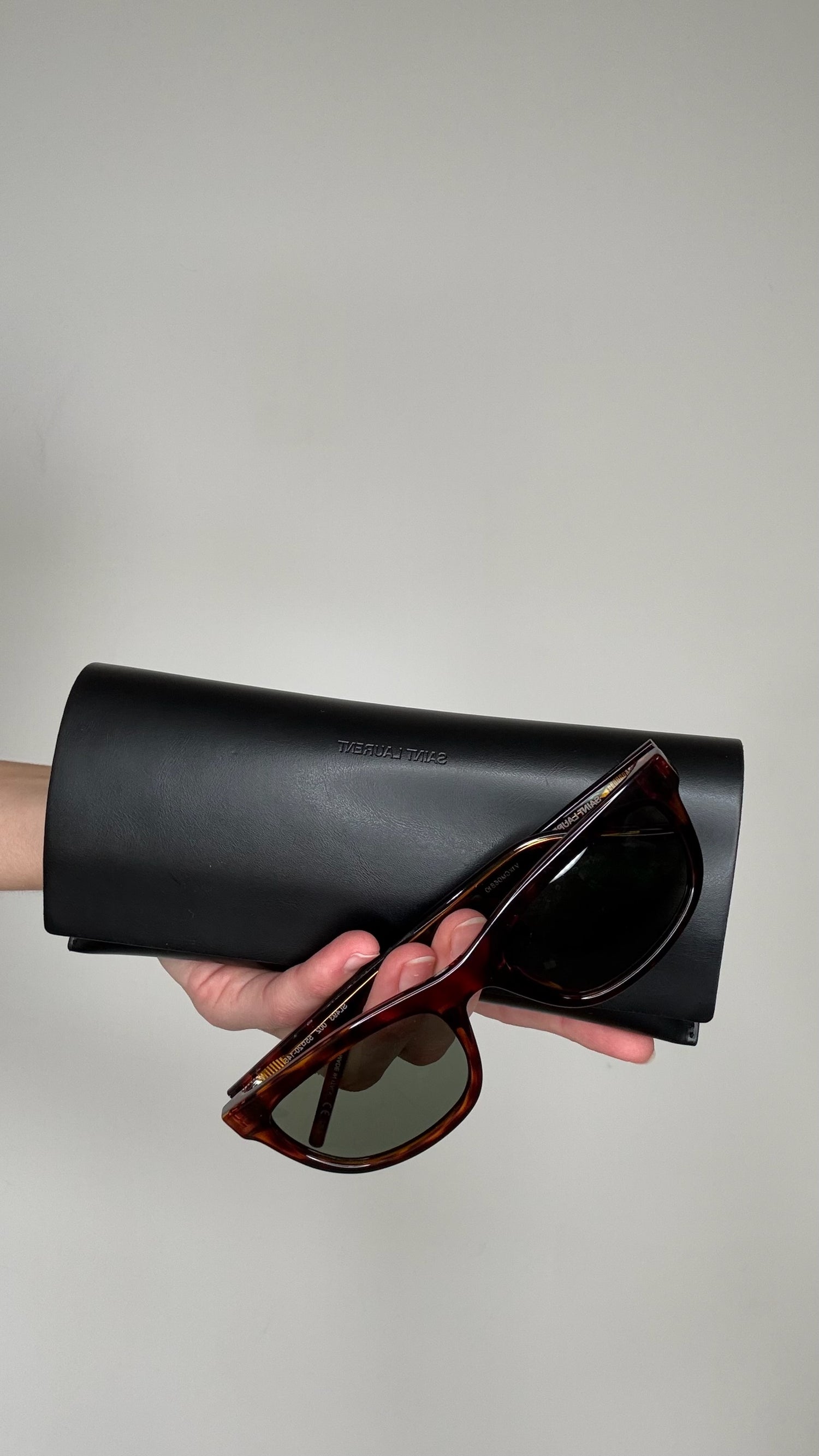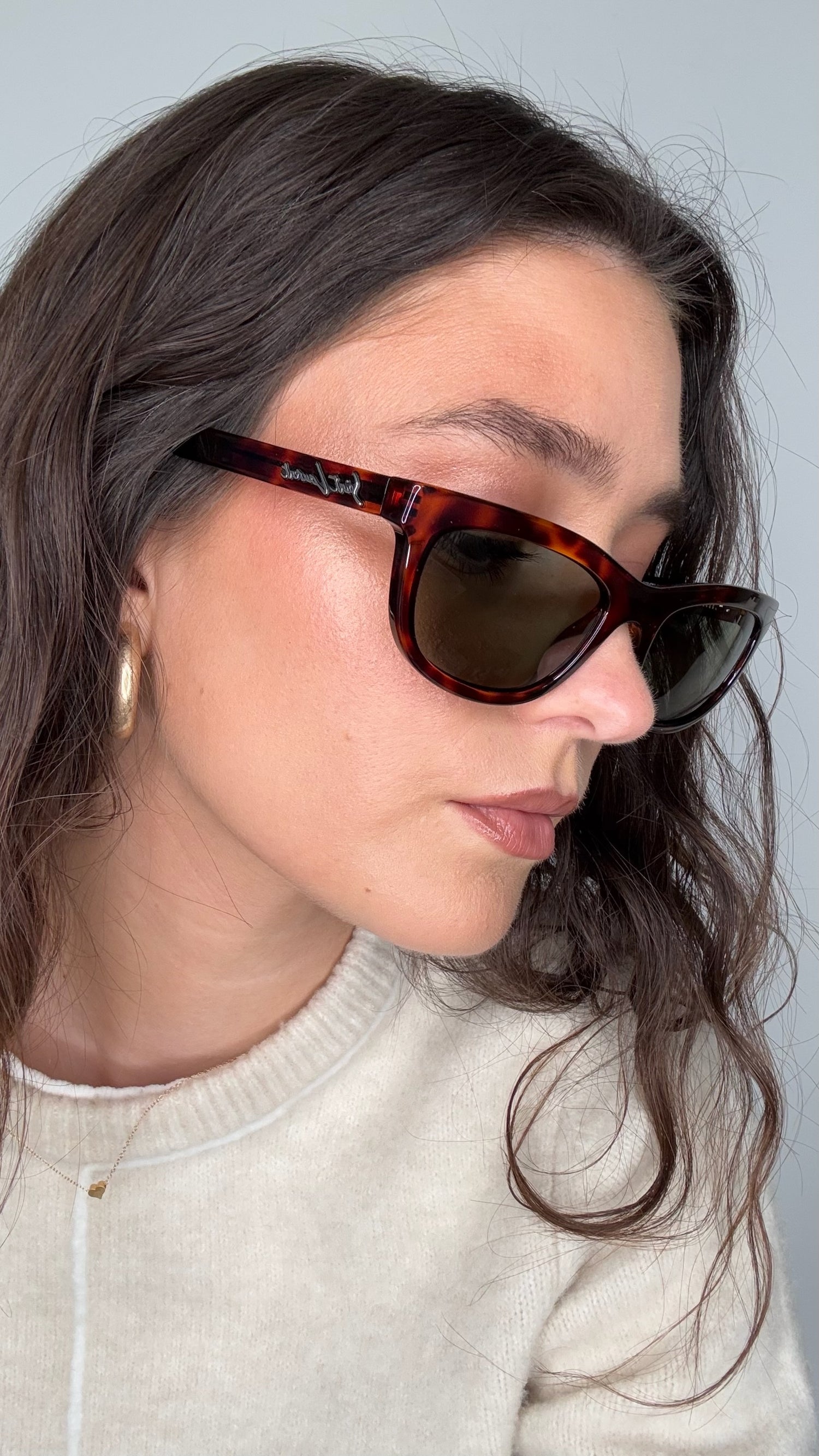 Saint Laurent sunglasses. Brown tortoiseshell. Silver Saint Laurent logo at sides.
