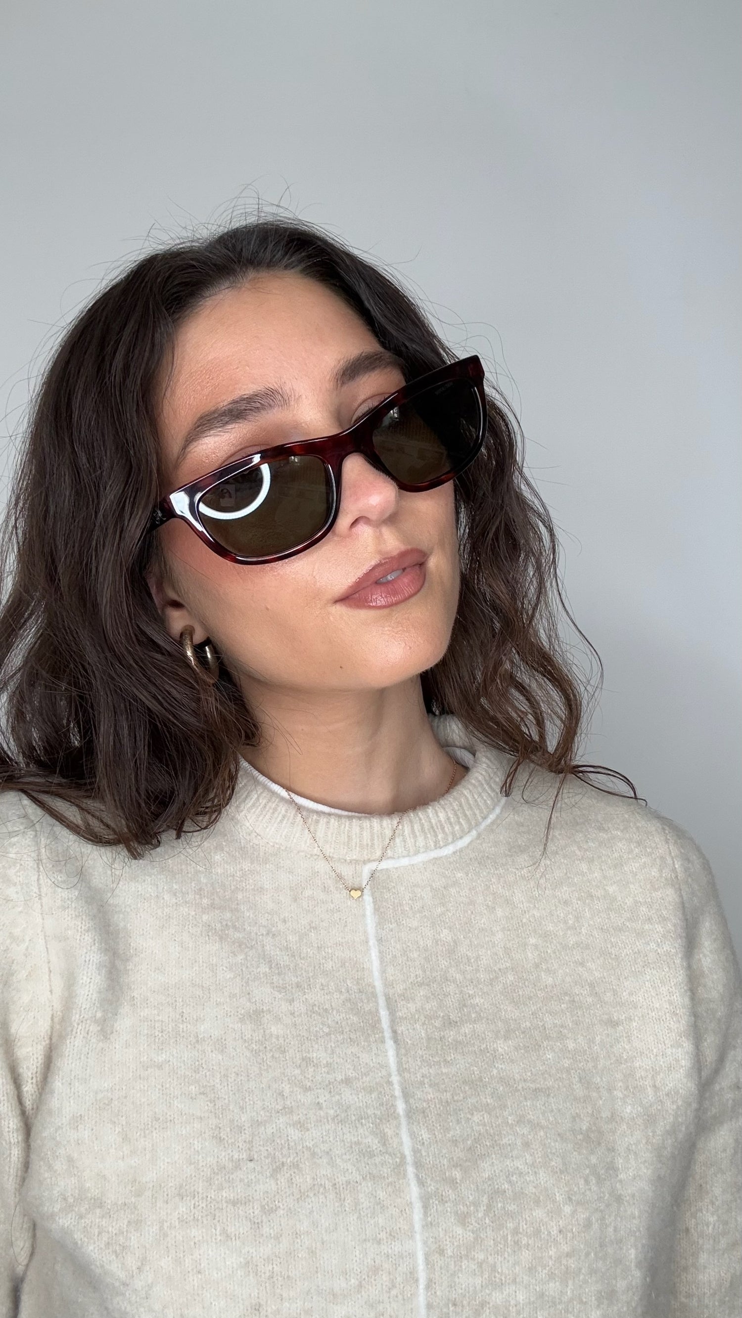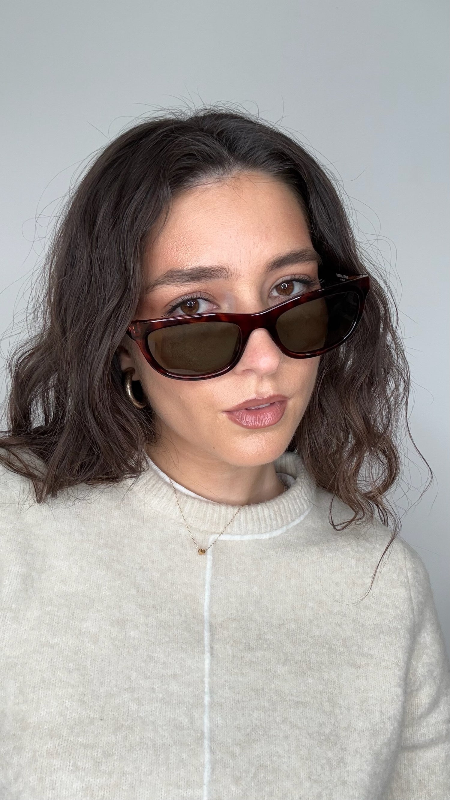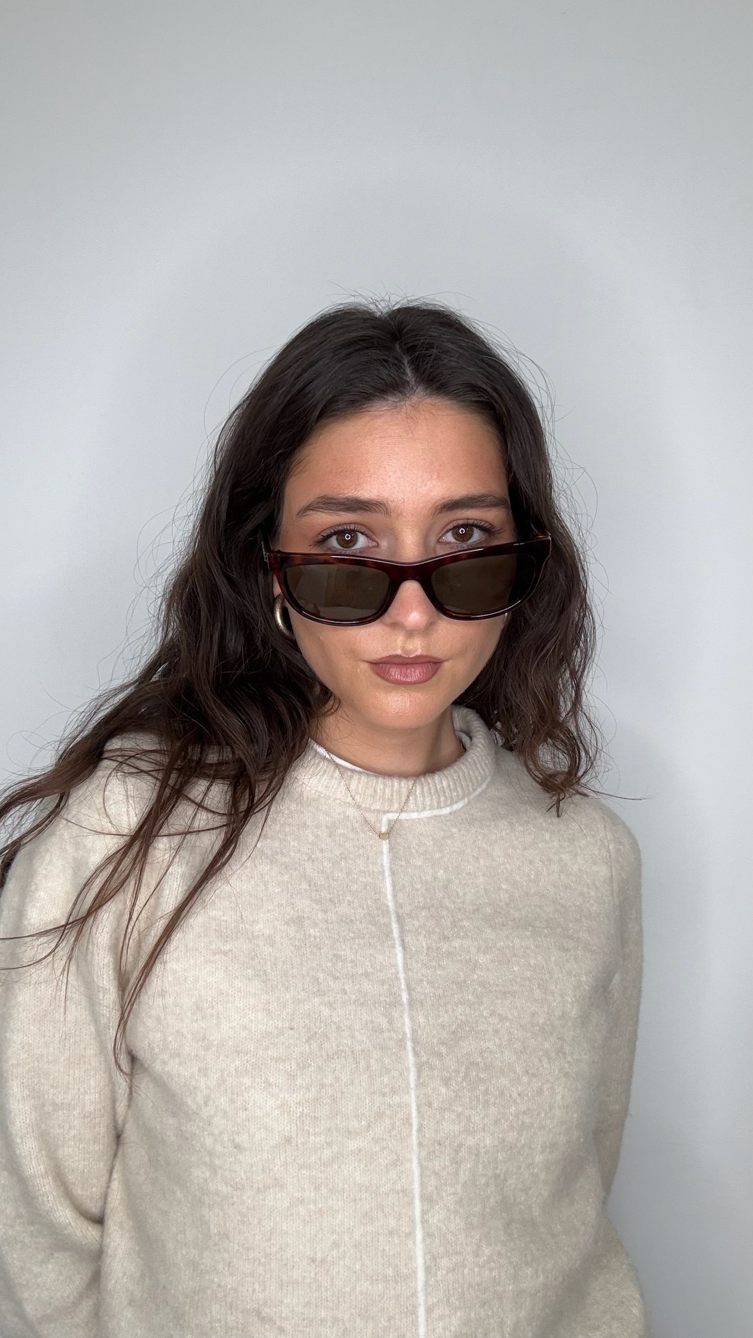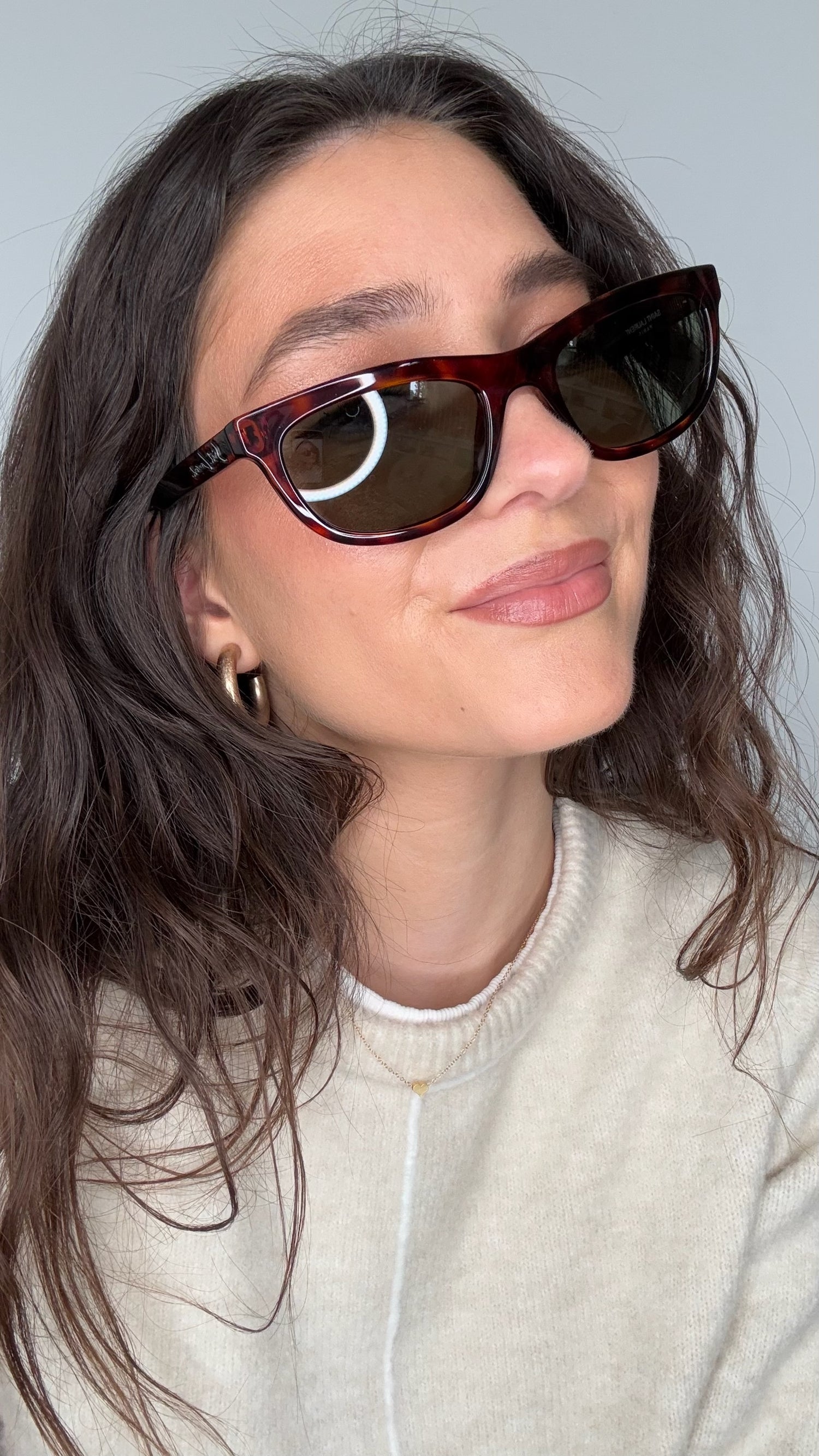 Saint Laurent sunglasses. Brown tortoiseshell. Silver Saint Laurent logo at sides.