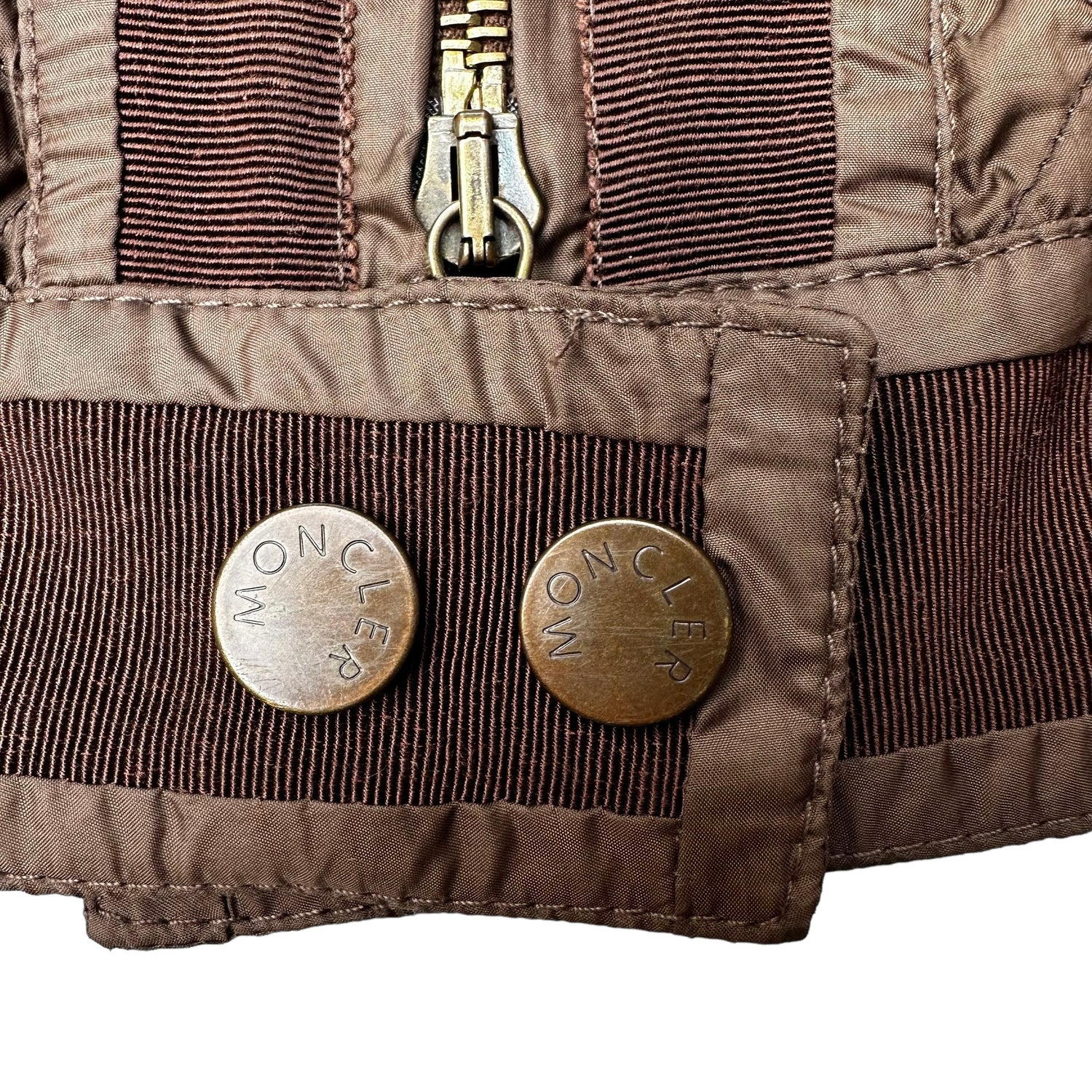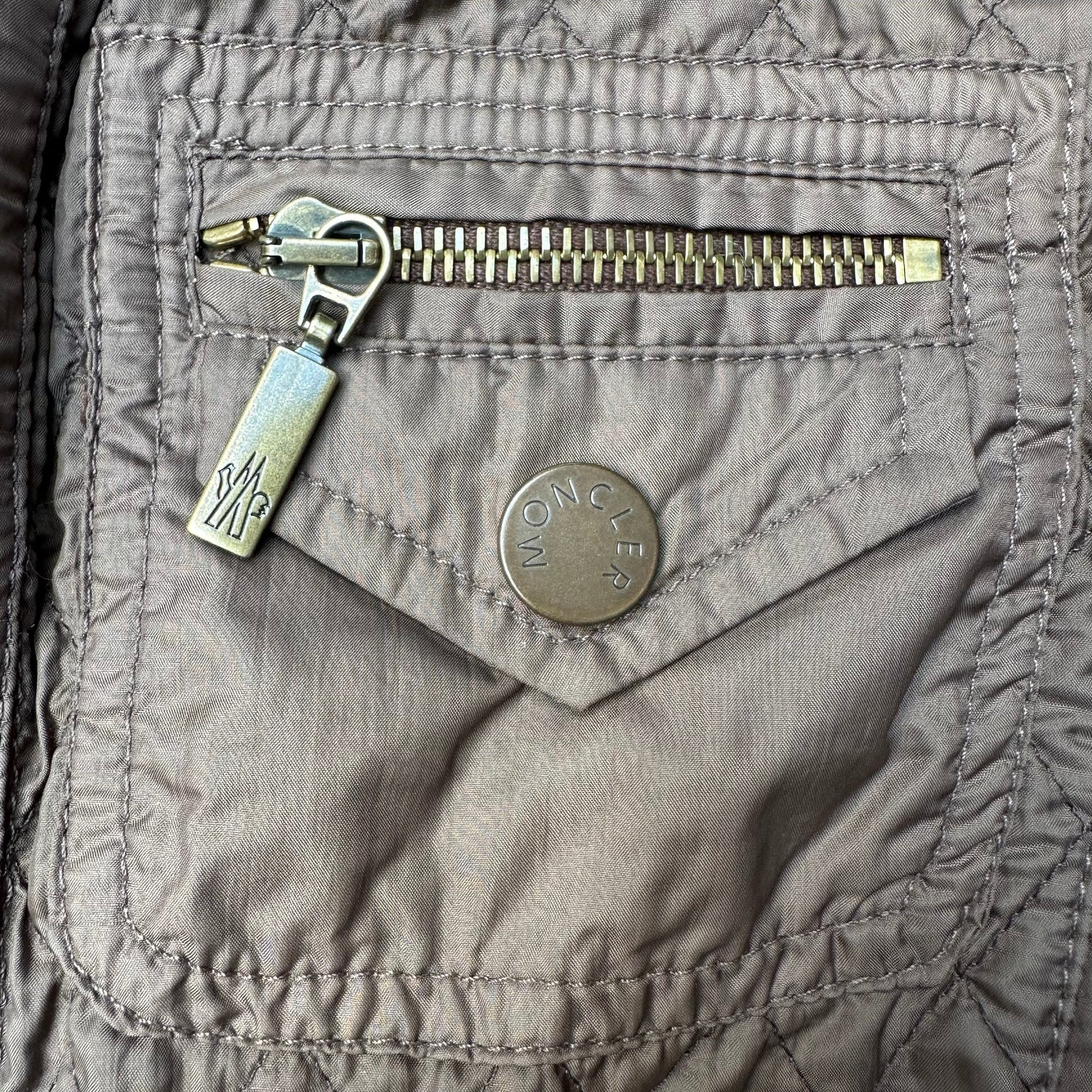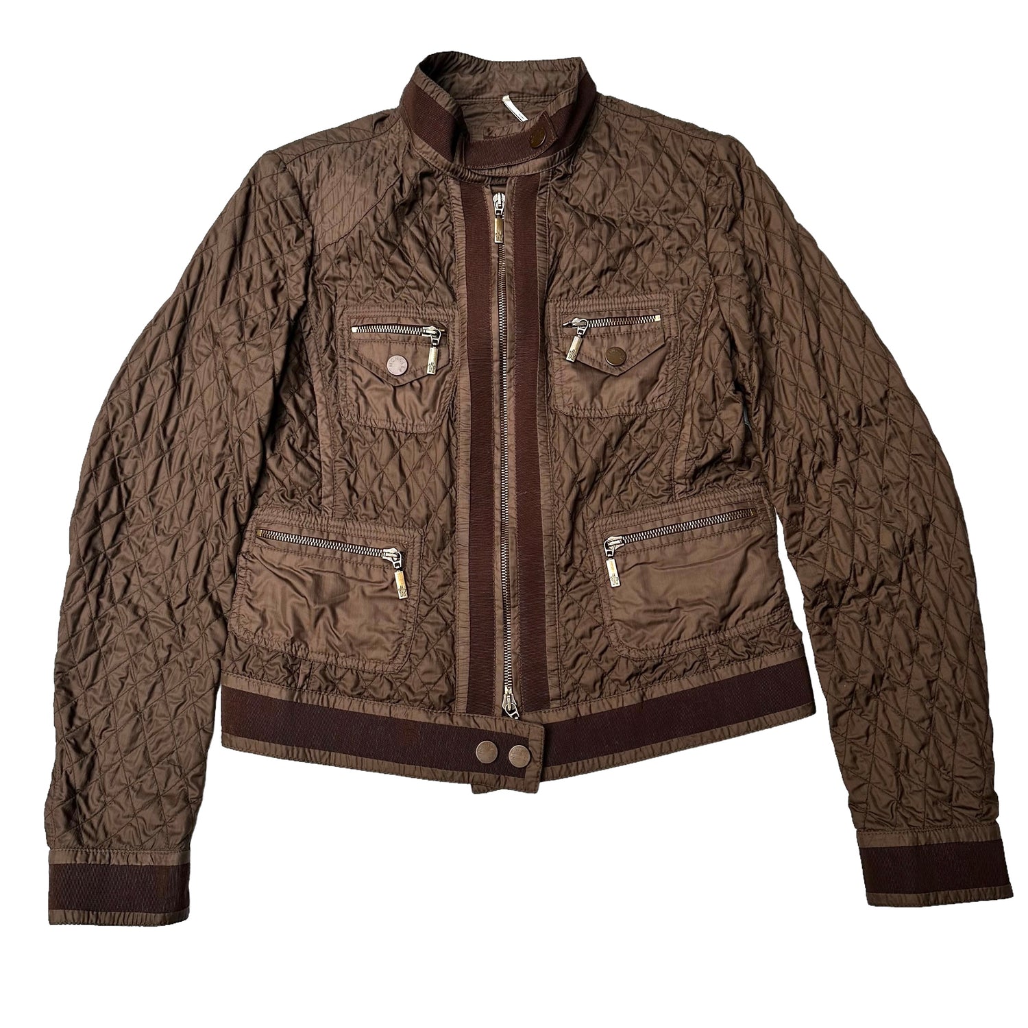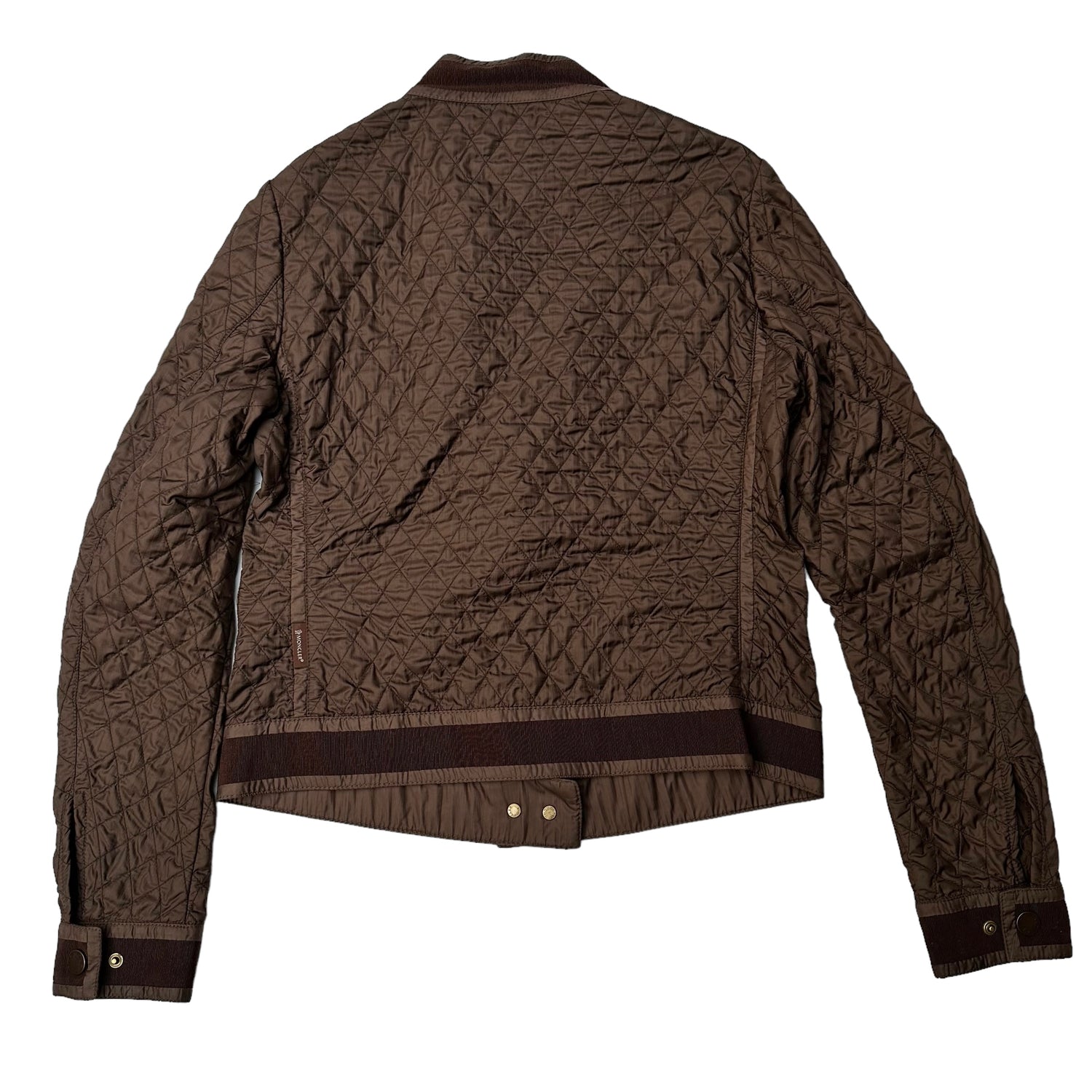 Moncler brown lightweight jacket. Diamond quilting pattern. Zipper closure at front. Stand alone collar. Four zipped pocket at front. Designer size 2.