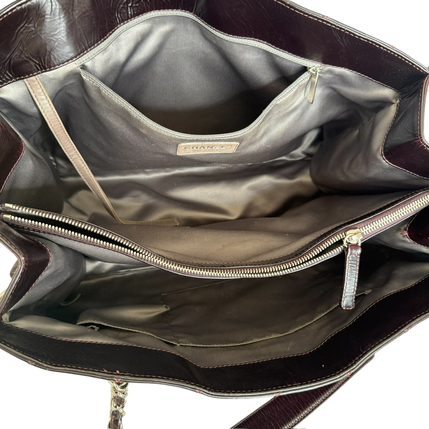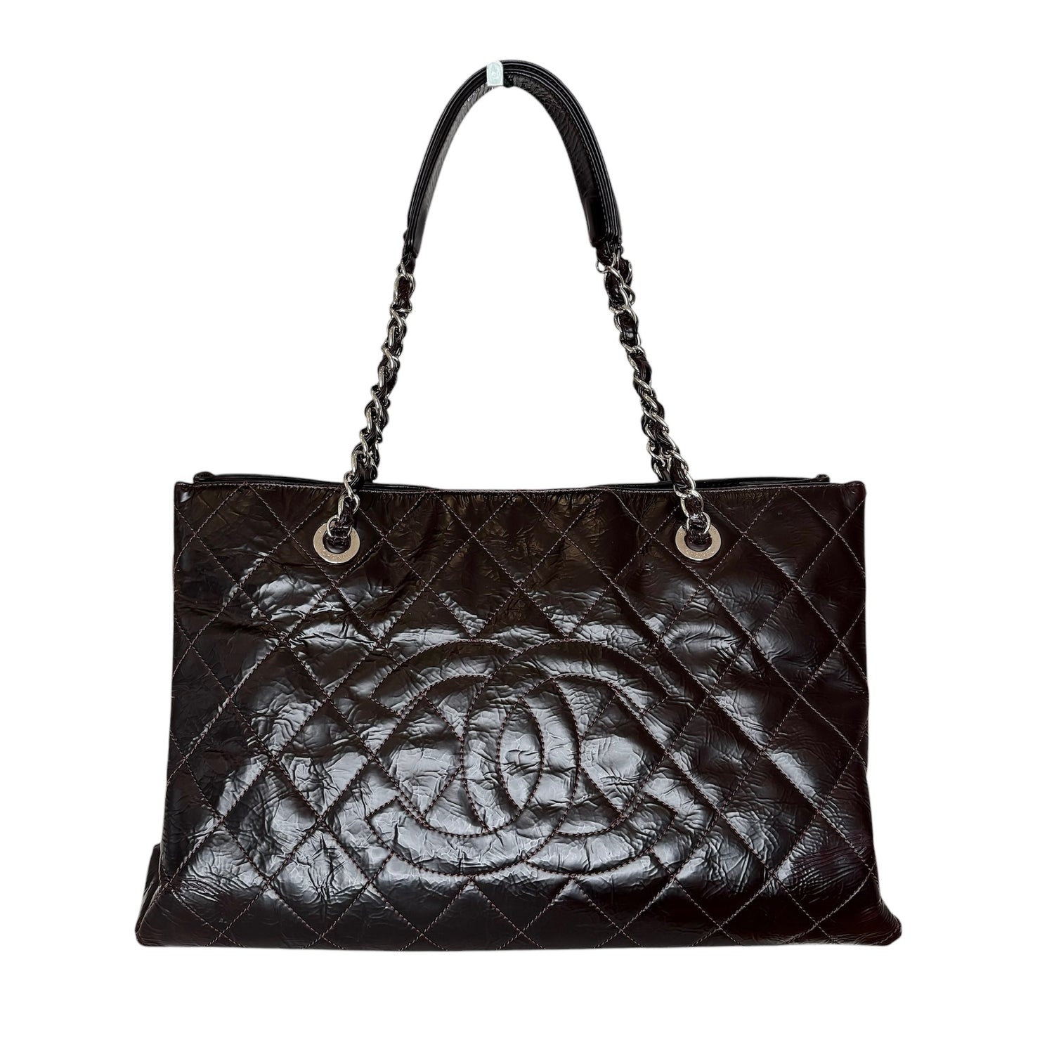 Chanel brown patent leather Cocomark bag. Crinkled deep brown leather. Burgundy diamond quilted stitchings. Silver hardware. One large back pocket. Double chain and leather handles. Canvas interior with two zipper pockets.