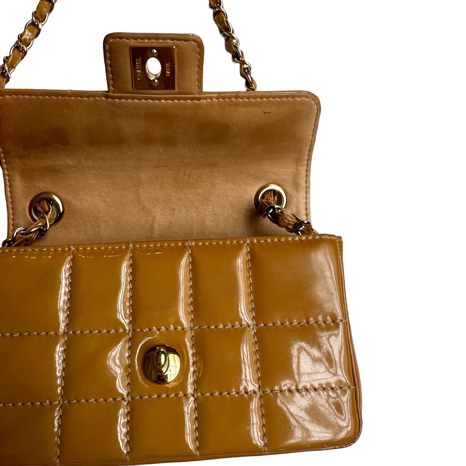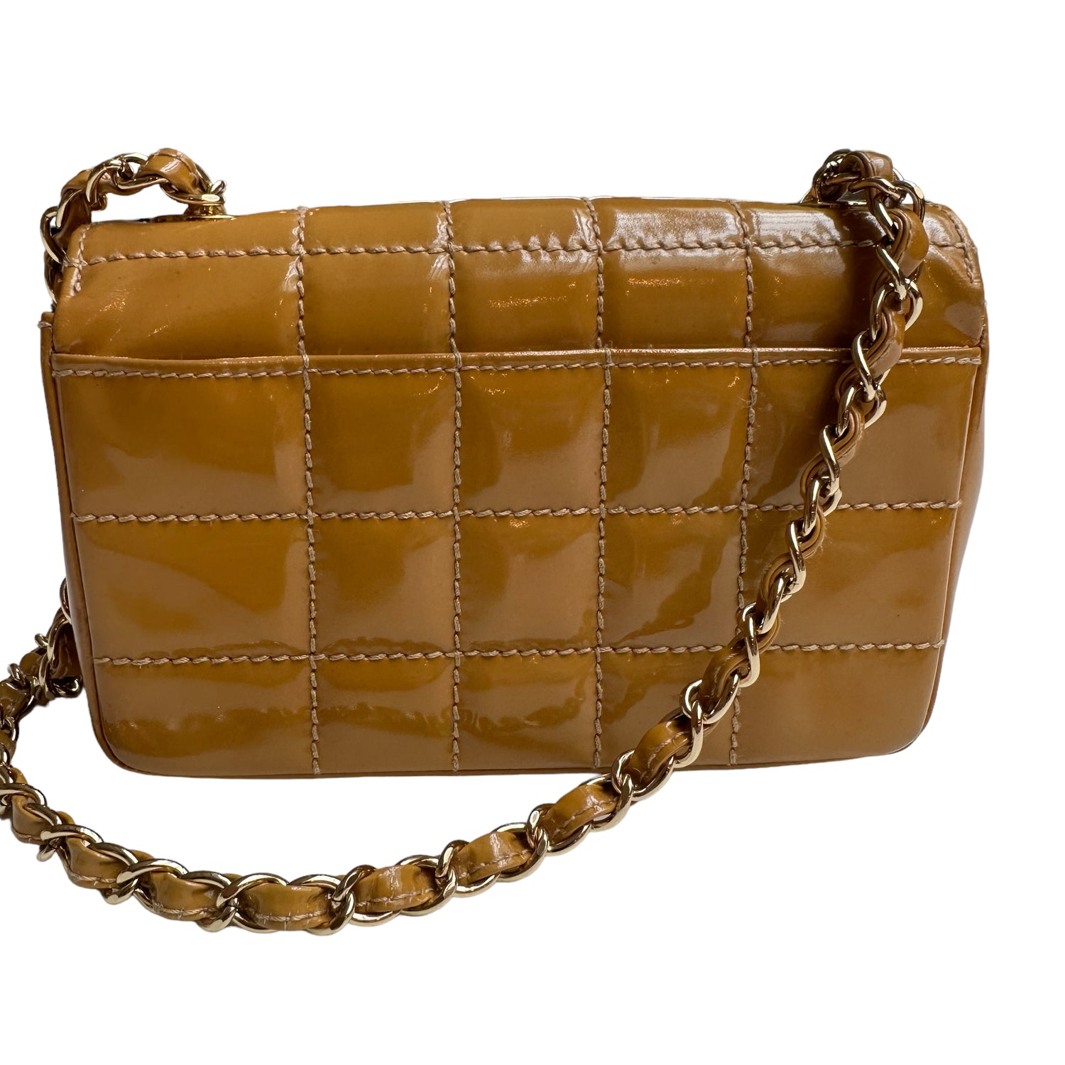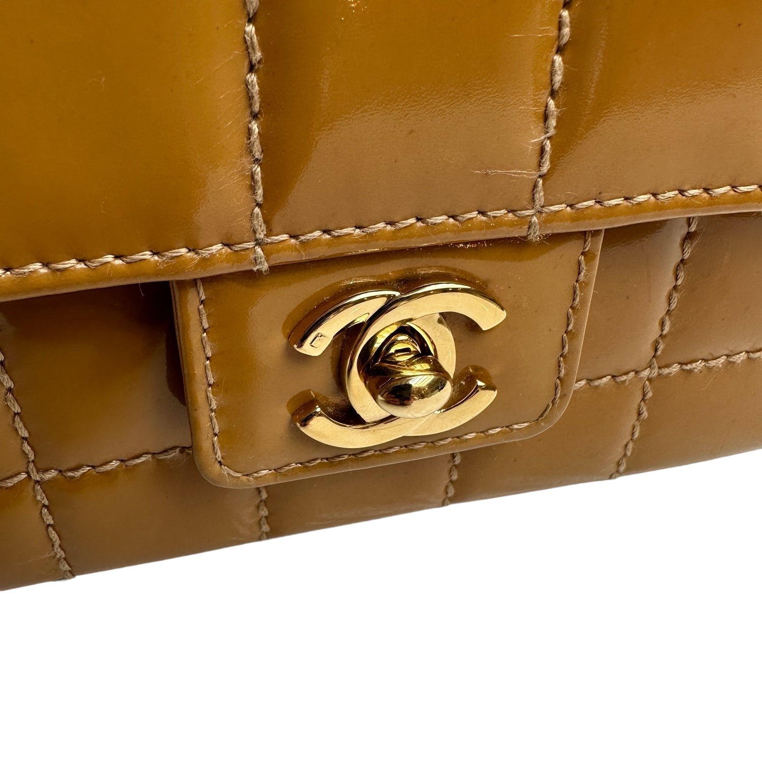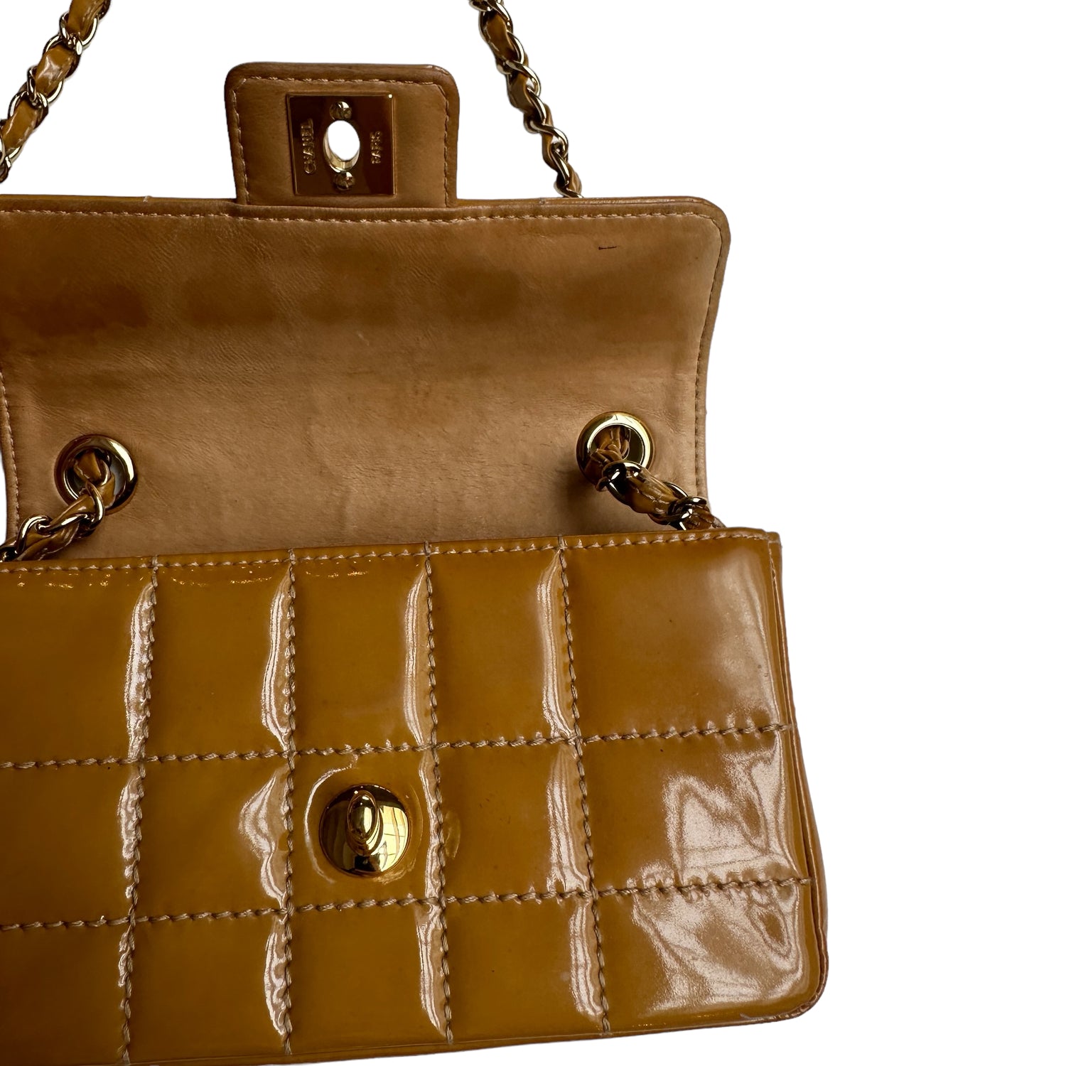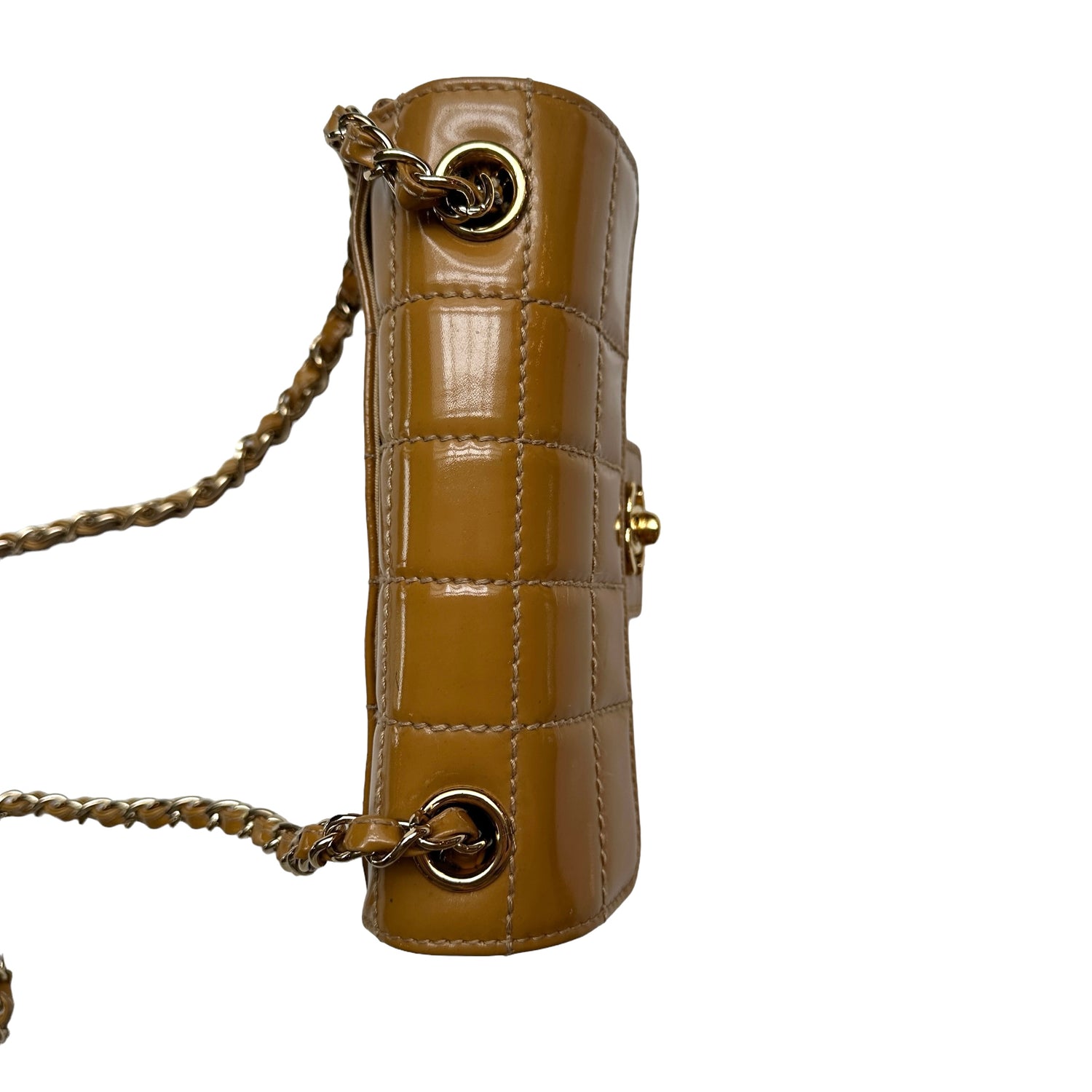 Chanel brown patent leather chocolate barre flap. Mini flap. 24k Gold hardware. CC turnlock closure at flap. Chain and leather single strap. CC beige fabric lining.