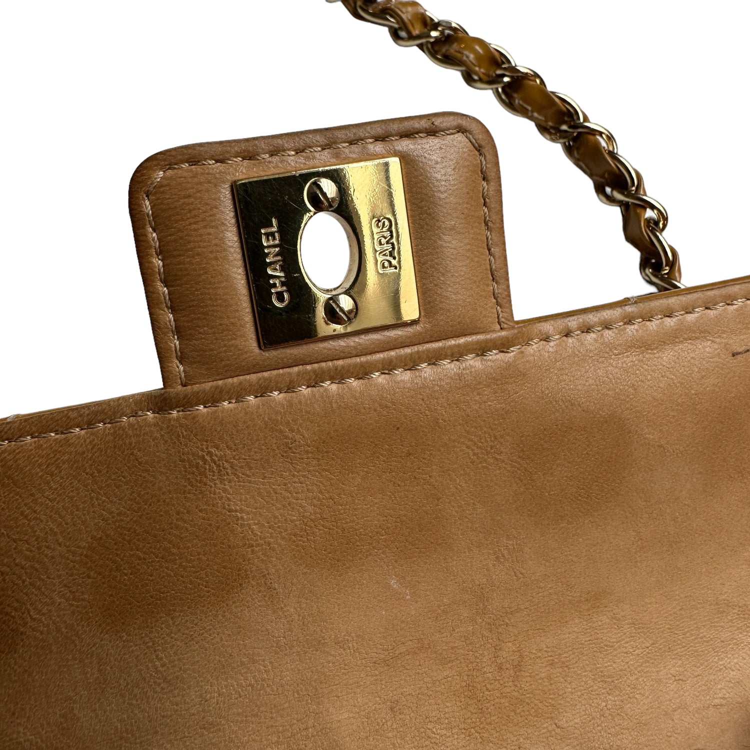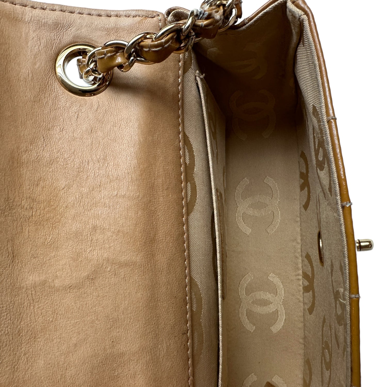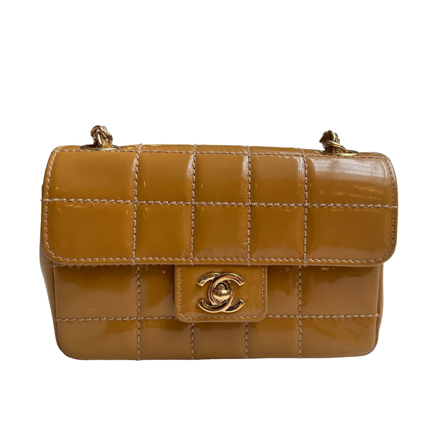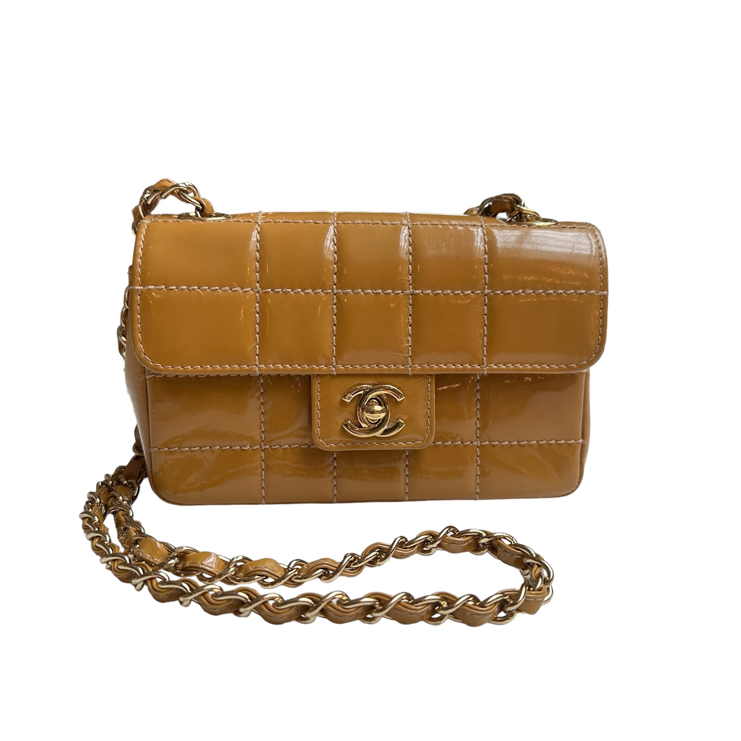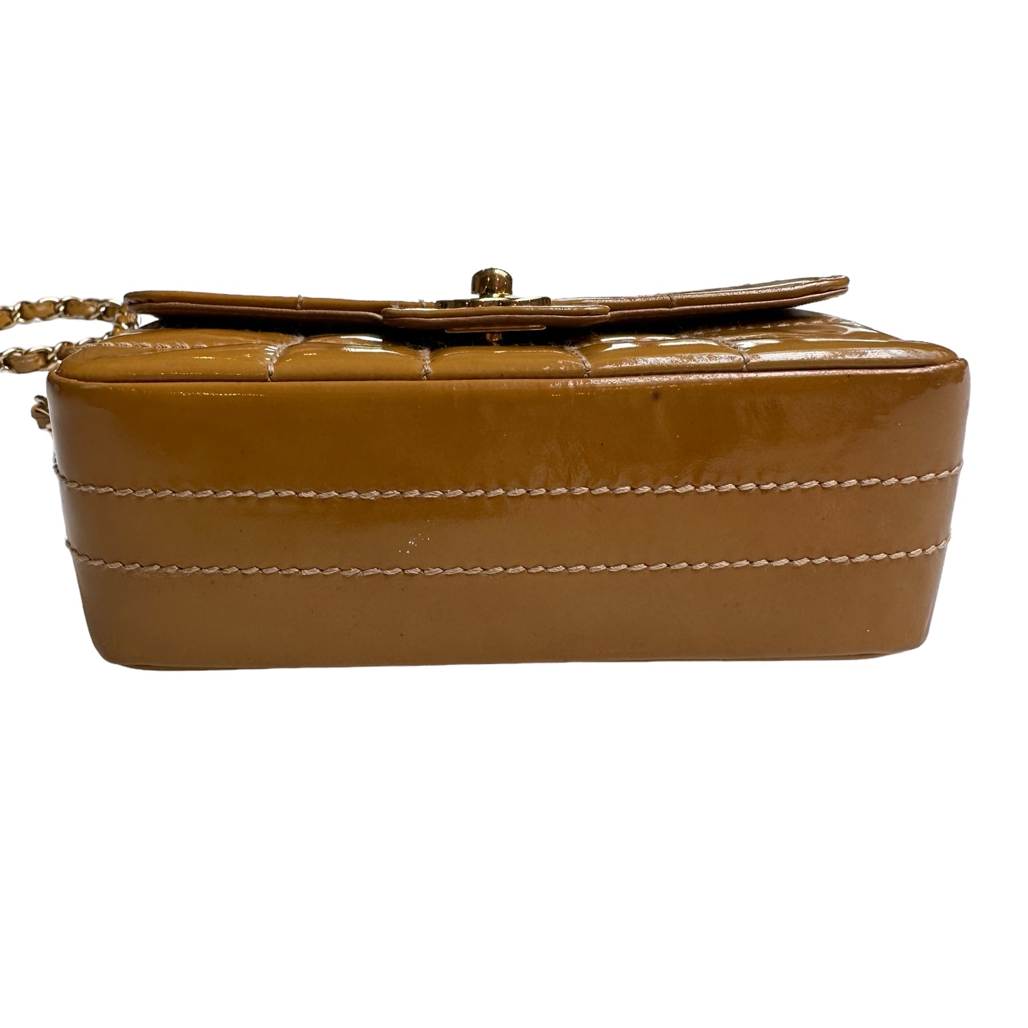 Chanel brown patent leather chocolate barre flap. Mini flap. 24k Gold hardware. CC turnlock closure at flap. Chain and leather single strap. CC beige fabric lining.