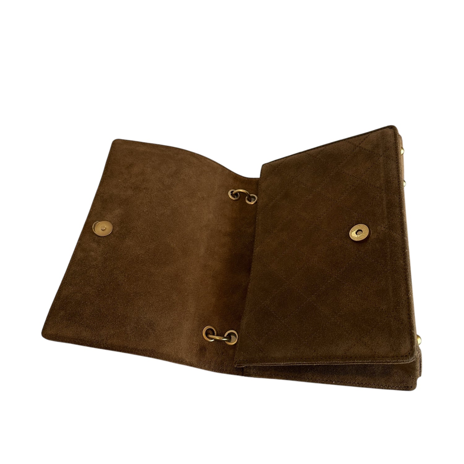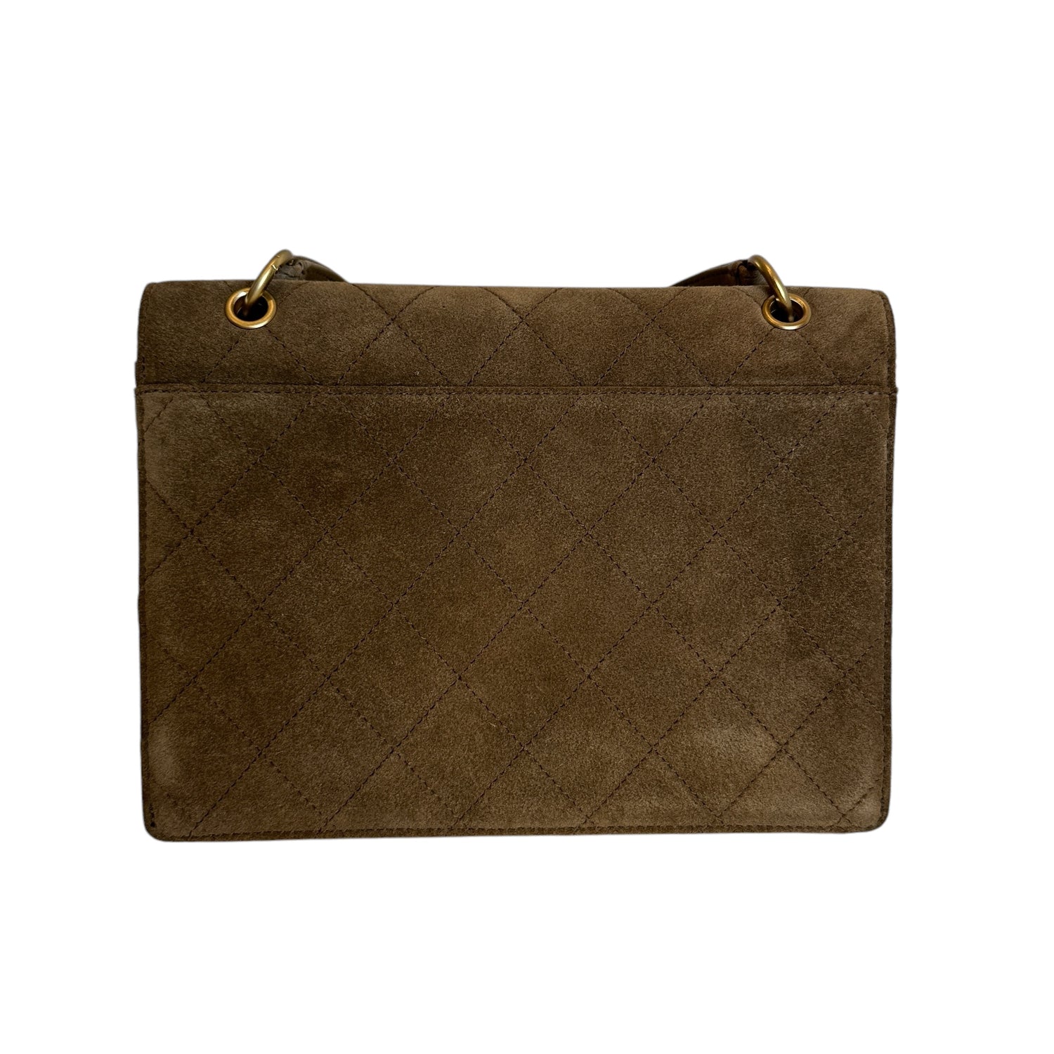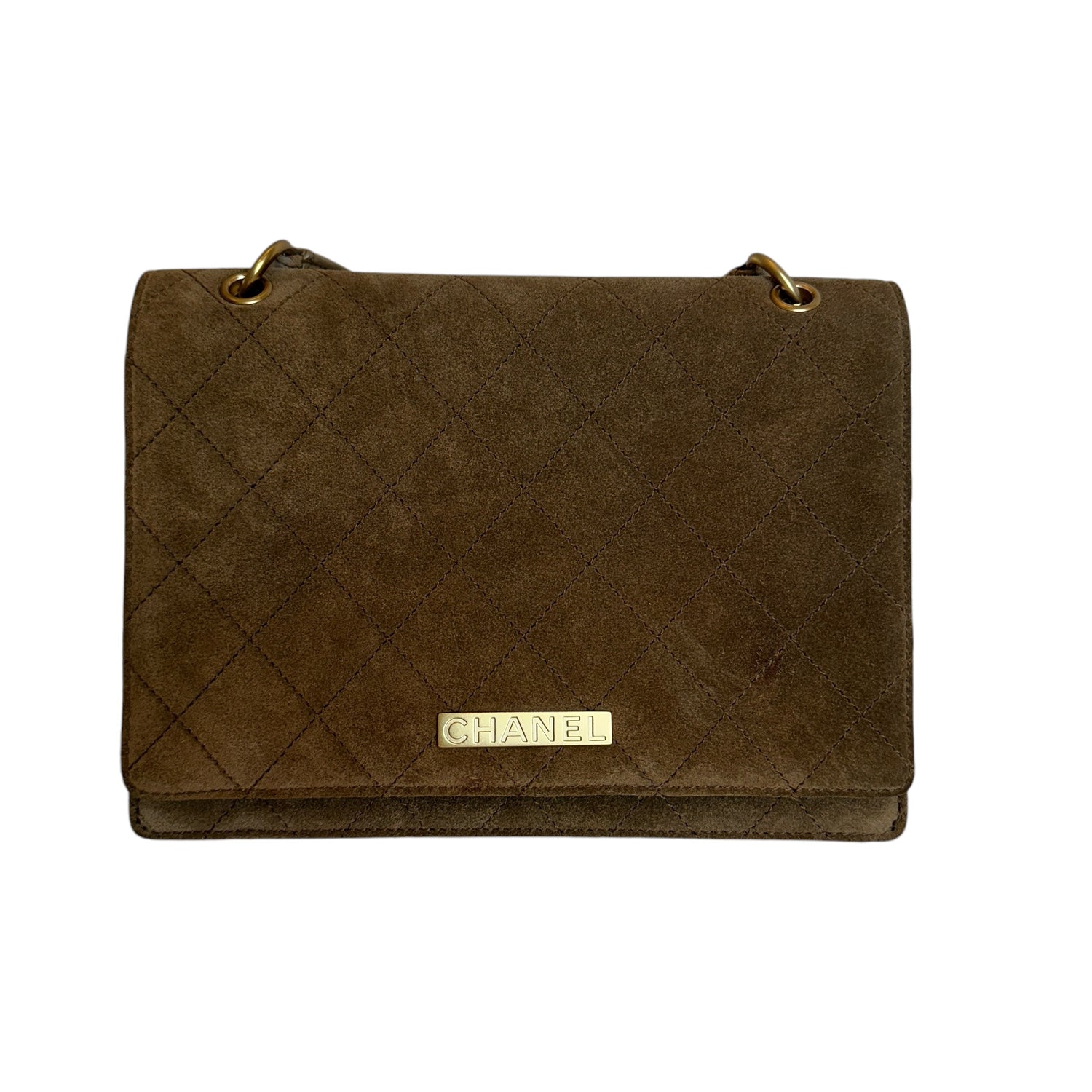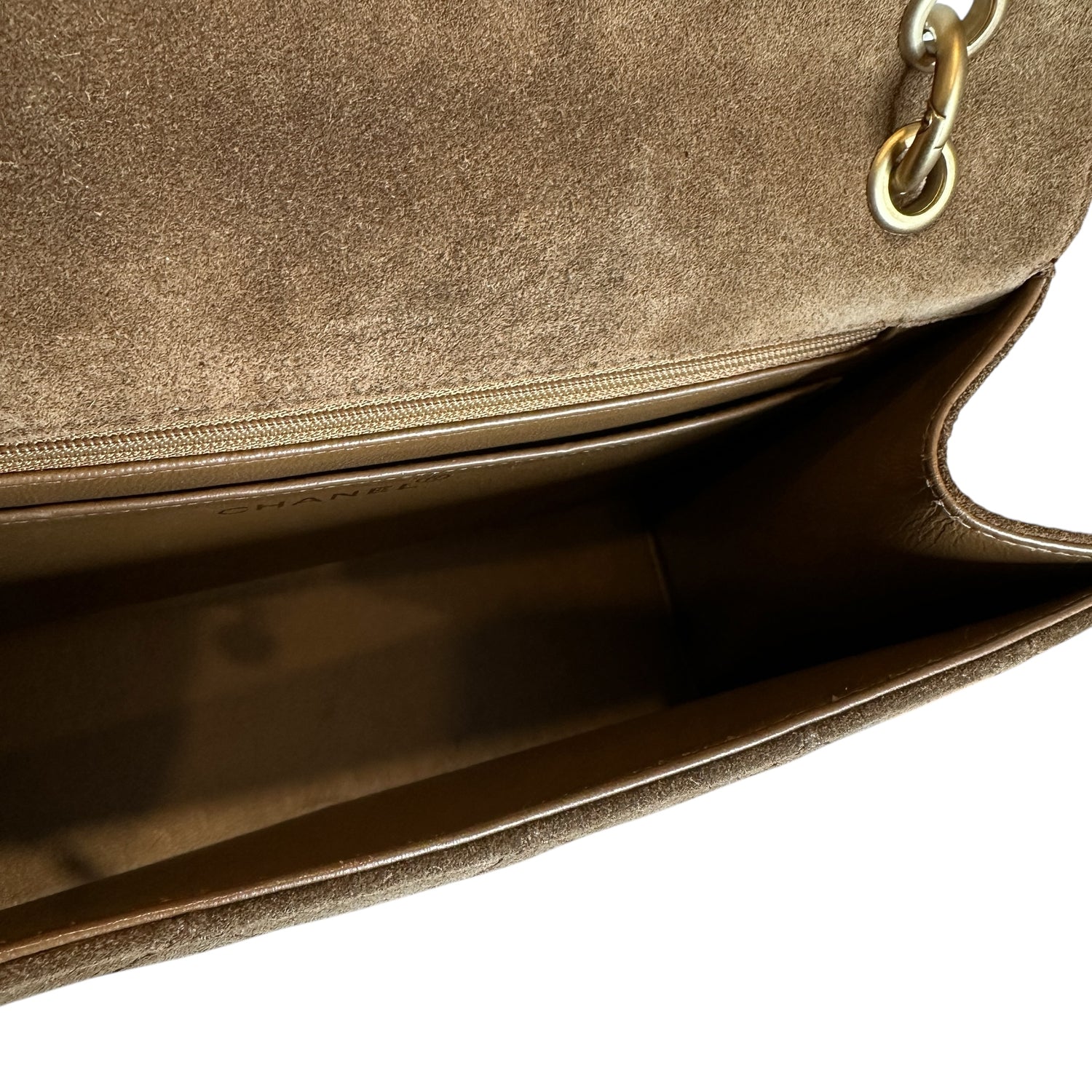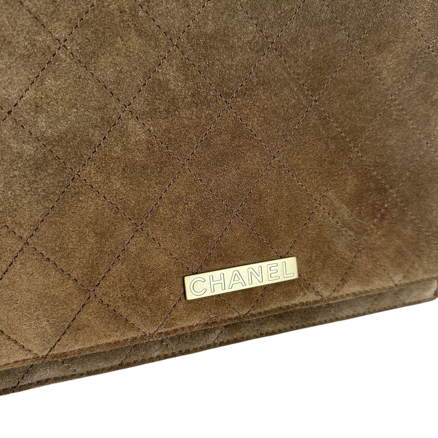 Chanel brown suede flap bag. Diamond quilted brown suede. Gold-tone hardware. Magnetic snap closure at flap. Interior zipper pocket.