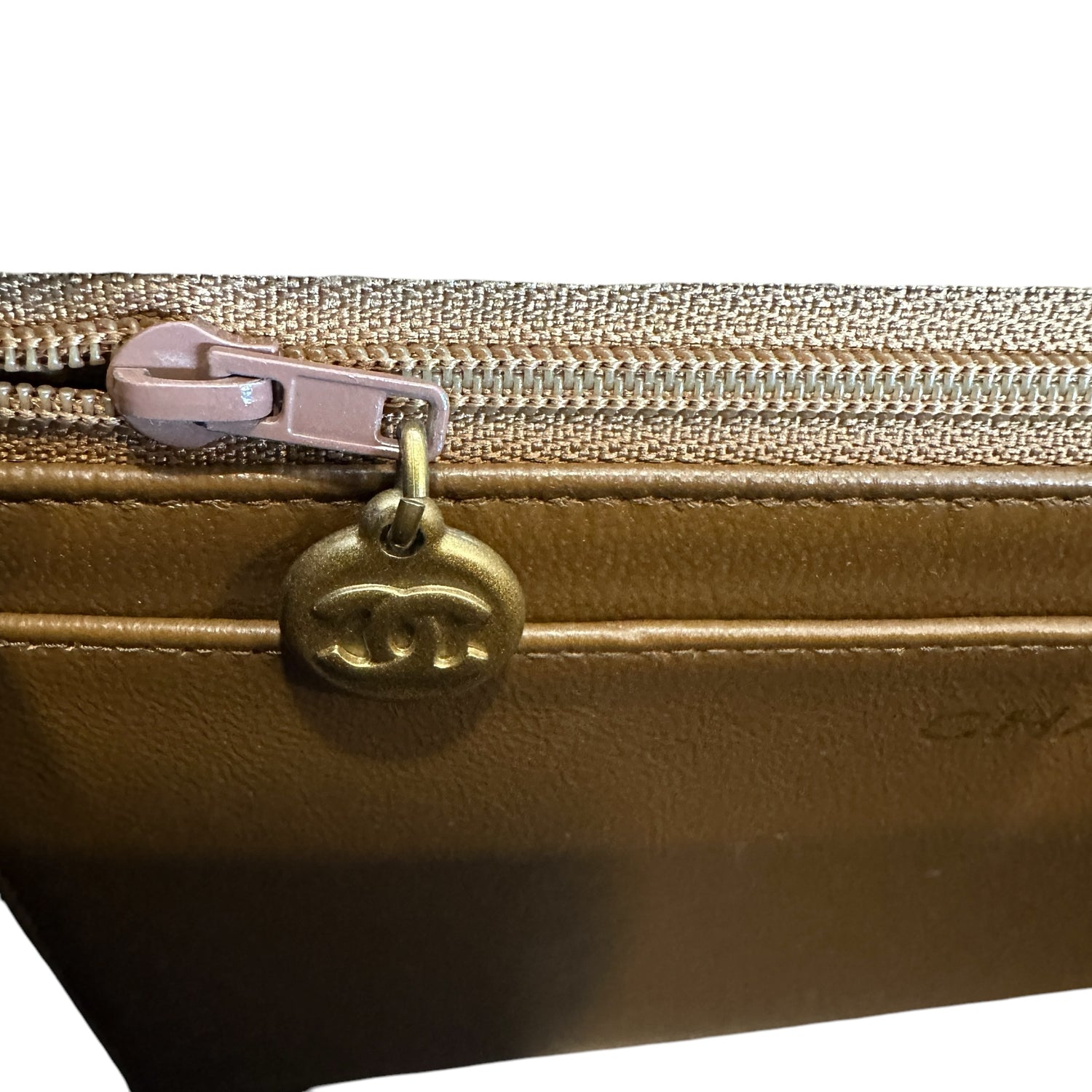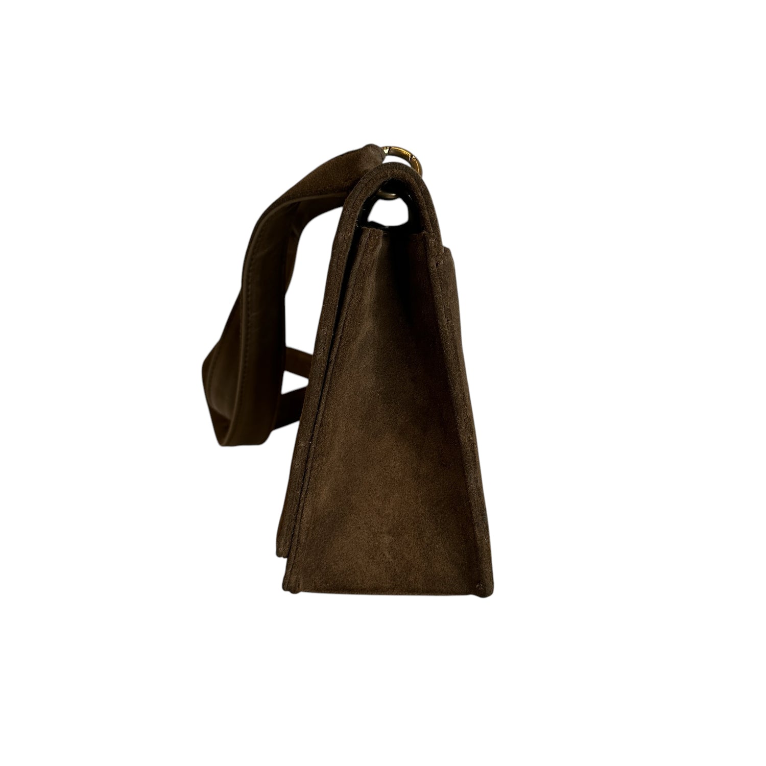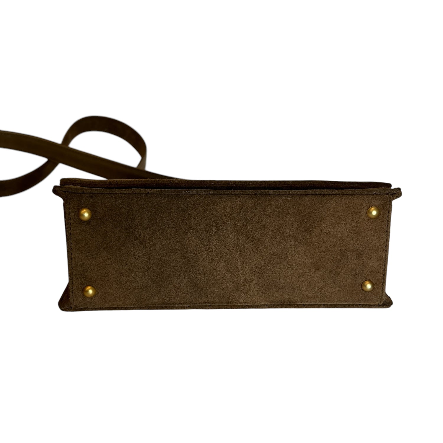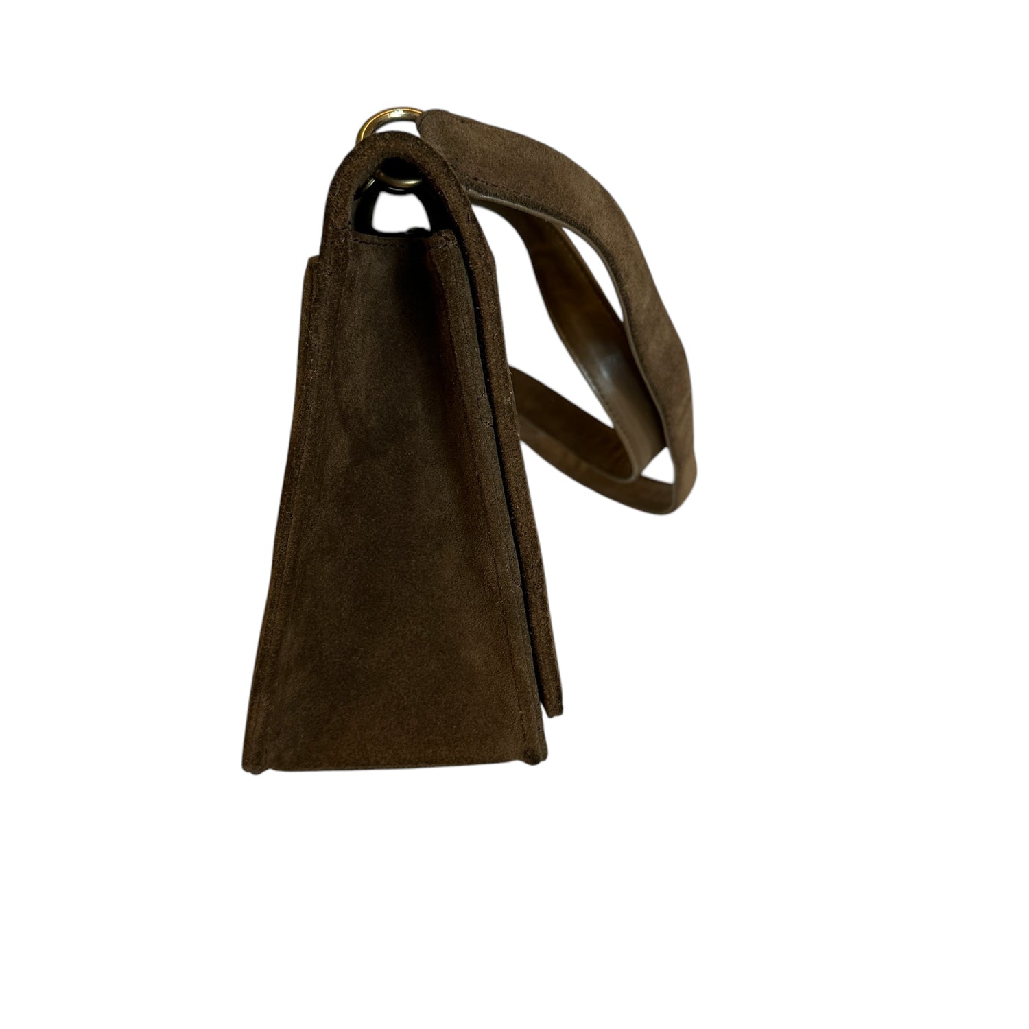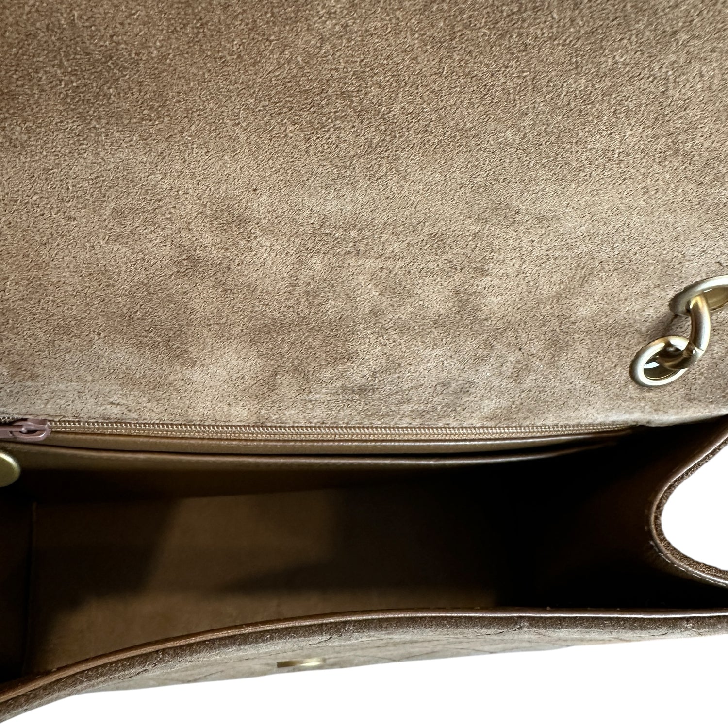 Chanel brown suede flap bag. Diamond quilted brown suede. Gold-tone hardware. Magnetic snap closure at flap. Interior zipper pocket.