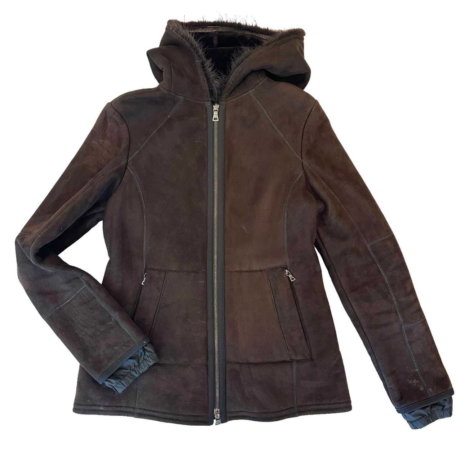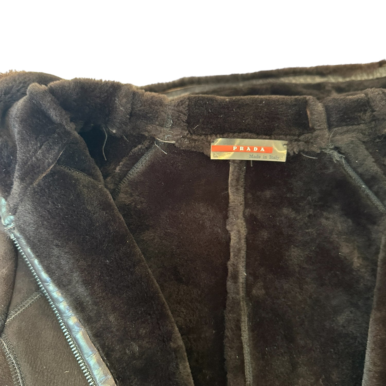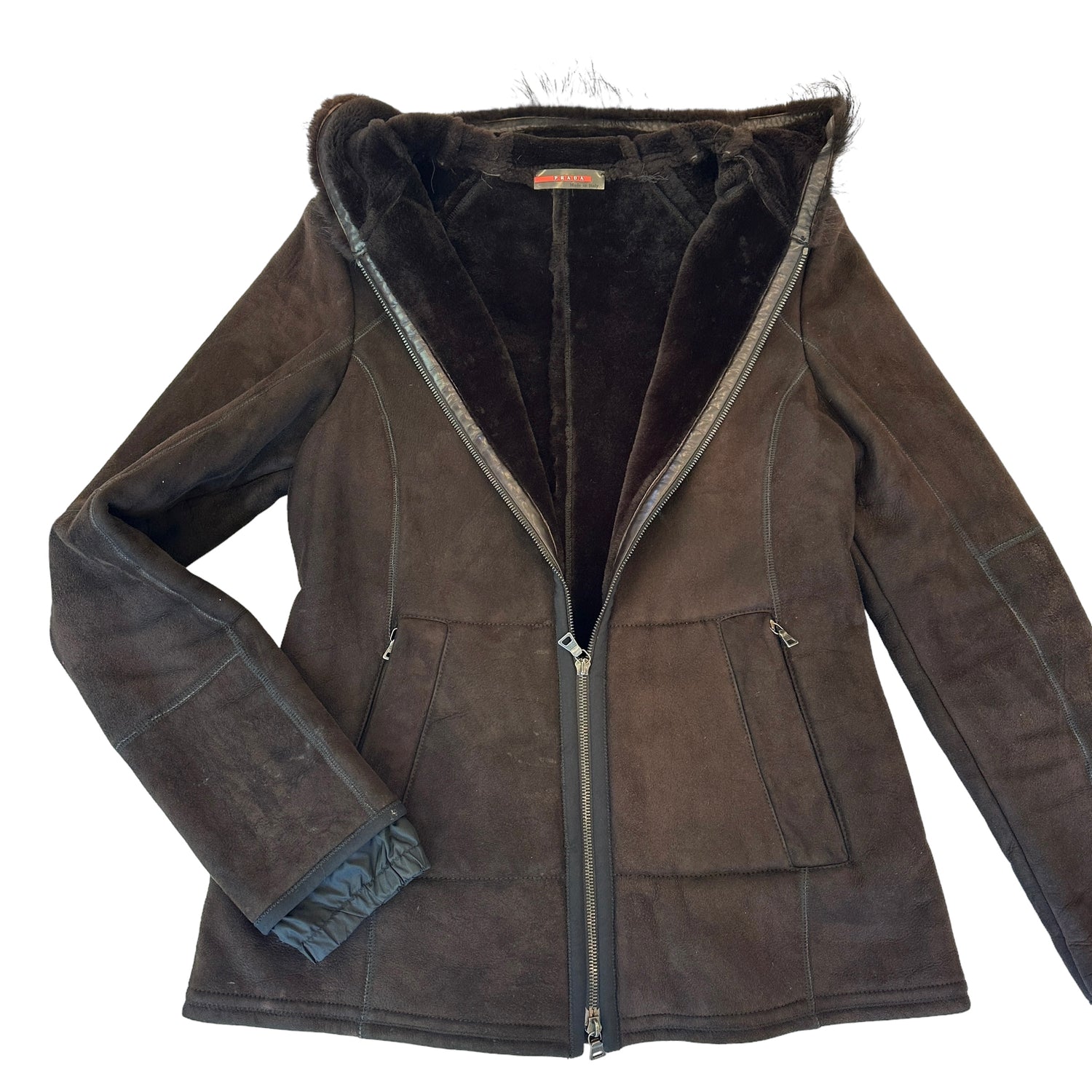 Prada brown suede and fur coat. Vintage from the 2007 collection. Hoodie. Zipper closure at front. Two zipper pockets.