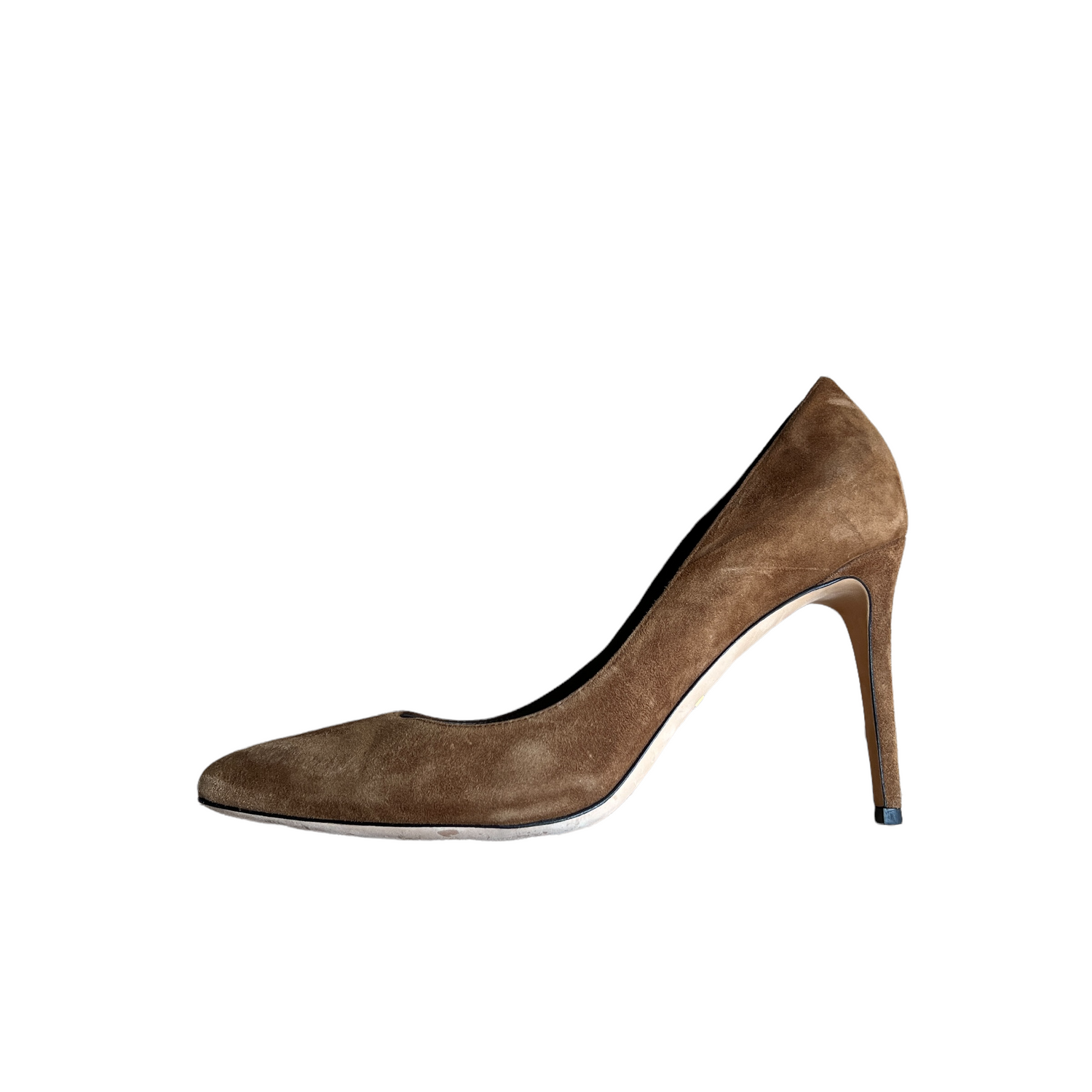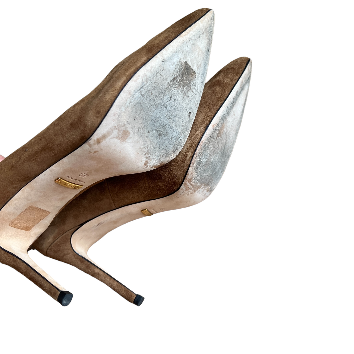 Brown suede high heels. Pointy toes. Leather lined. Designer size 39.