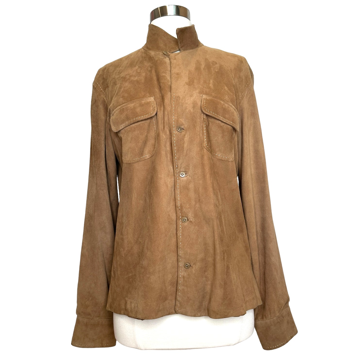 Ralph Lauren Purple Label brown suede shirt. Pointed collar. Button closure at front. Flap pockets. Designer size 10.