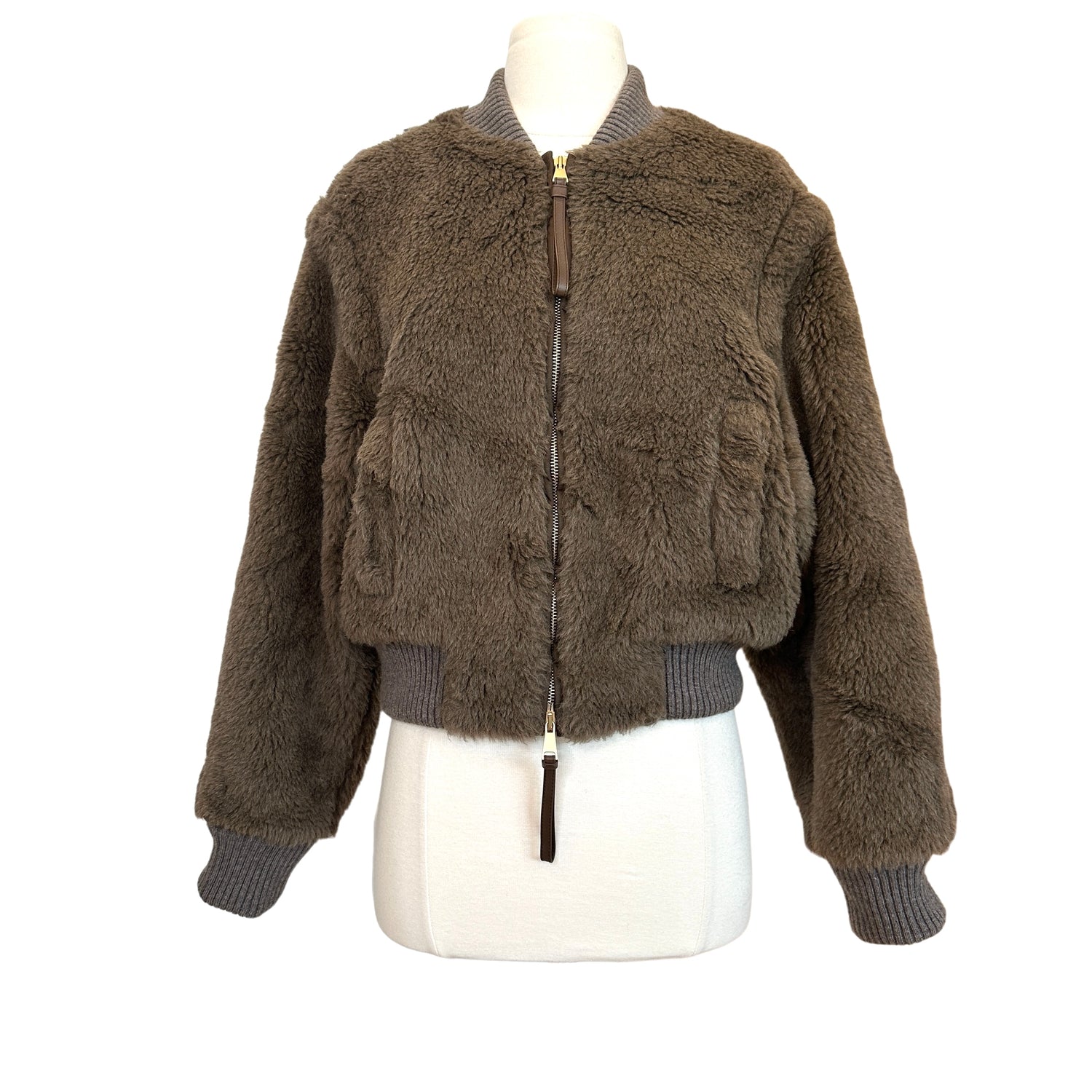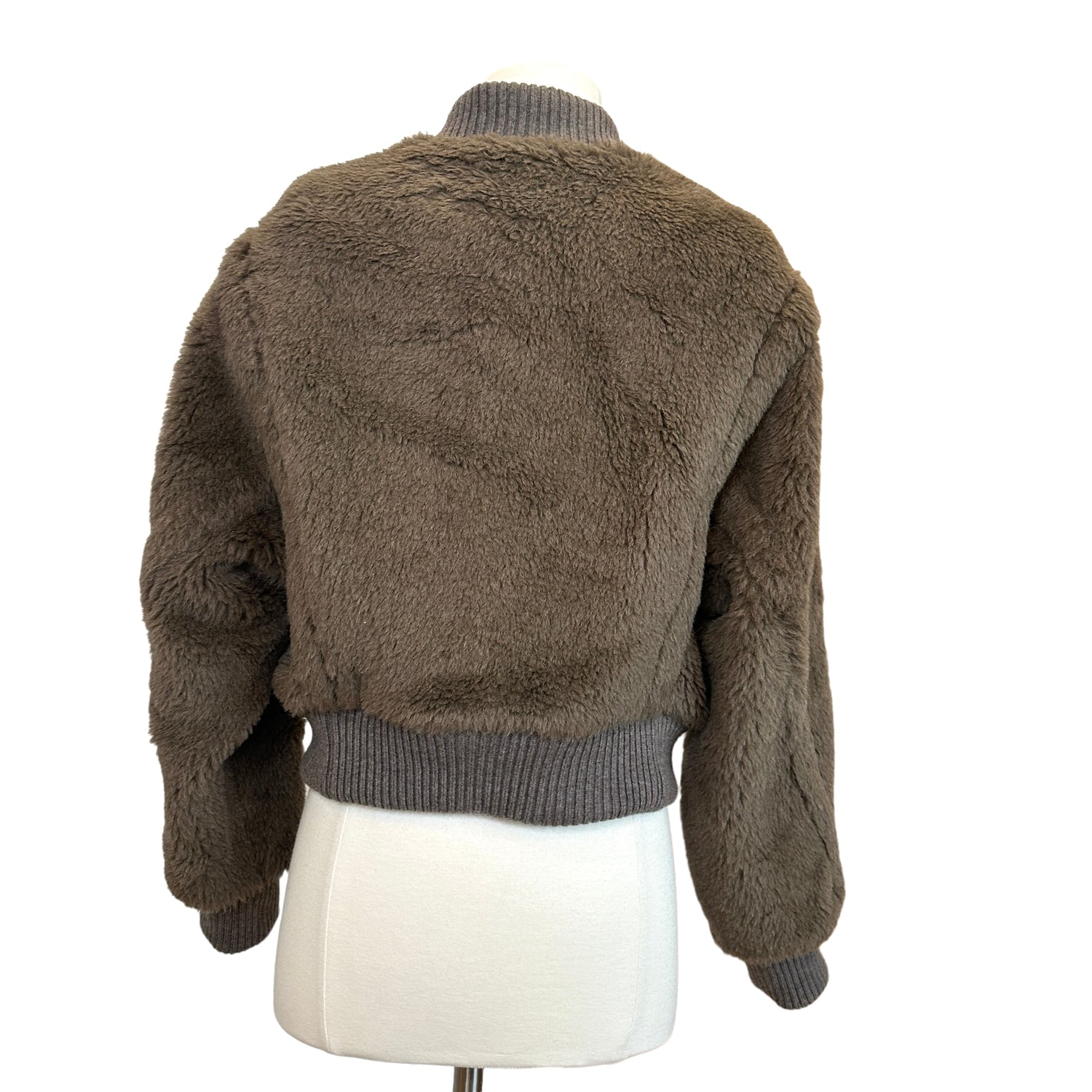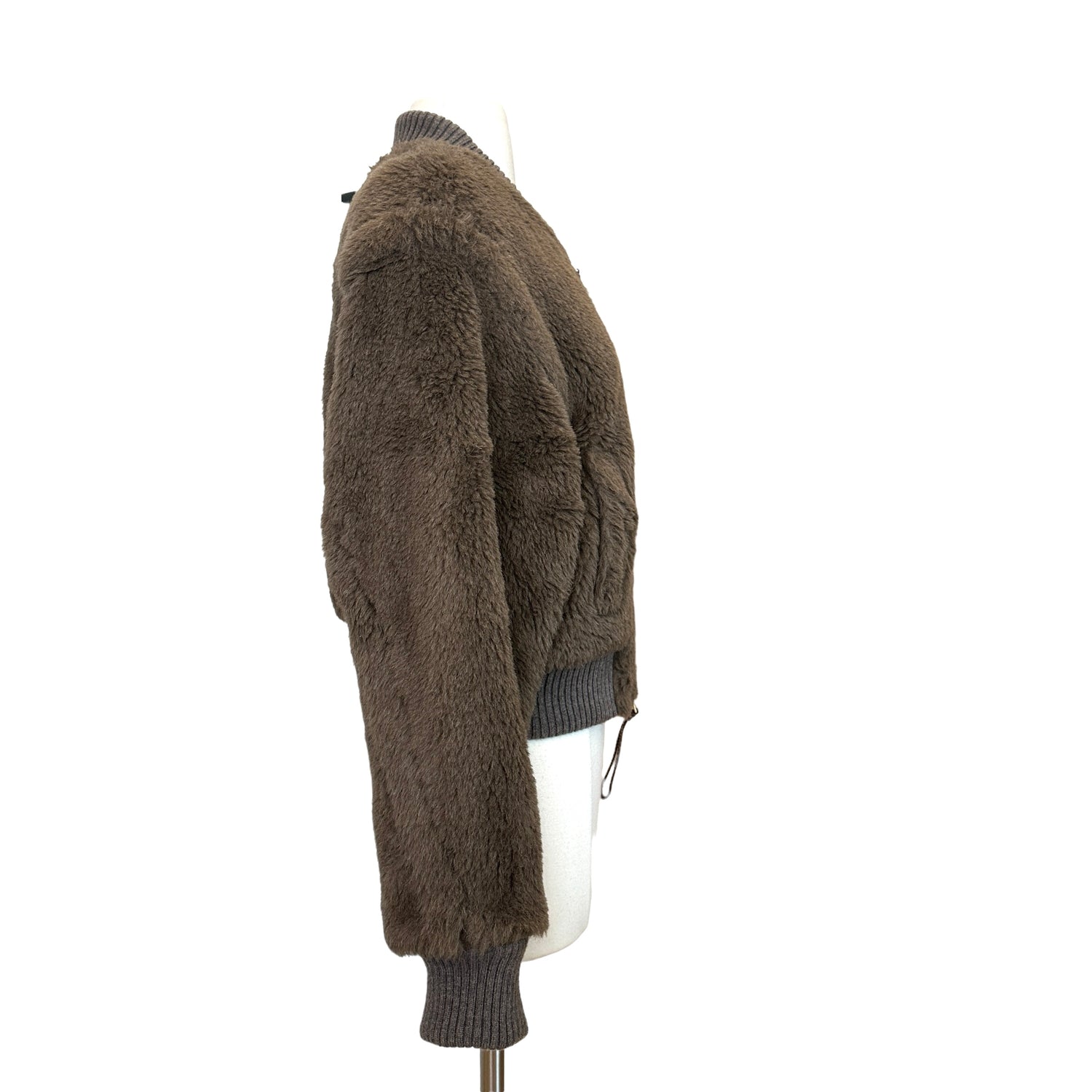 Max Mara teddy jacket. Chocolate brown faux-fur. Bomber jacket with zipper closure at front. Slit pockets. Designer size 40 (US 6).