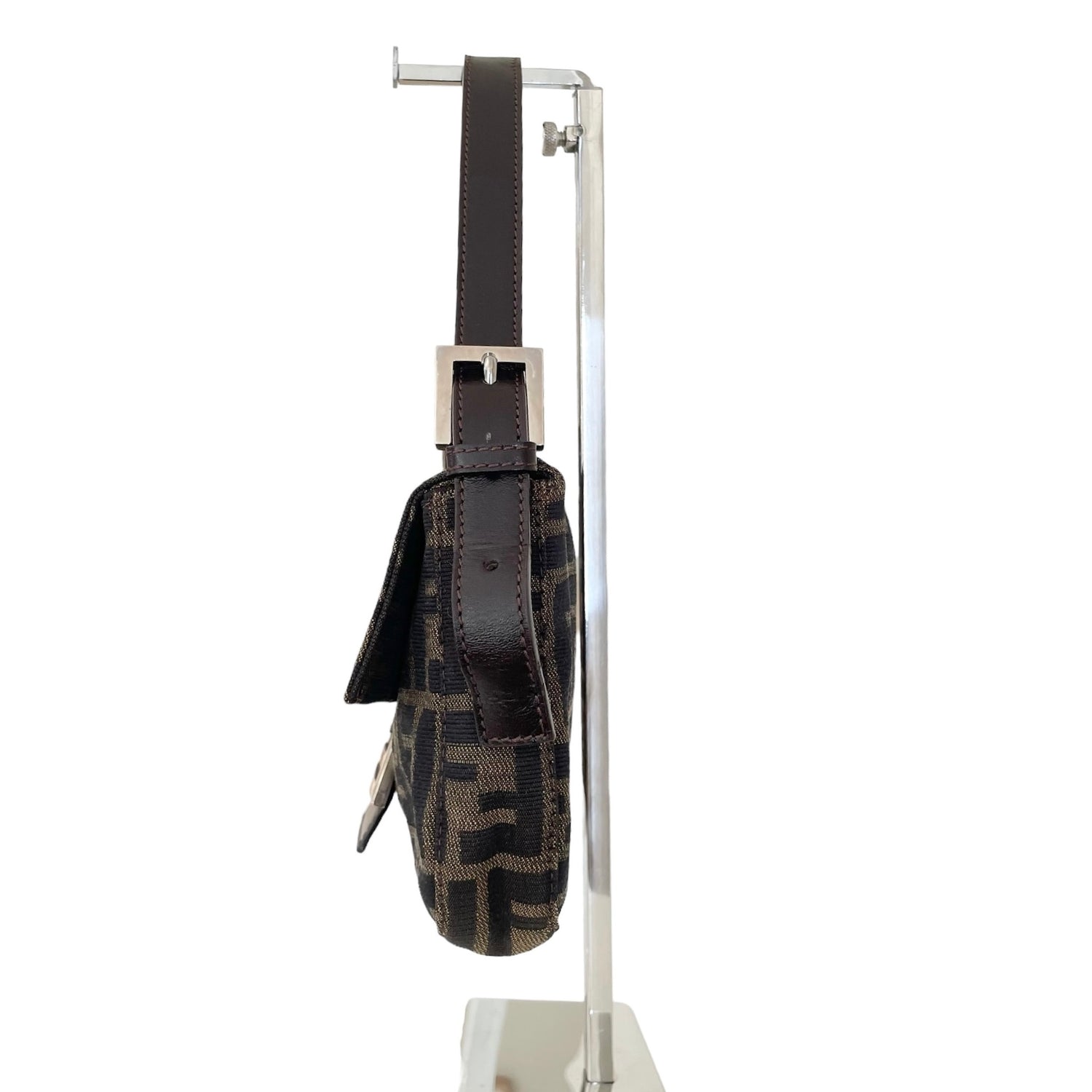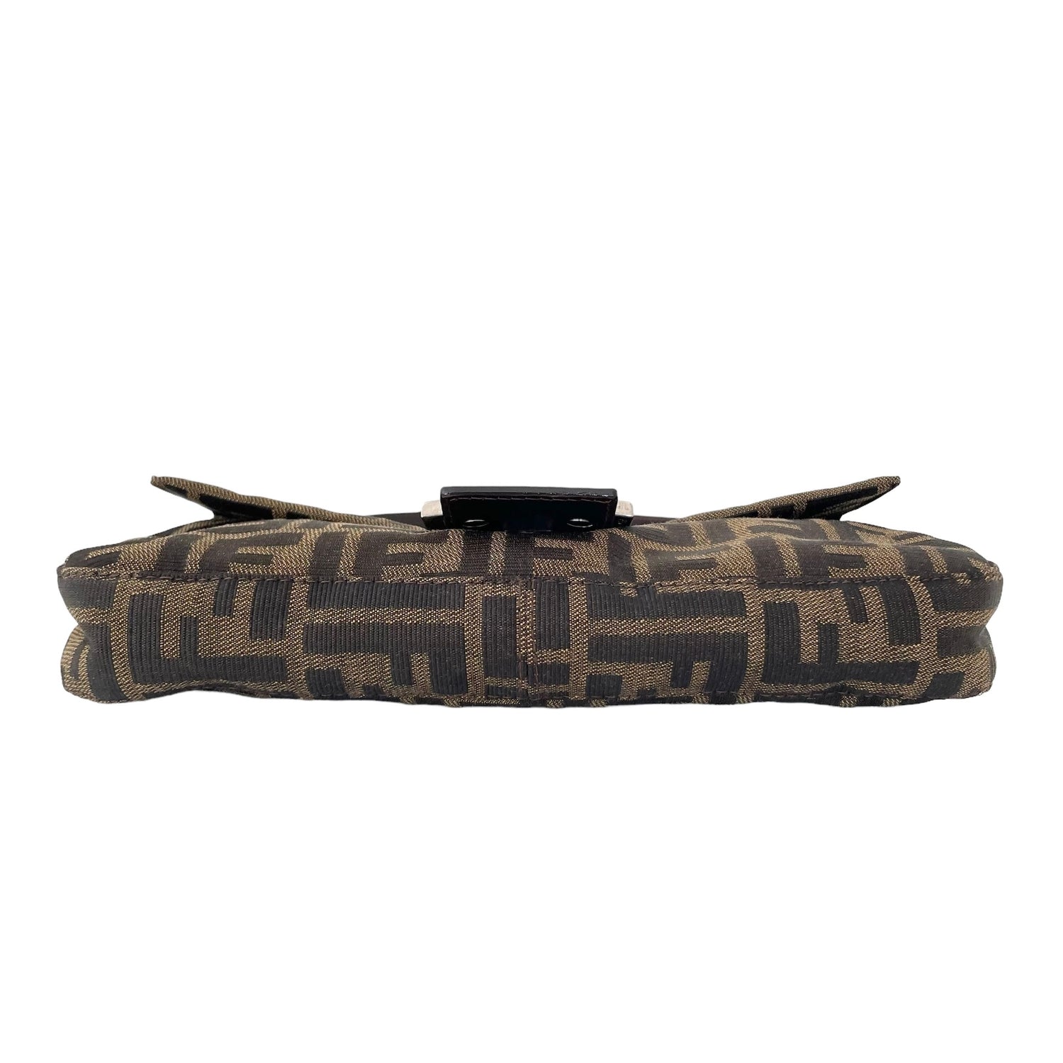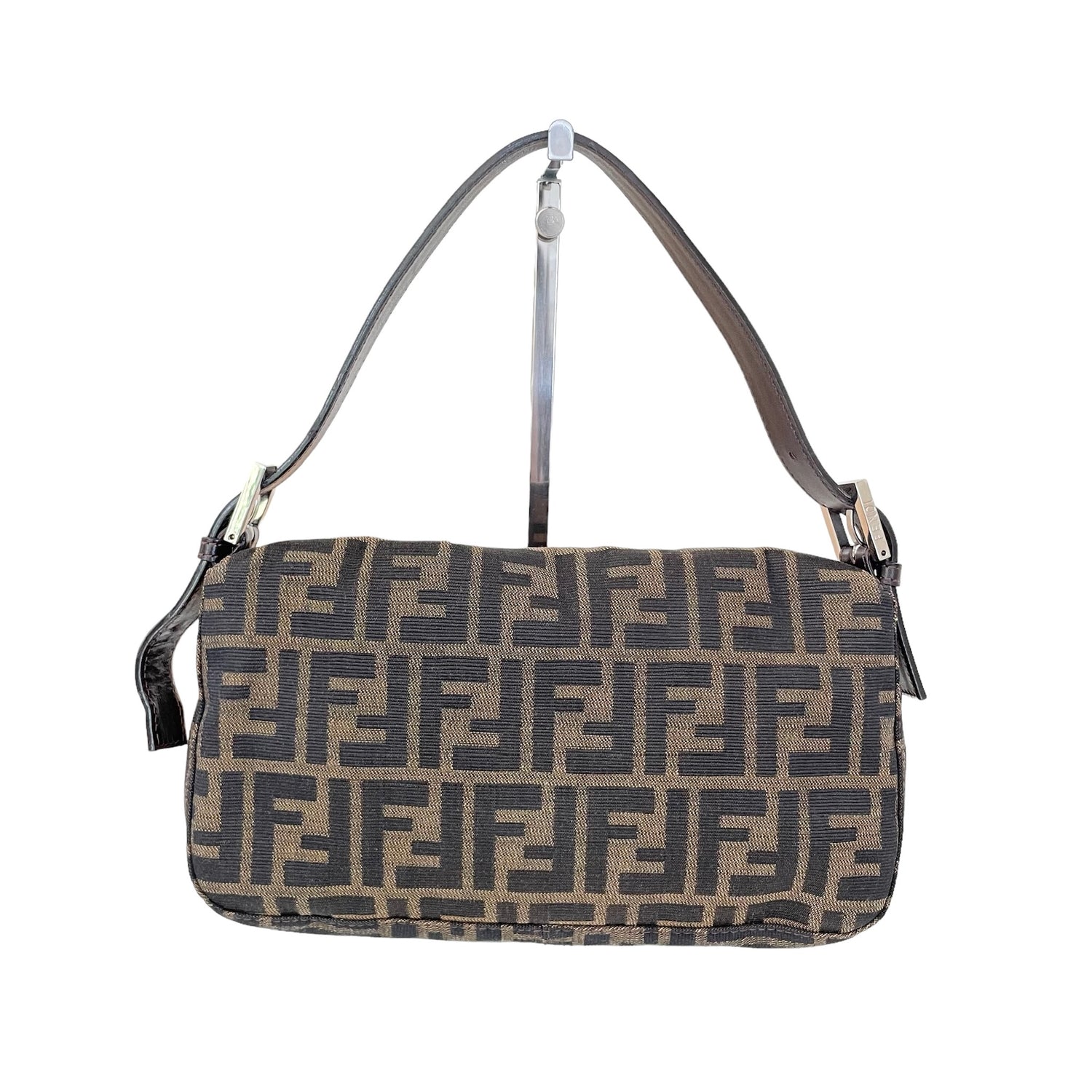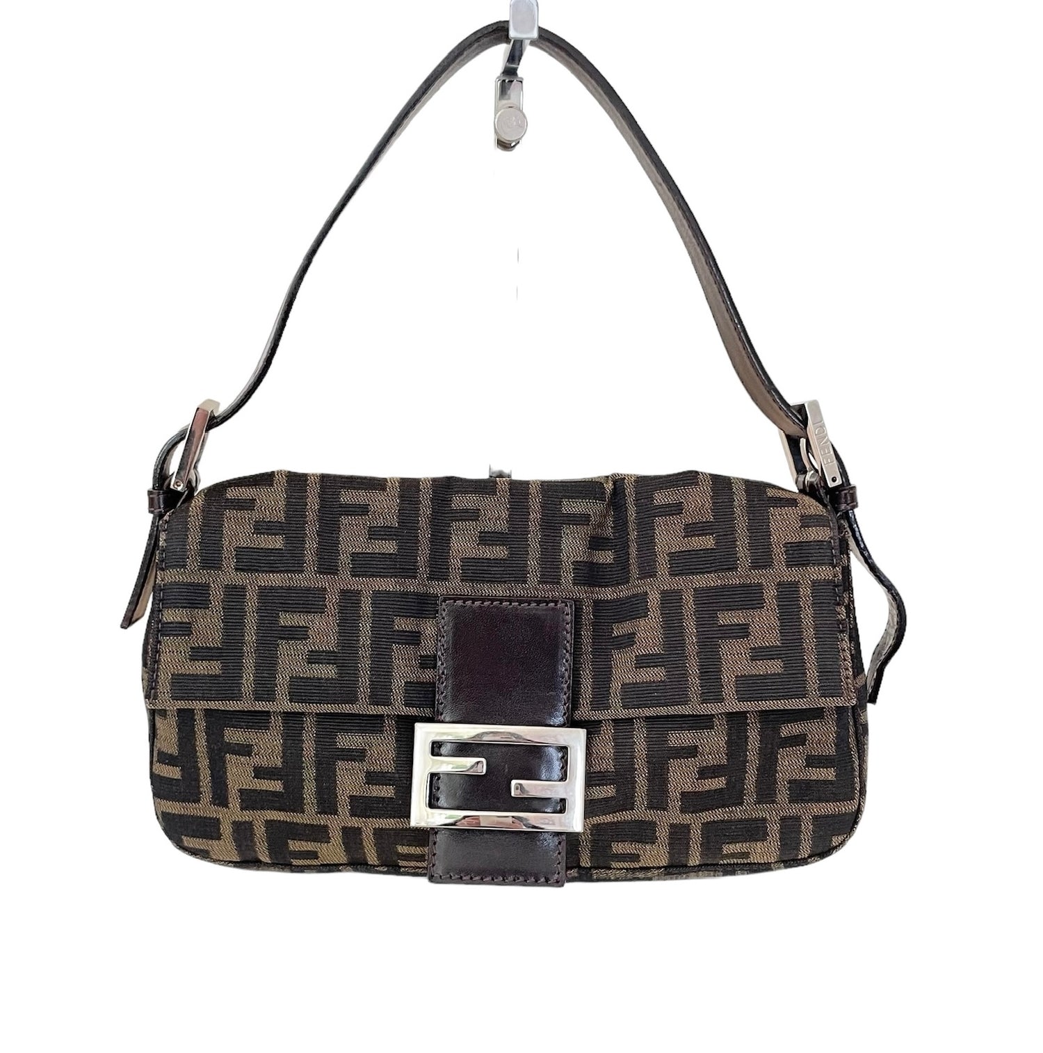 Fendi baguette bag. Iconic zucca logo canvas. Brown leather handle with silver-tone hardware and Fendi clasp. Magnetic snap closure at flap.
