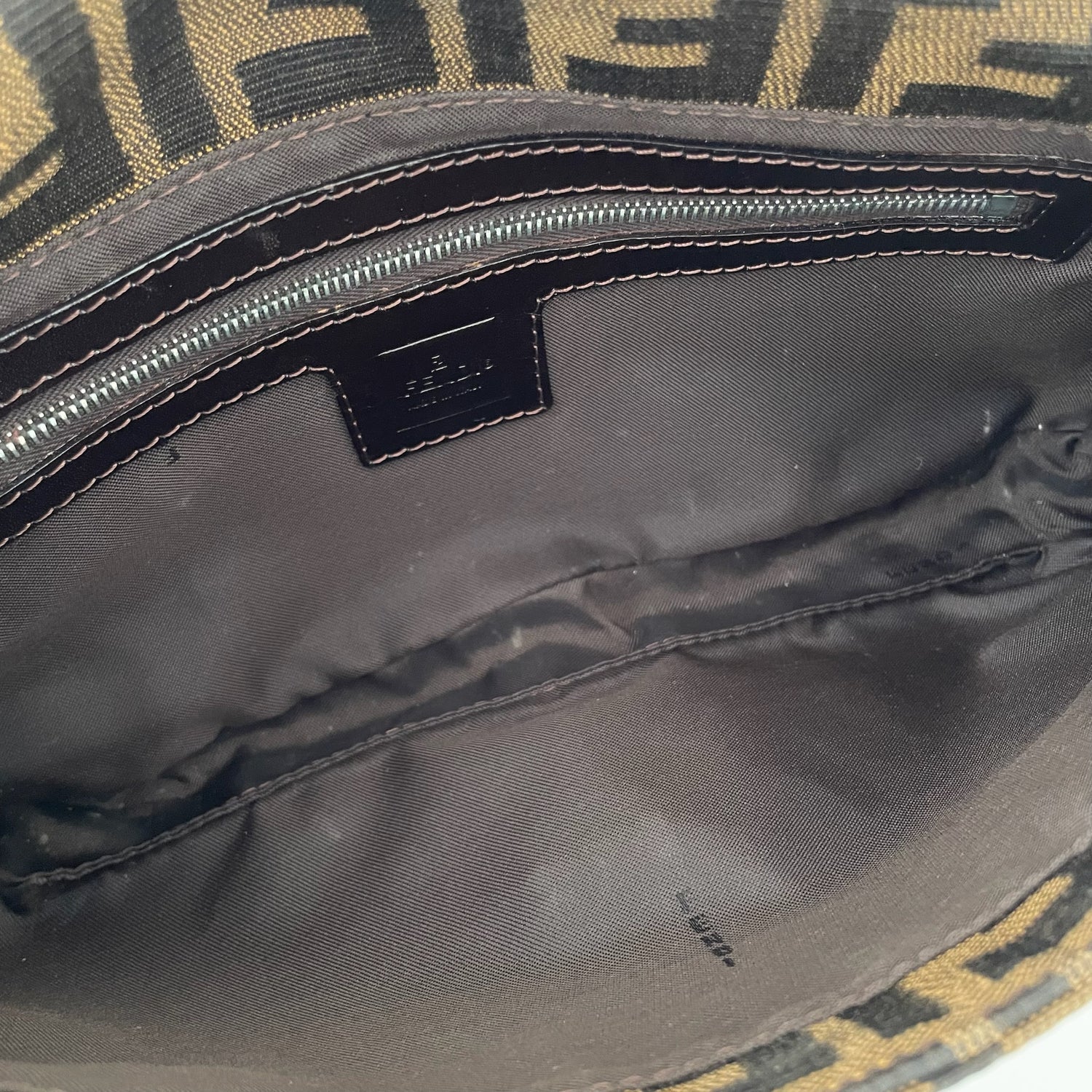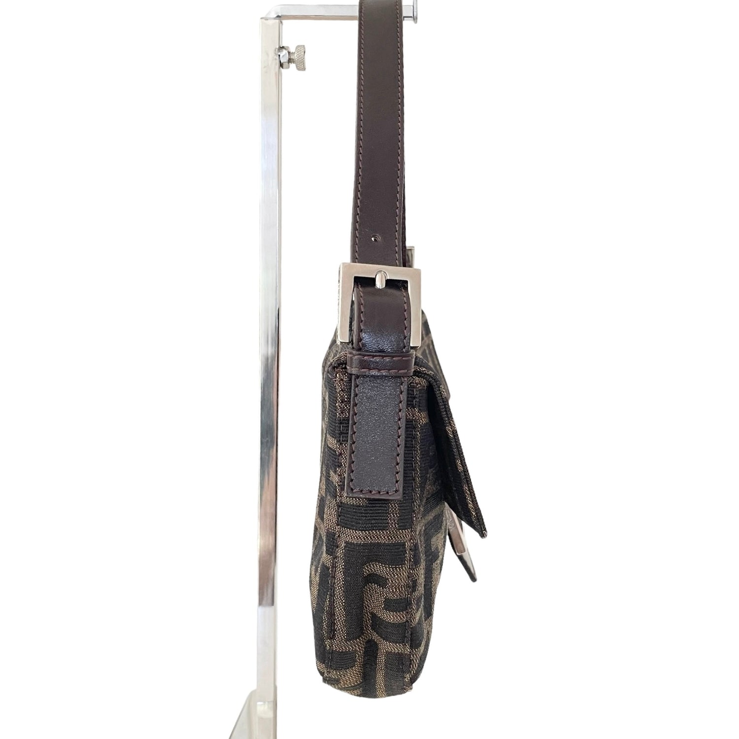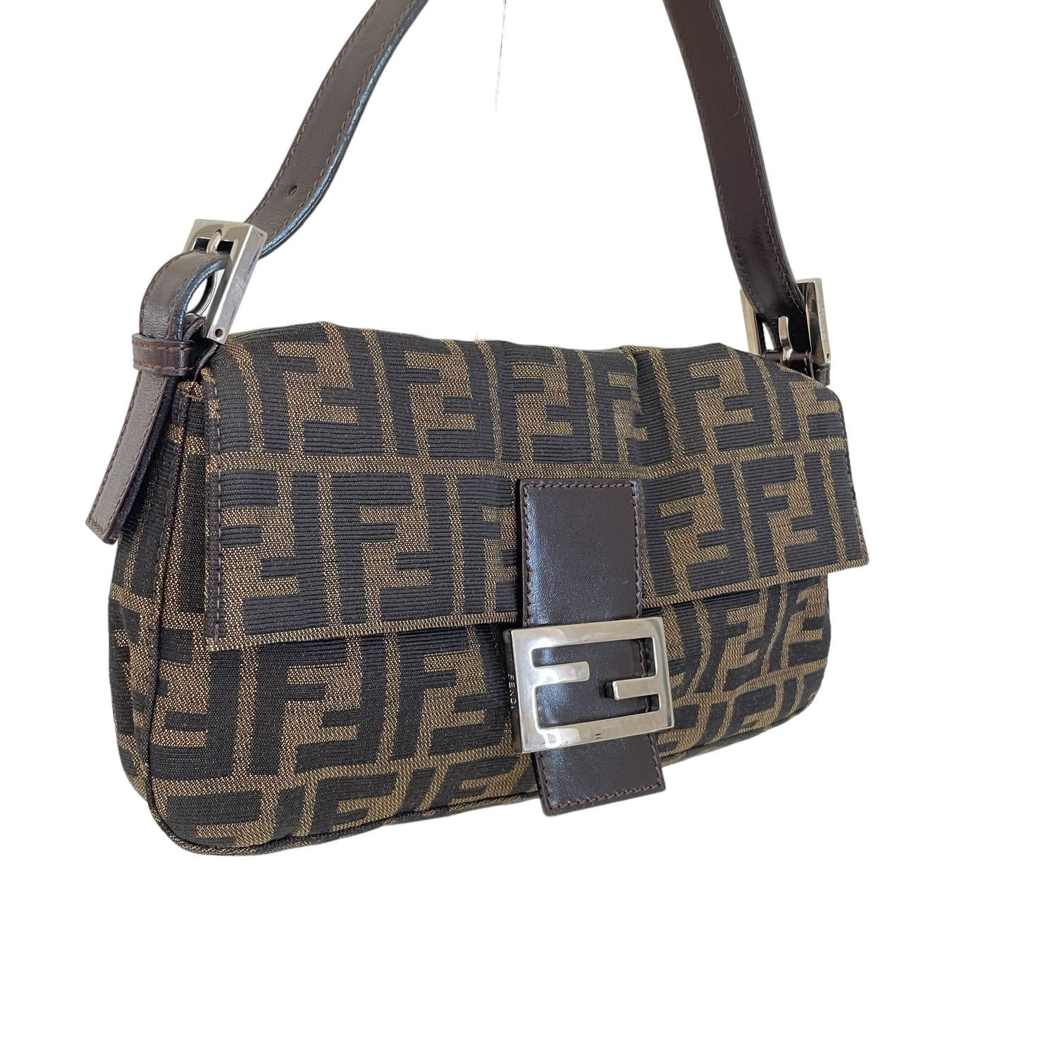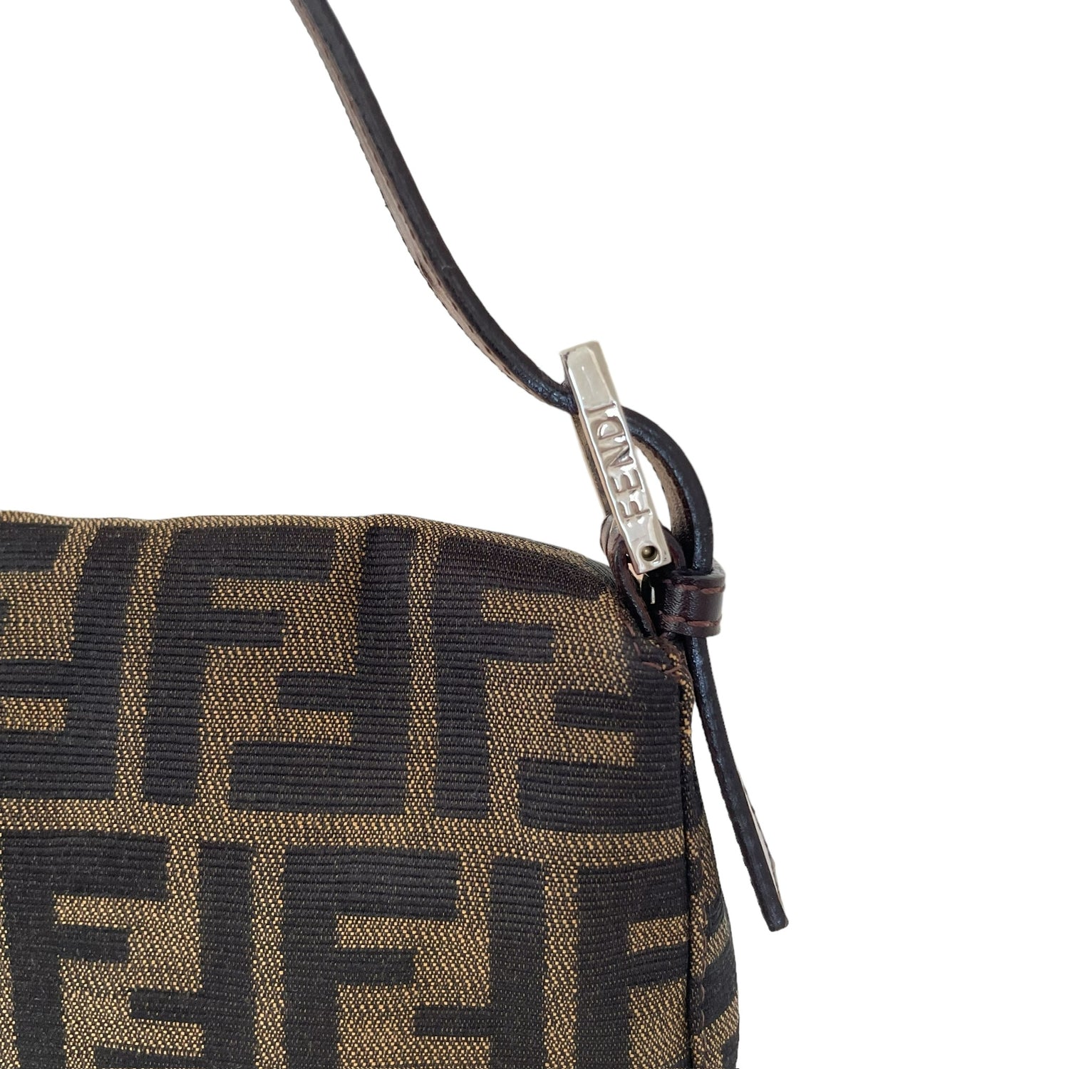 Fendi baguette bag. Iconic zucca logo canvas. Brown leather handle with silver-tone hardware and Fendi clasp. Magnetic snap closure at flap.