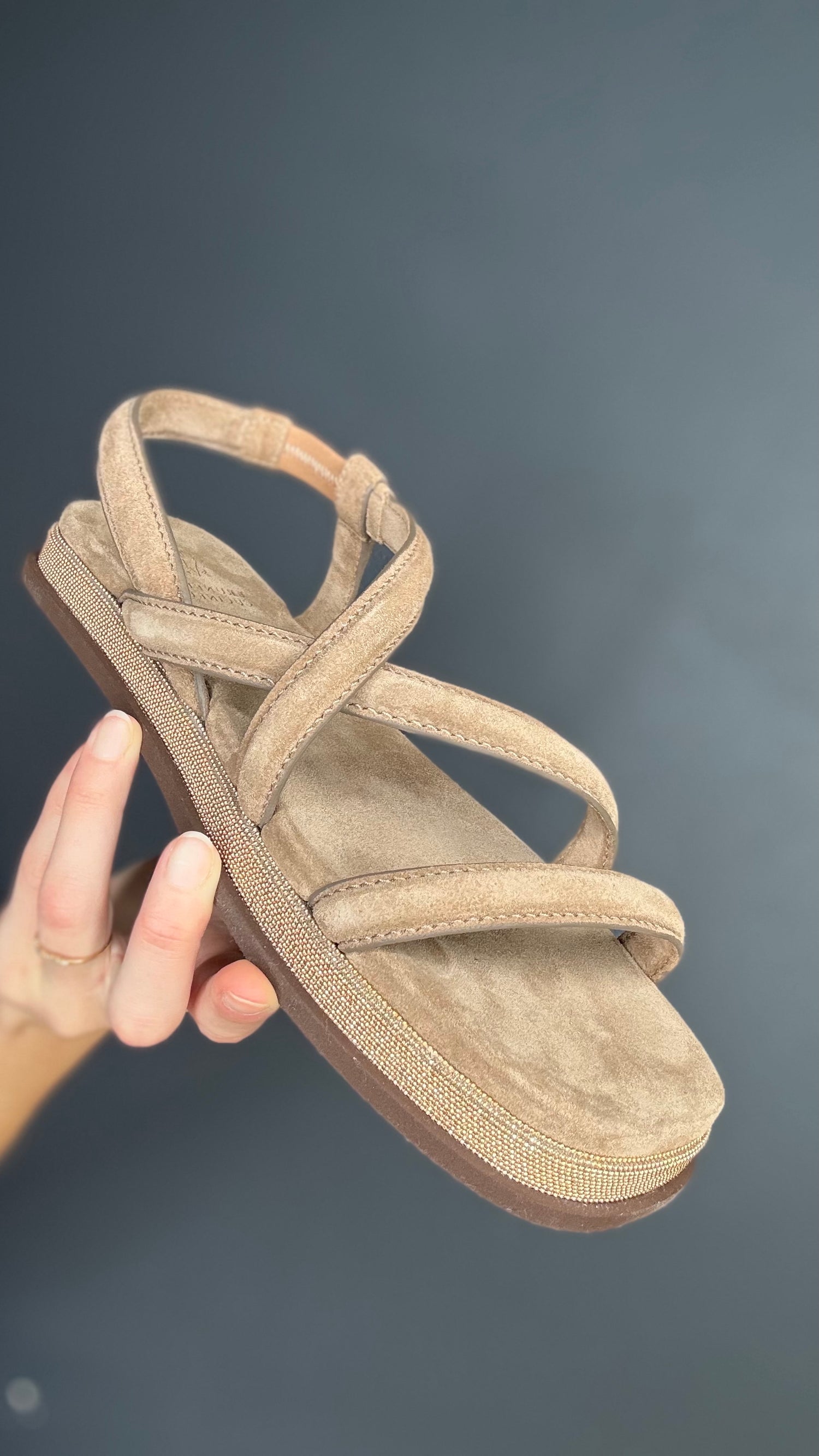 Brunello Cucinelli beige suede sandals w/ Monili trim. Designer size 38