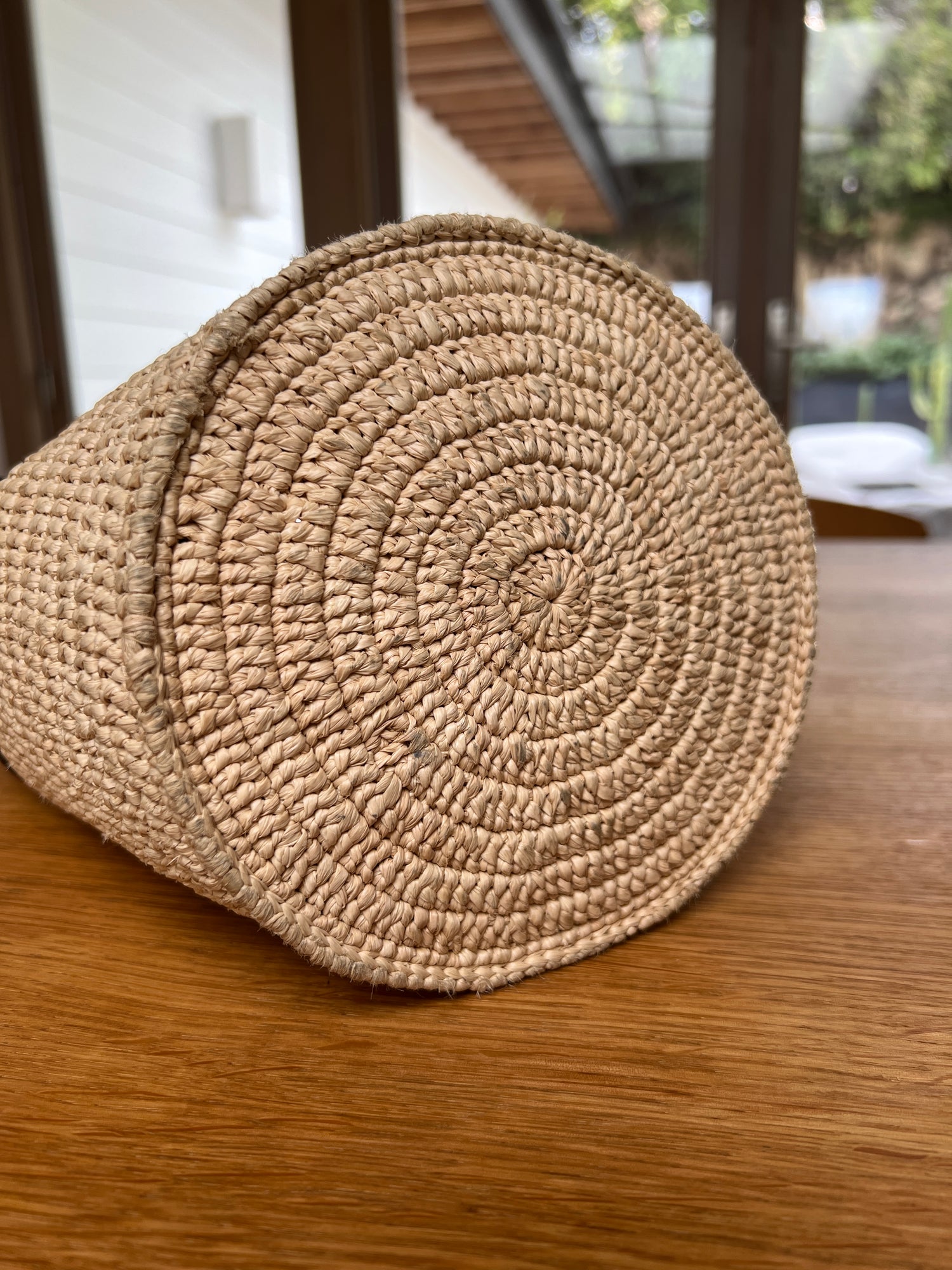 Raffia and Leather. Leather strap and buckle in silver-tone hardware.