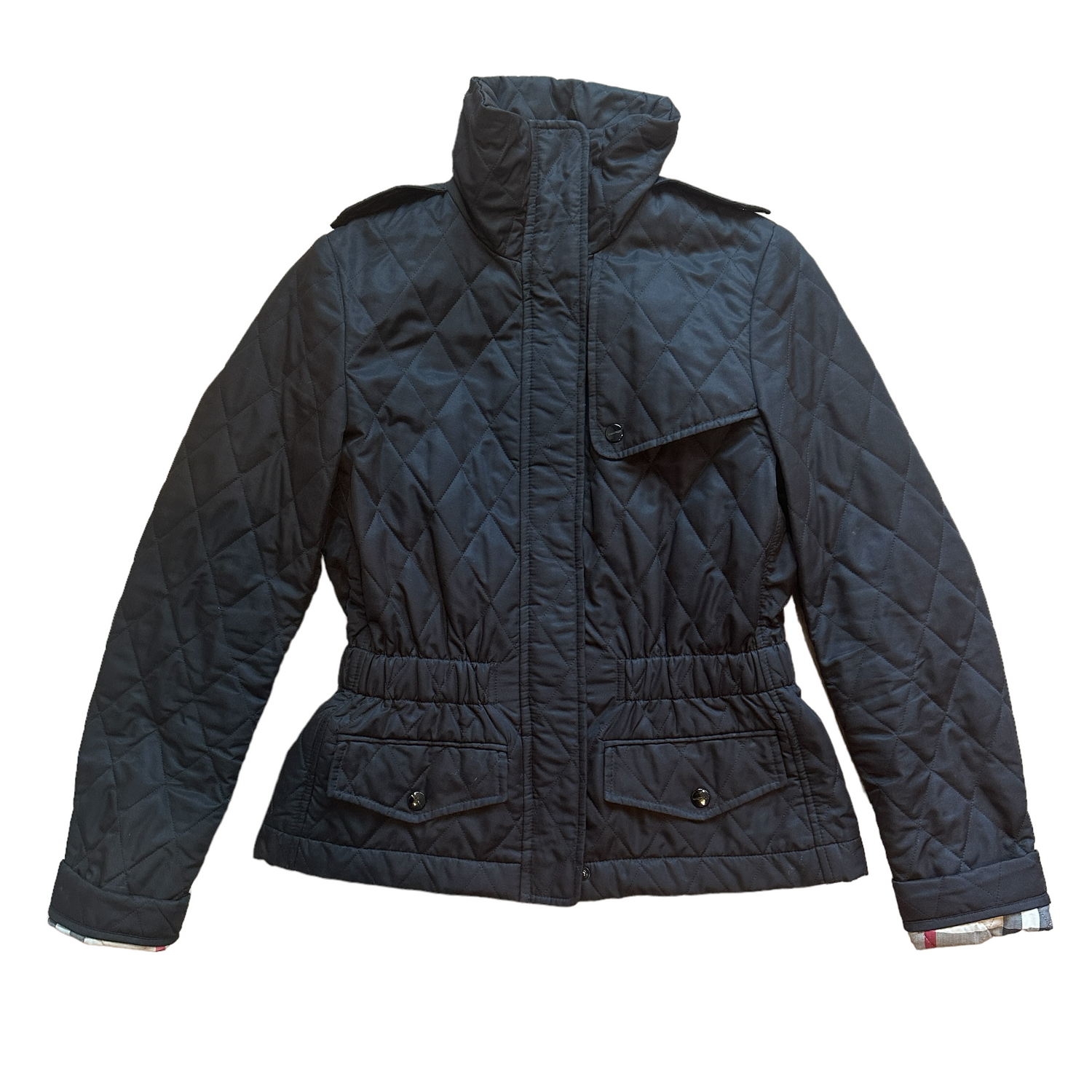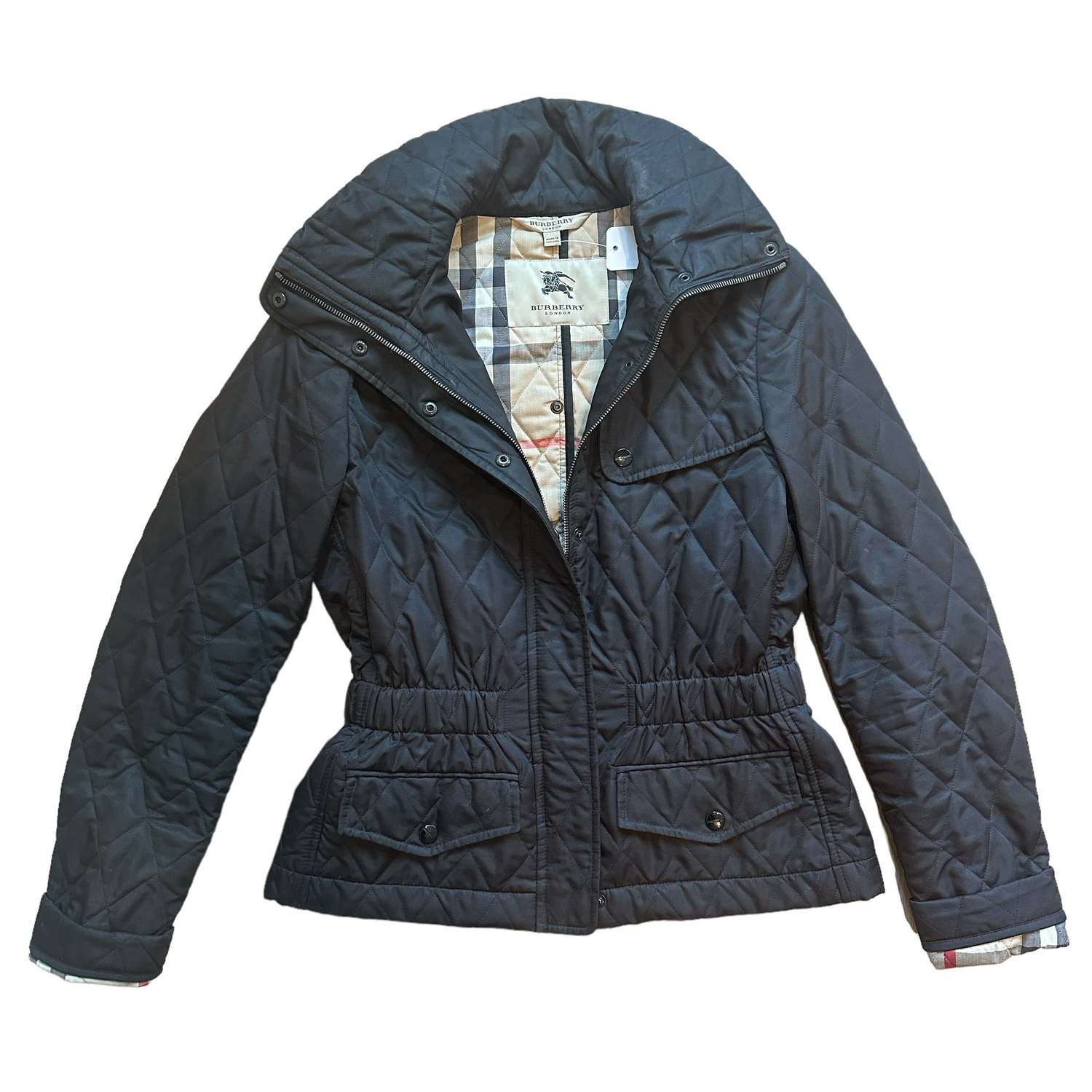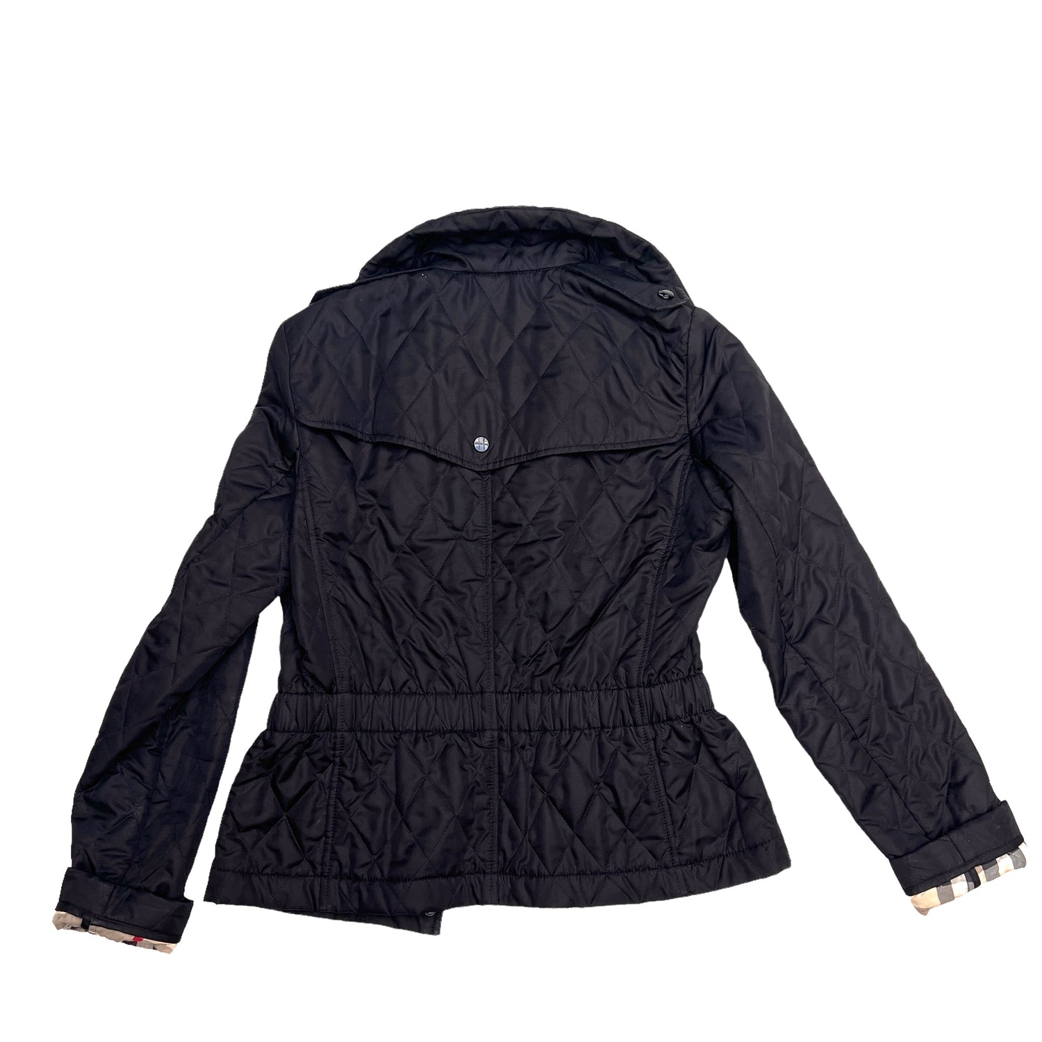 Burberry black light coat. Zipper and button closure. Iconic Burberry checker lining. Two snap button pockets.