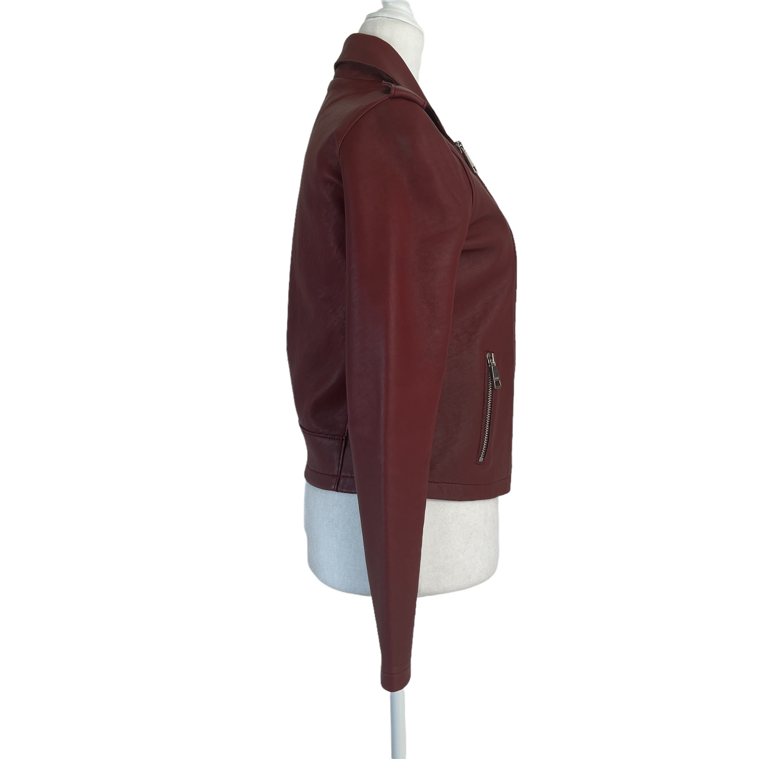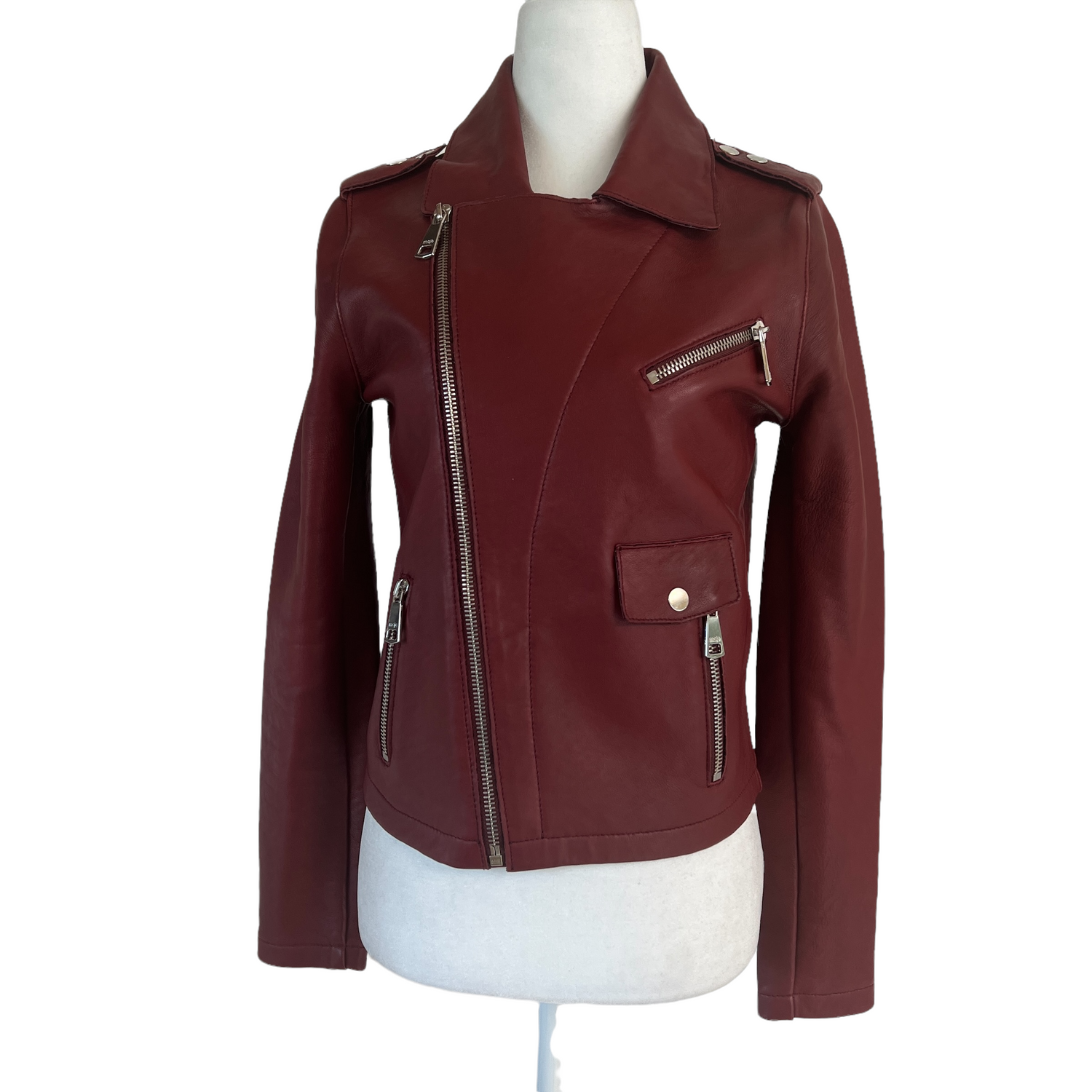 Burgundy soft leather moto jacket by French brand Maje. Silver-tone zipper and hardware. Size 40.