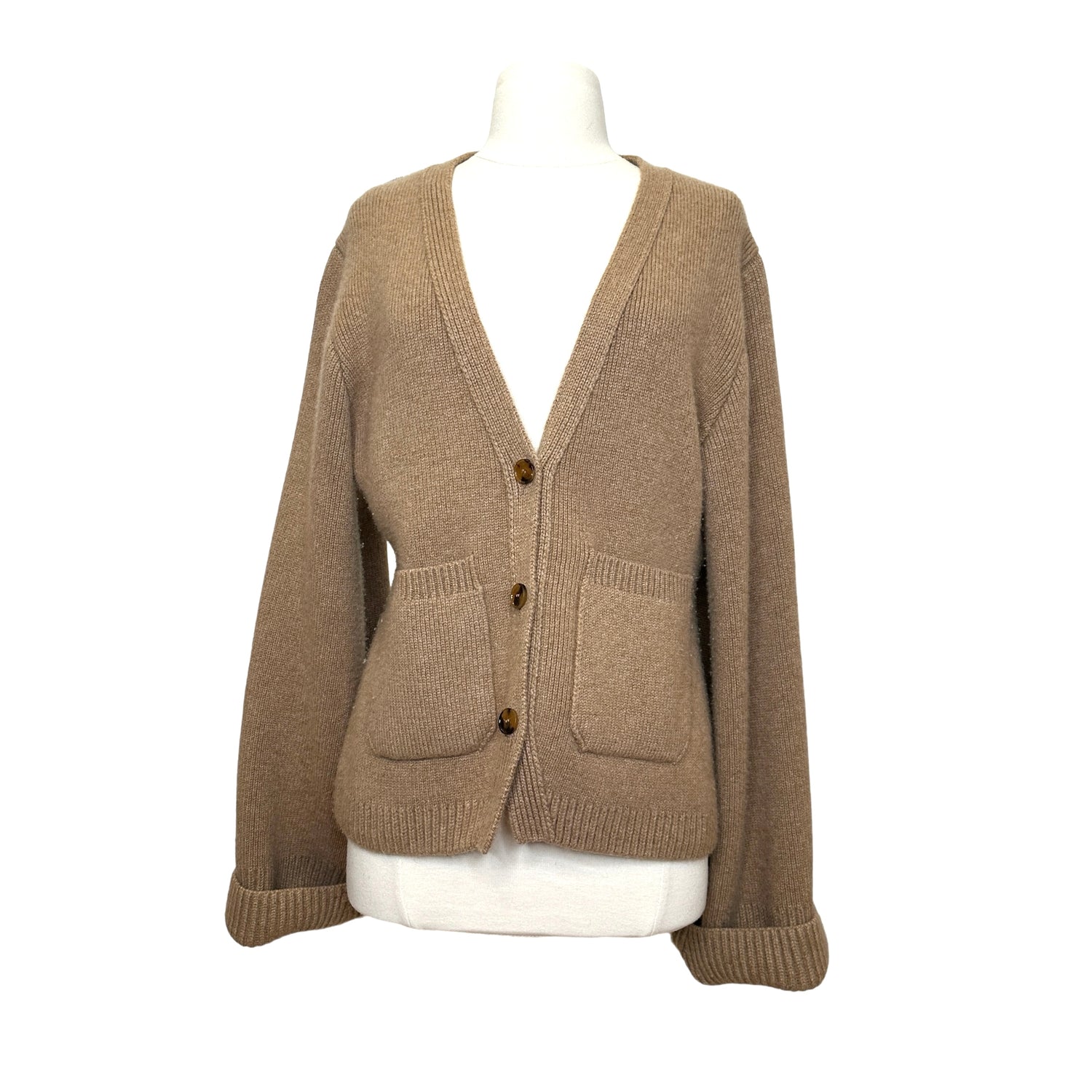 Khaite camel cardigan jacket. Button closure at front. Patch pockets. Heavy-weight cashmere to be worn as a jacket. Designer size medium.