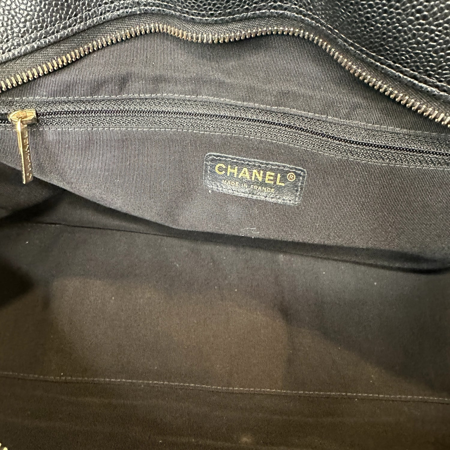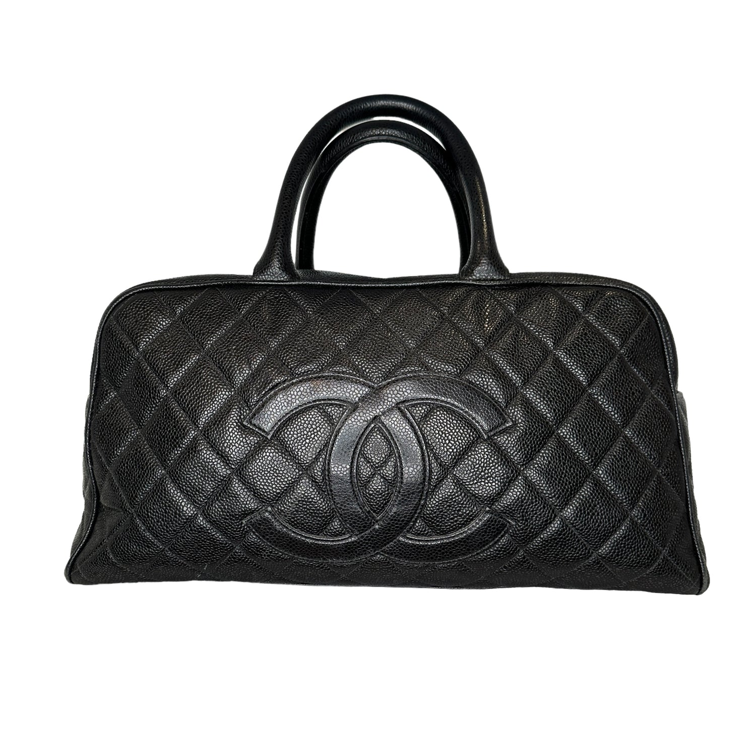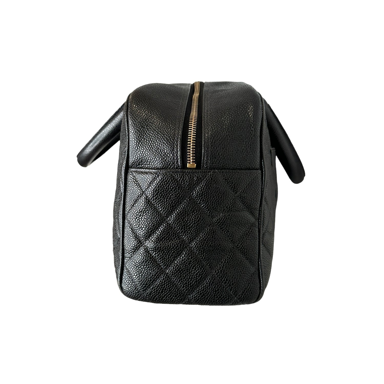 Chanel black bowler bag. Black caviar leather. Black grosgrain lining. Zipper closure at top. One interior zipper pocket. Protective feet at base.
