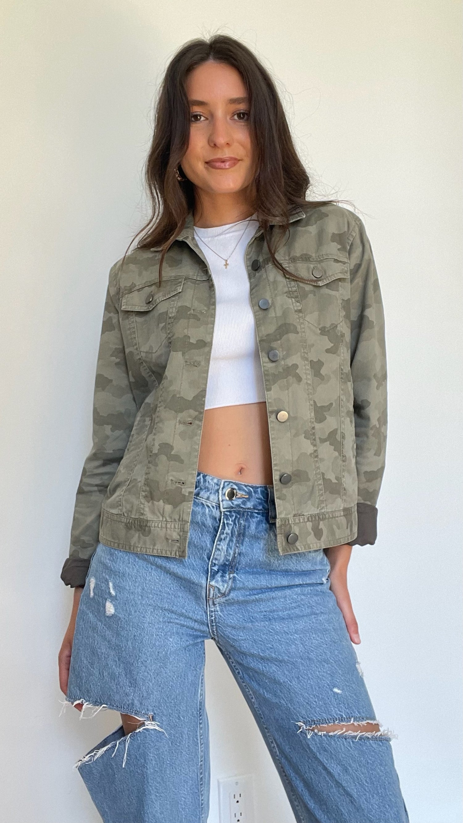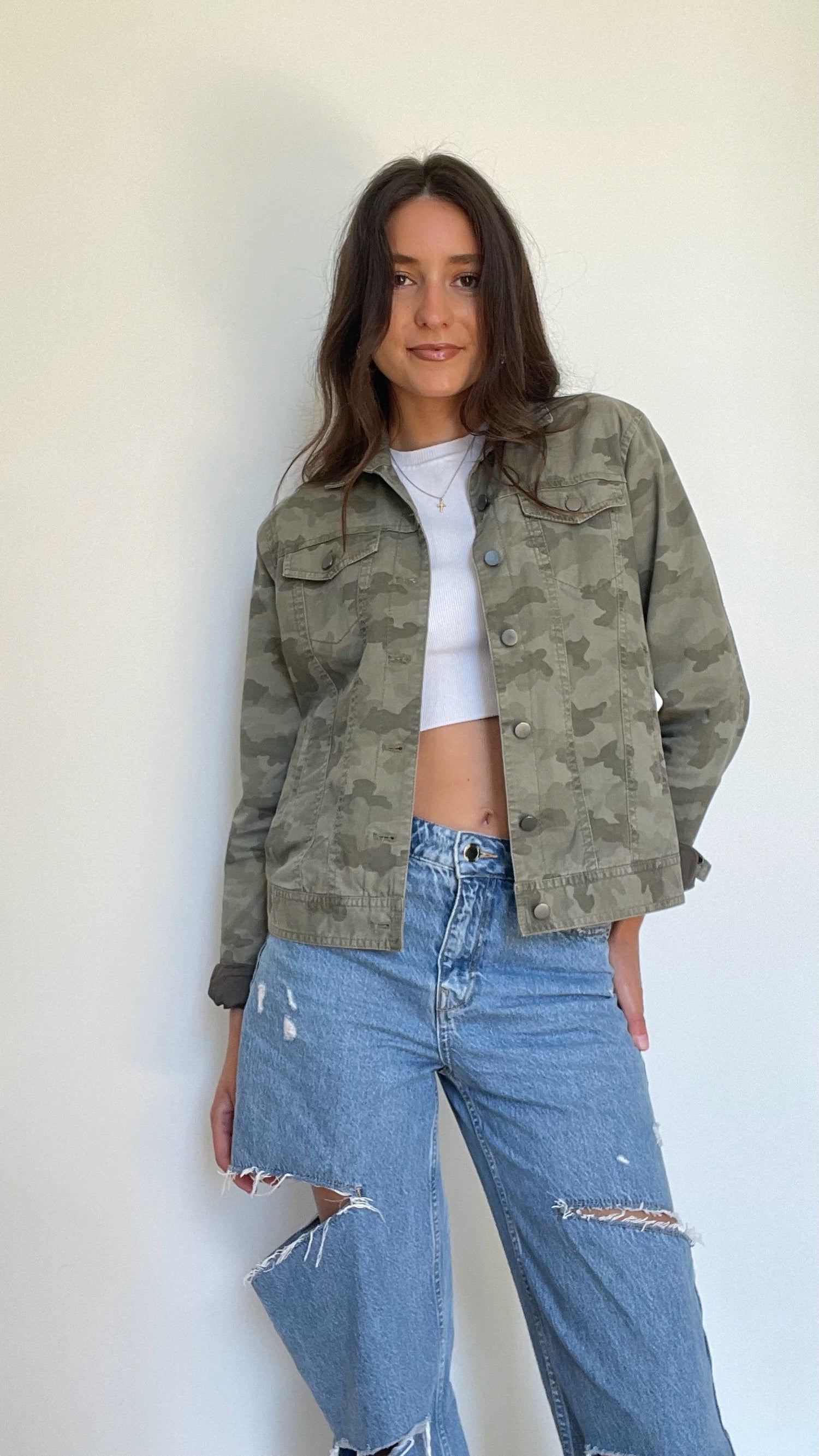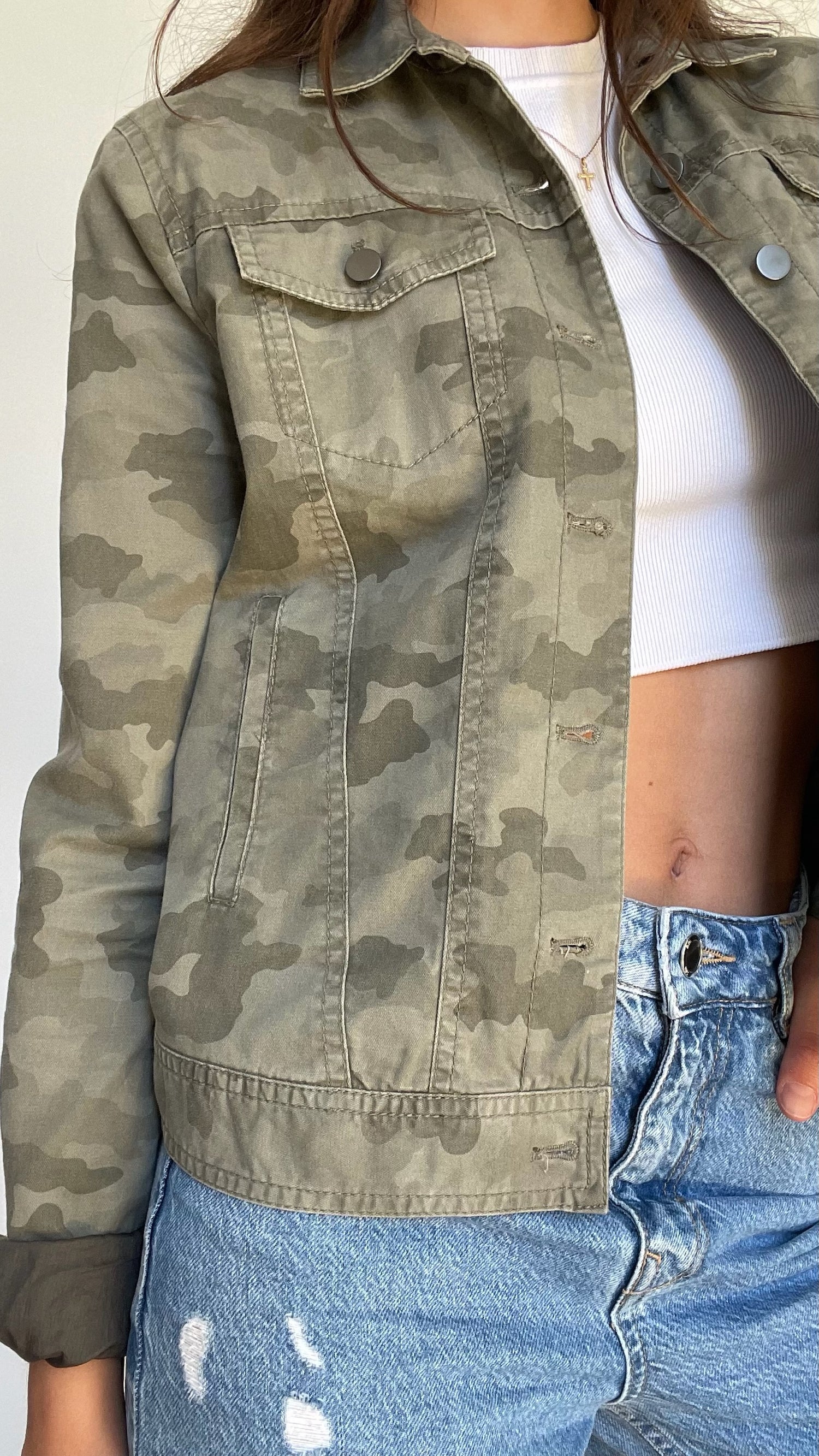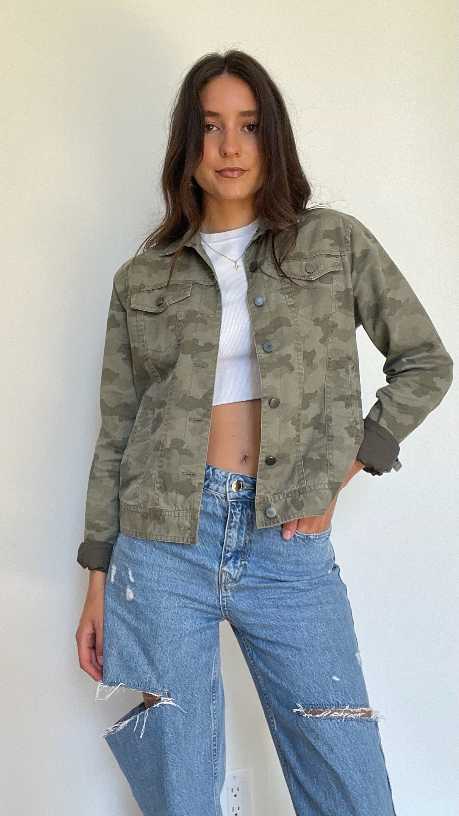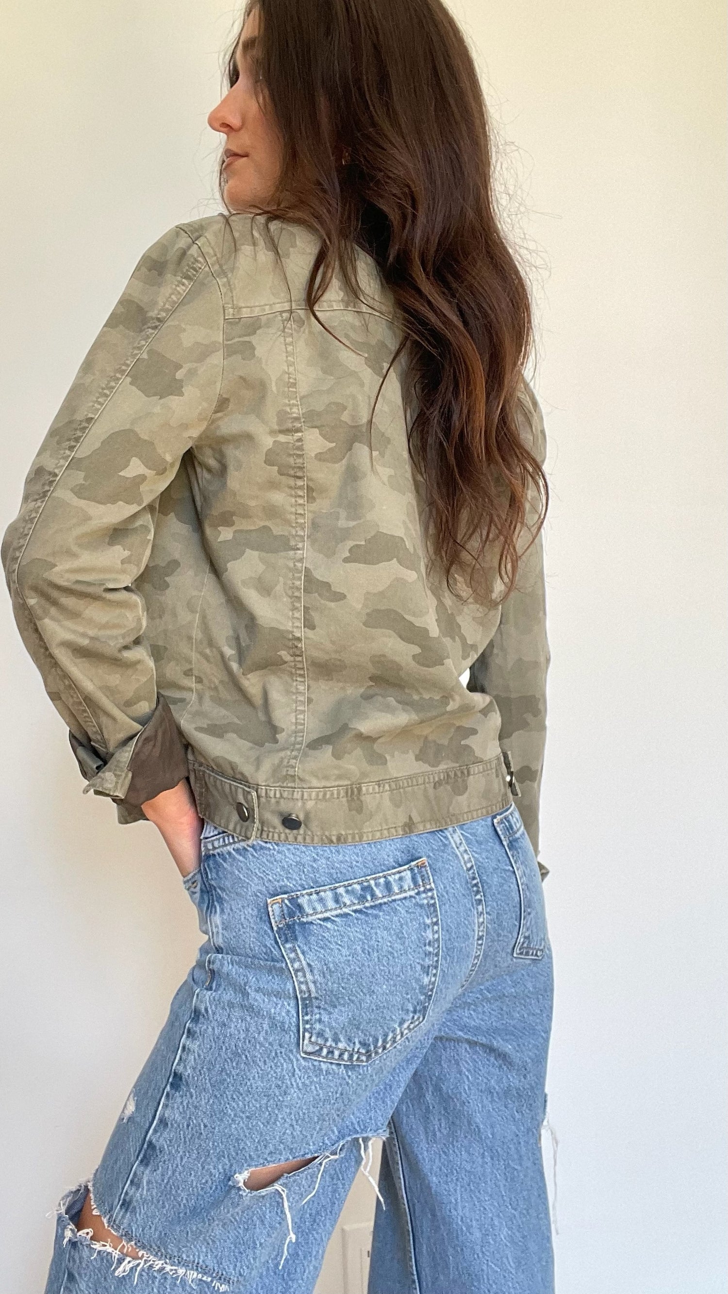 ATM military print denim jacket. Pointed collar. Button closure at front. Slit pockets. Designer size small.