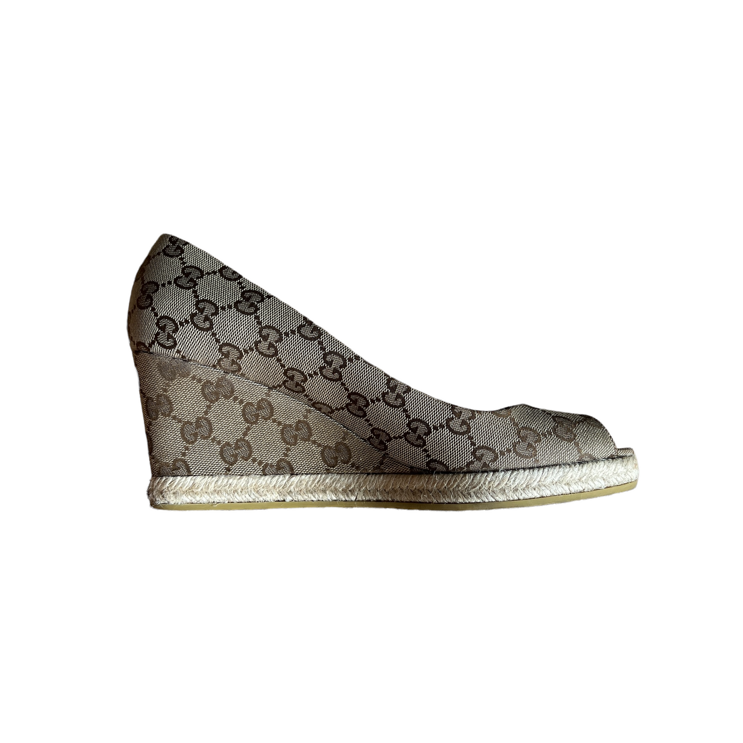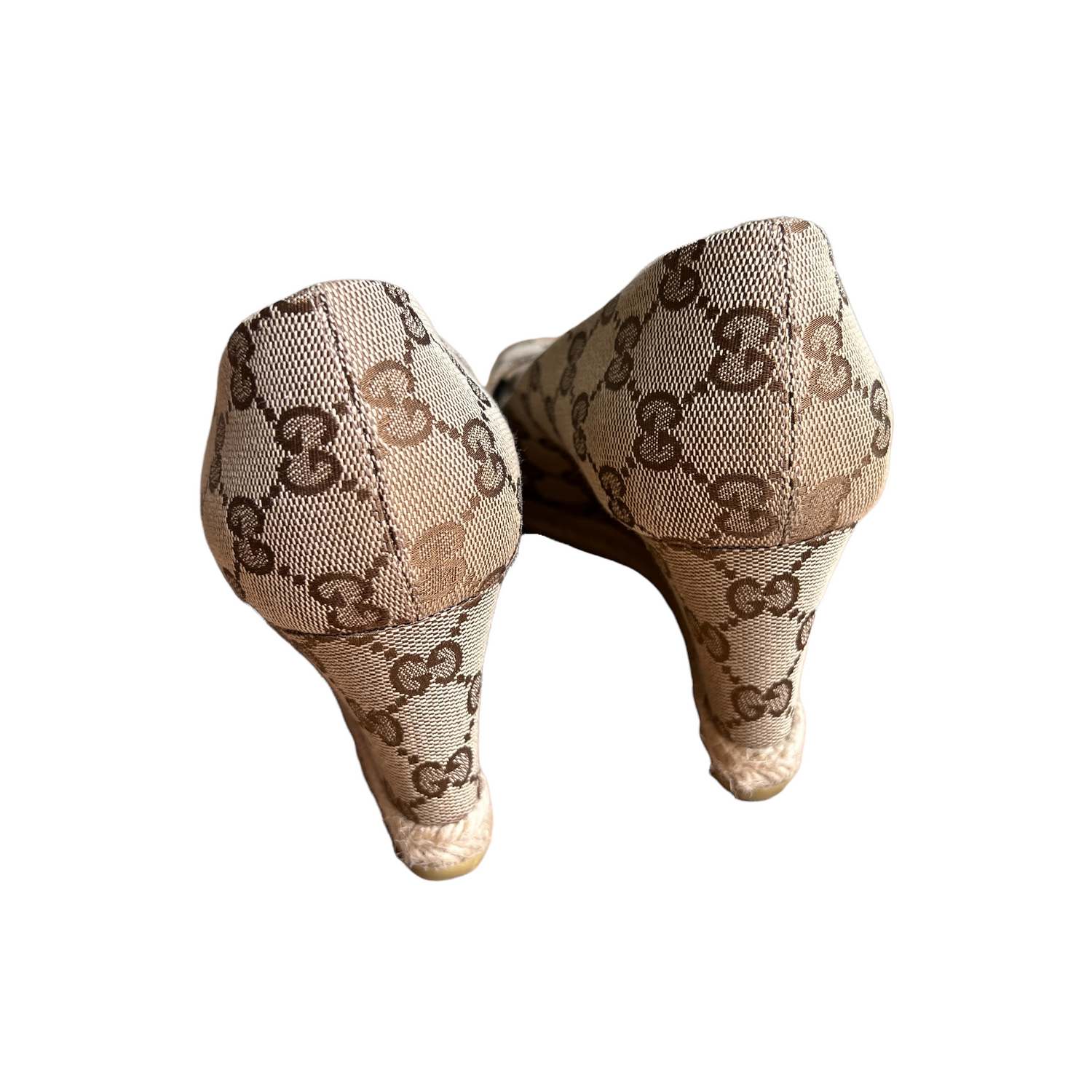 Gucci GG monogram canvas wedge heels. Raffia detail at bottom. Open toe. Designer size 39.5.
