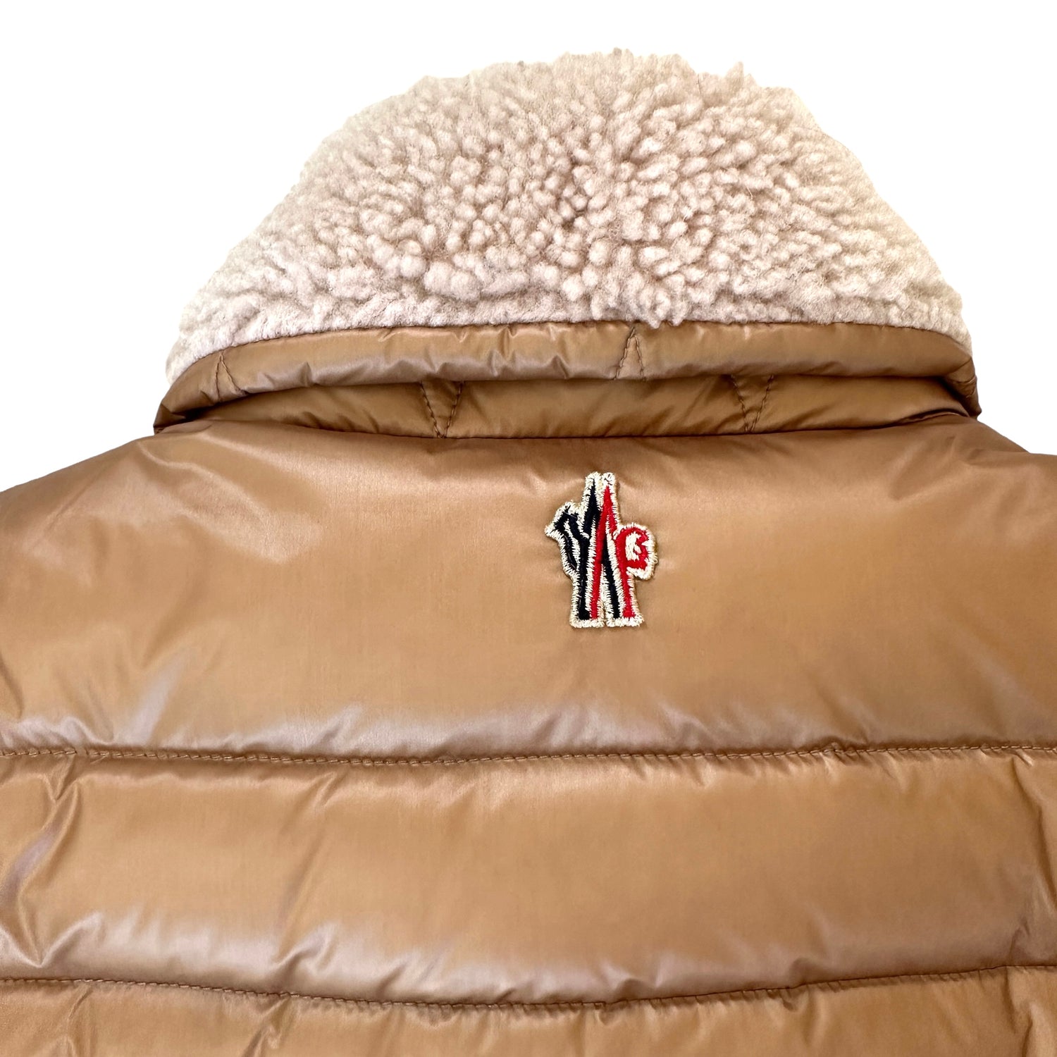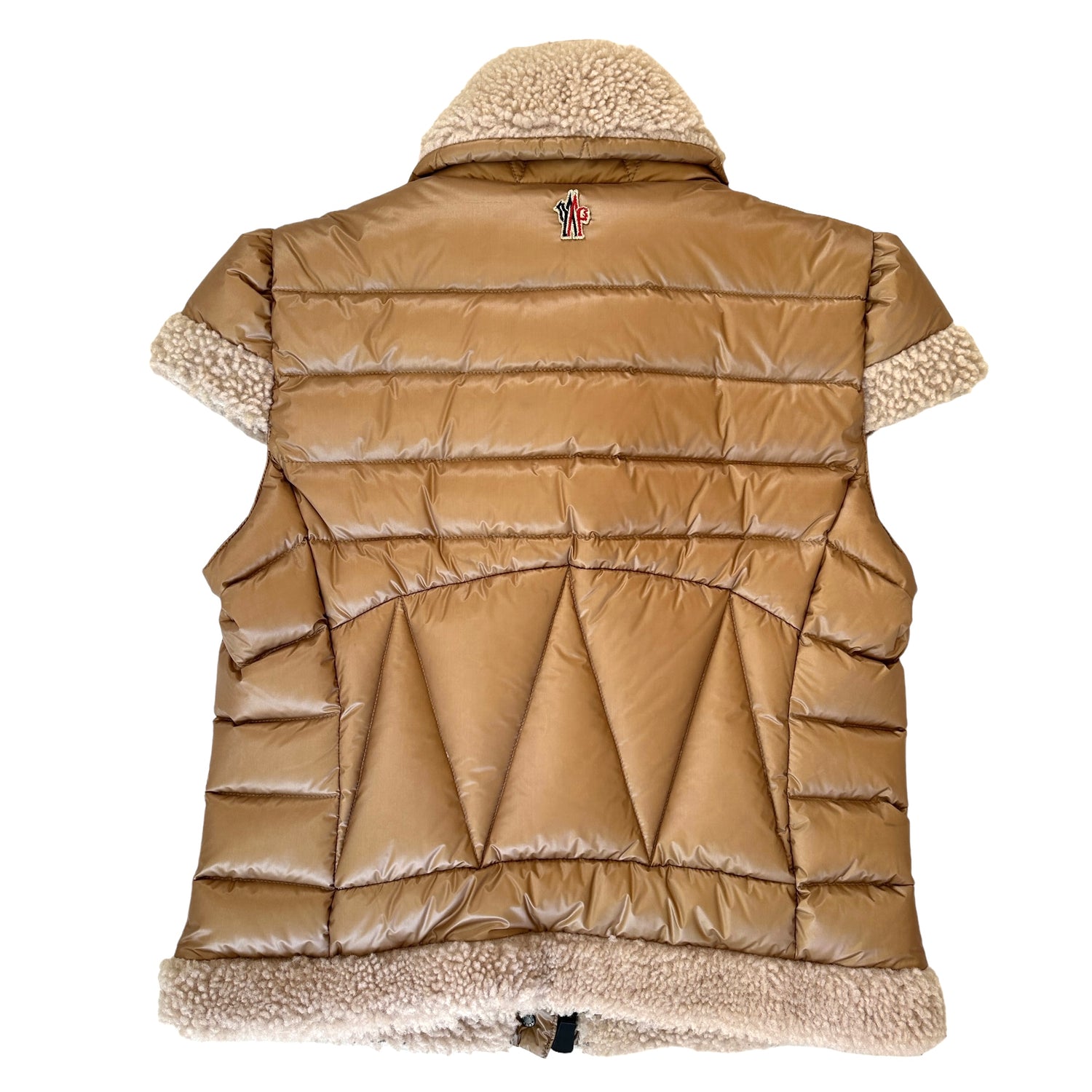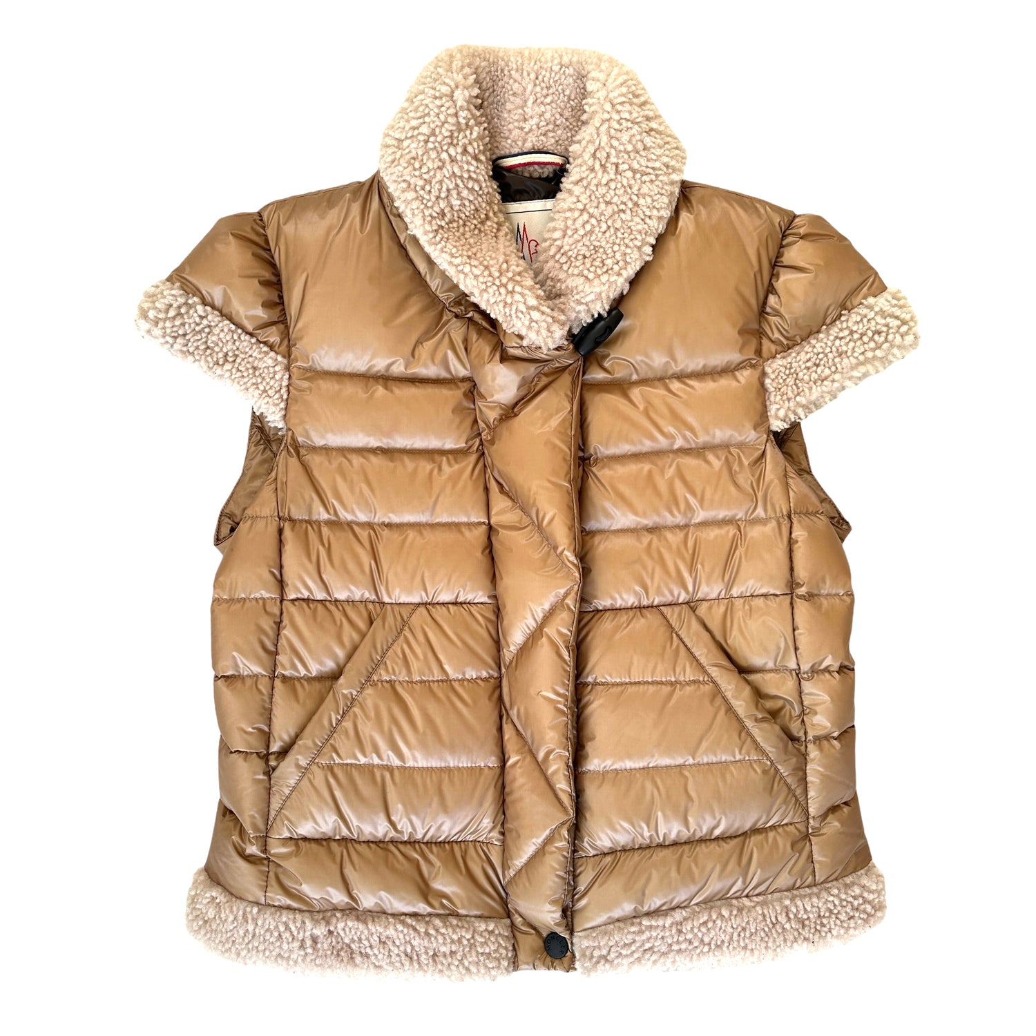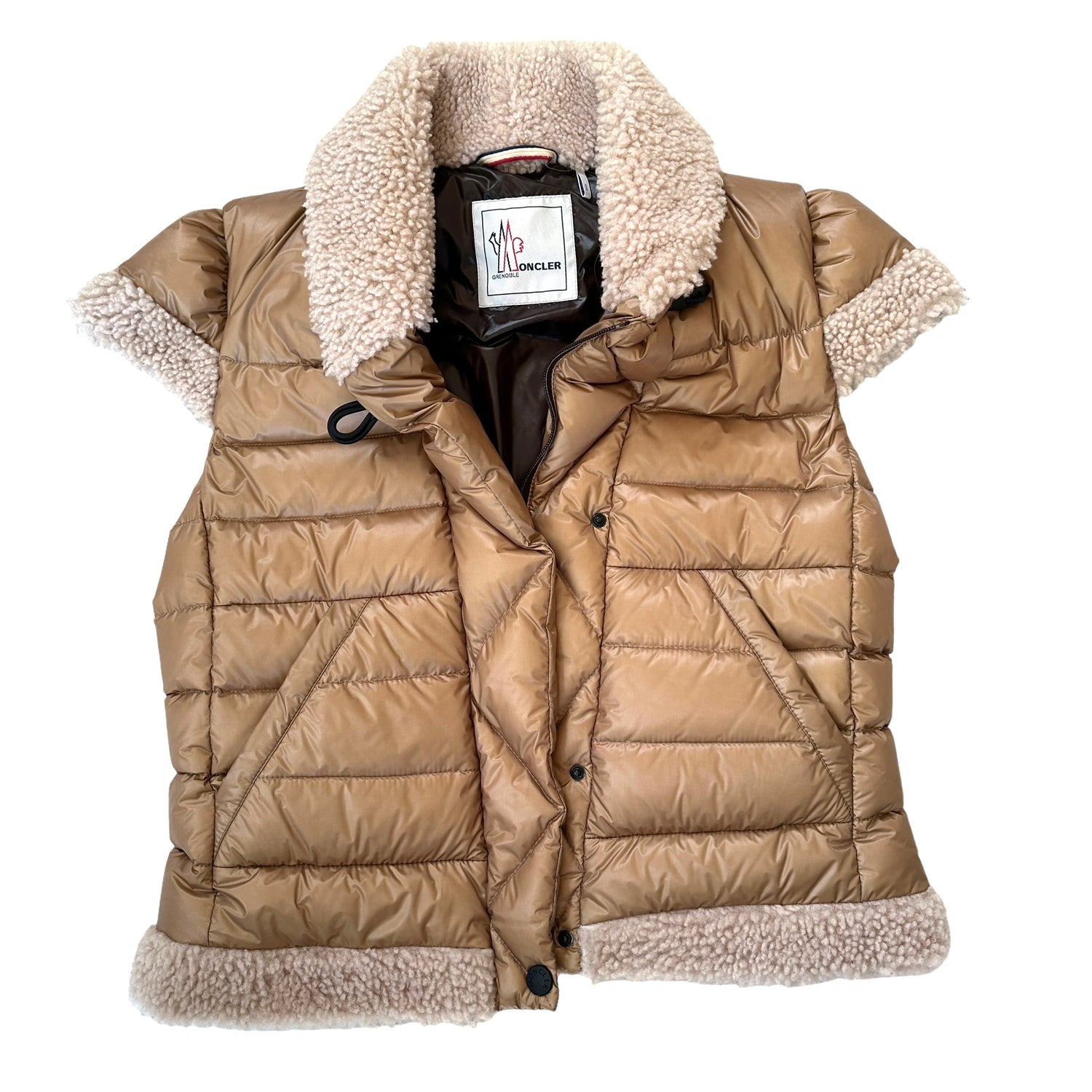 Moncler caramel color vest. Sheep shearling trims. Zipper closure at front with snap buttons. Two pockets. Puffy jacket perfect for mid/cold season. Designer size 4.