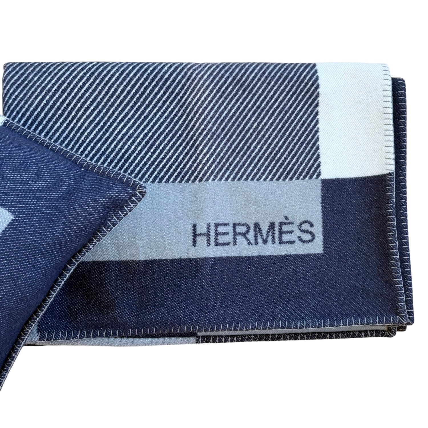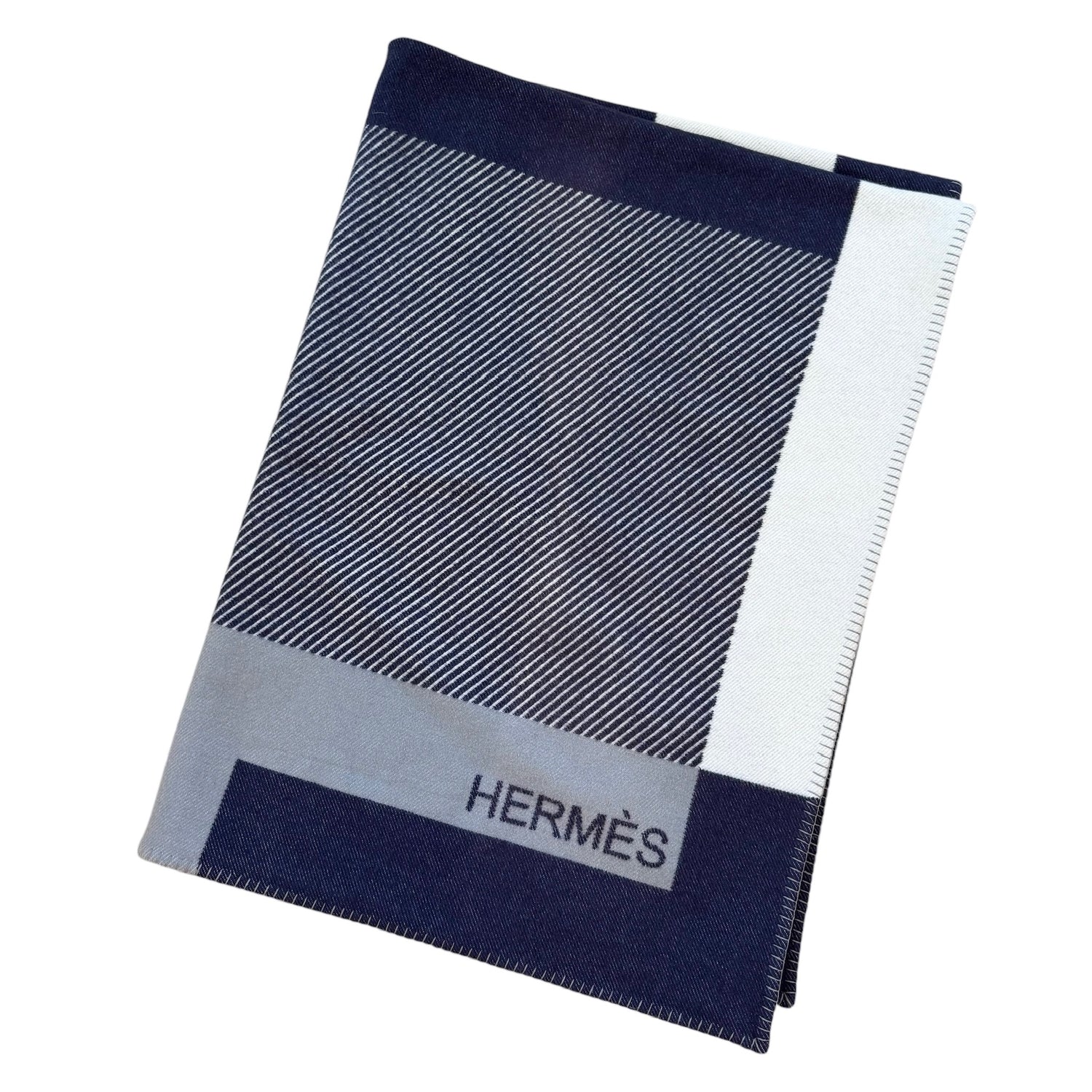 Hermes large cashmere home throw. Navy and white print. Hermes logo at corner.