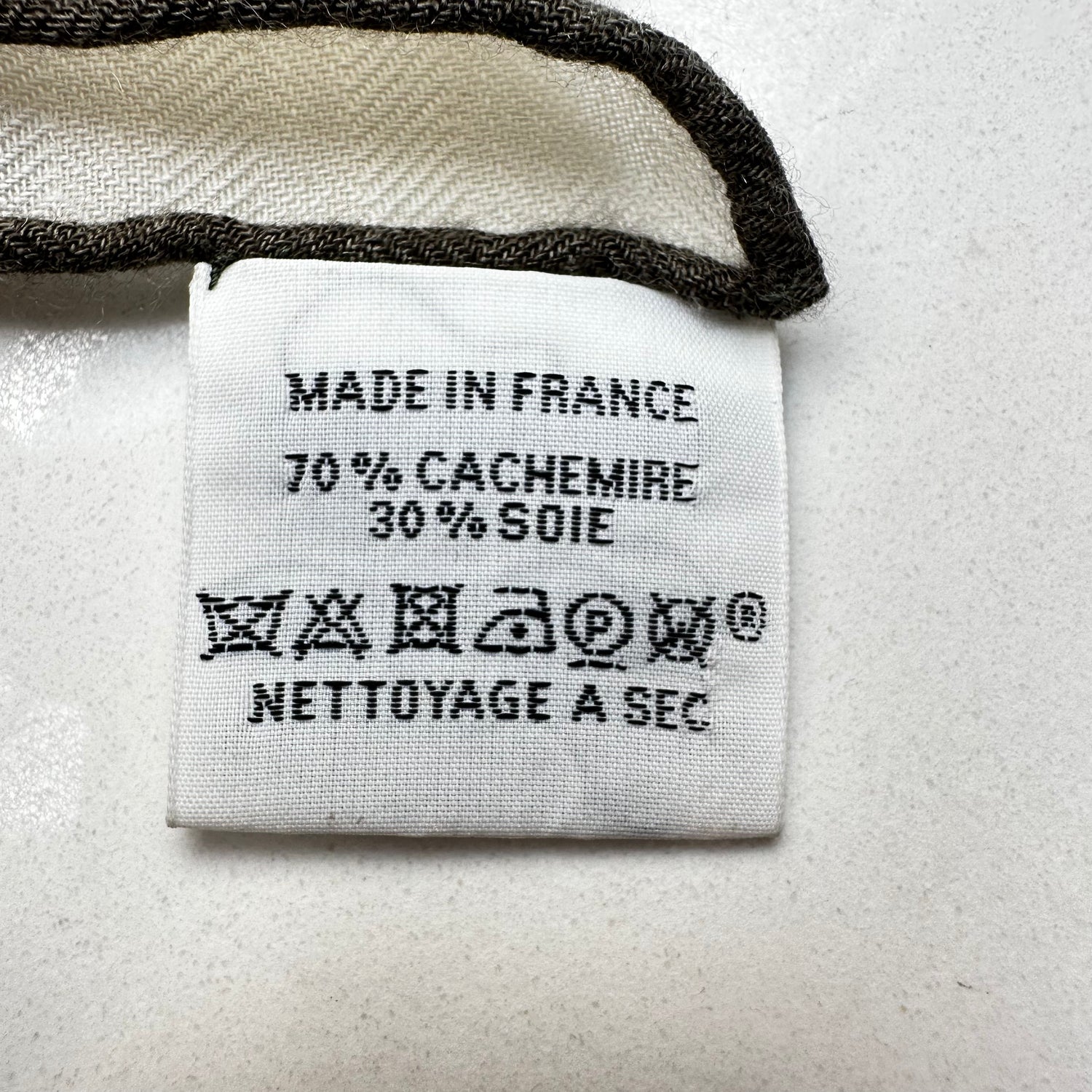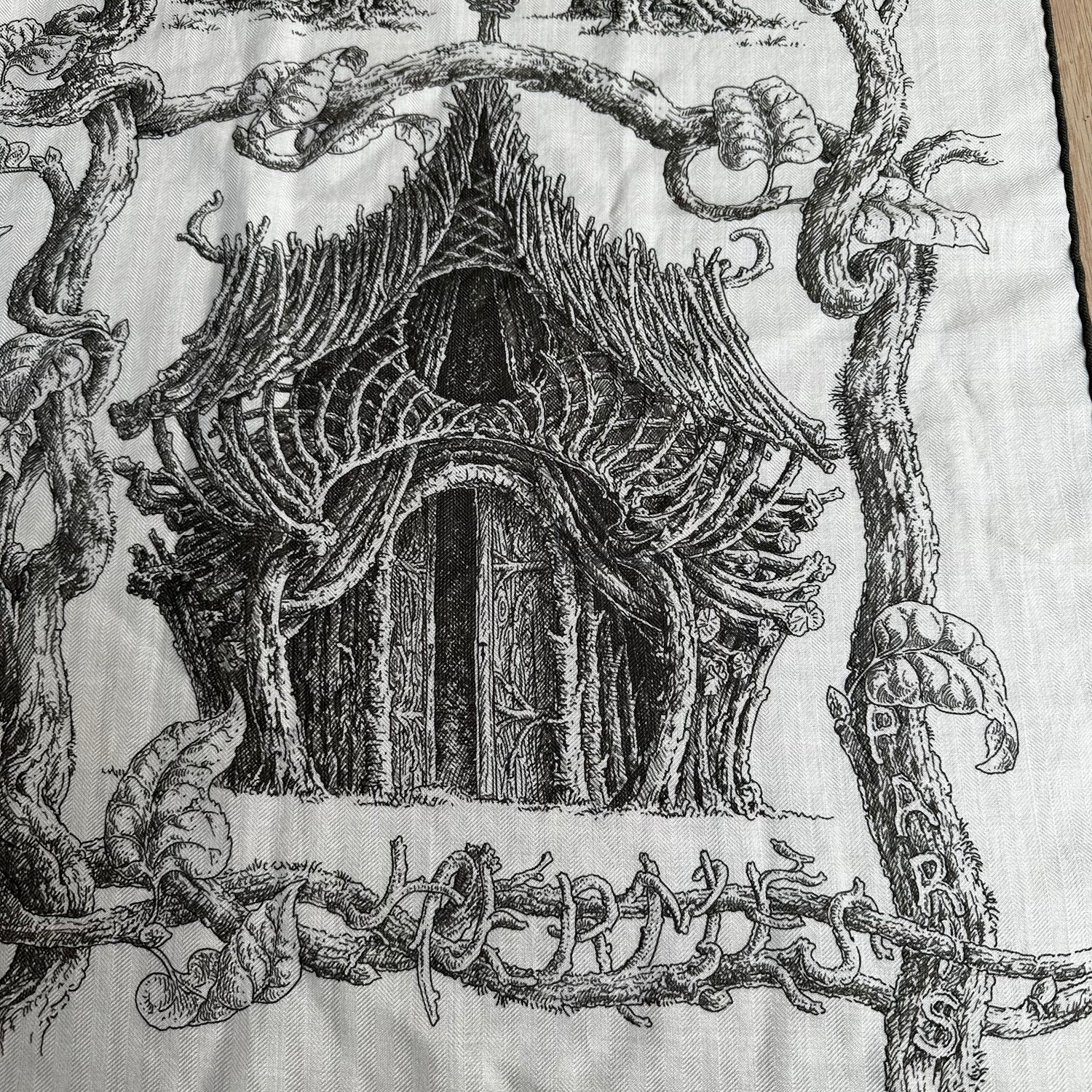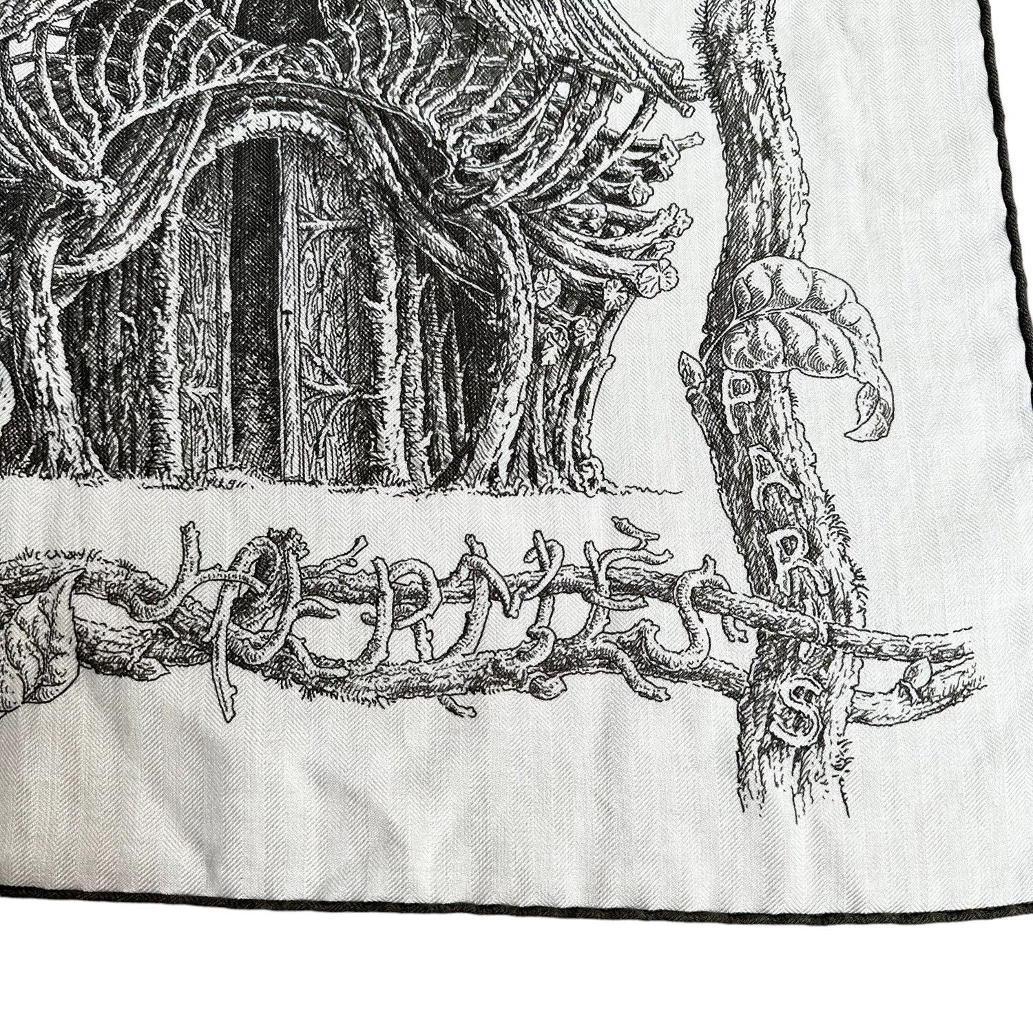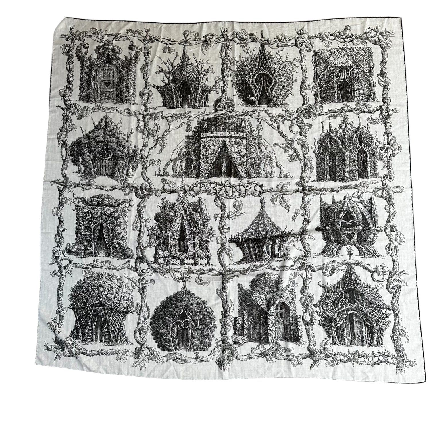 Hermes large cashmere scarf. "Cabanes" exclusive theme. Black and white cashmere. Square. Hermes print at corner.