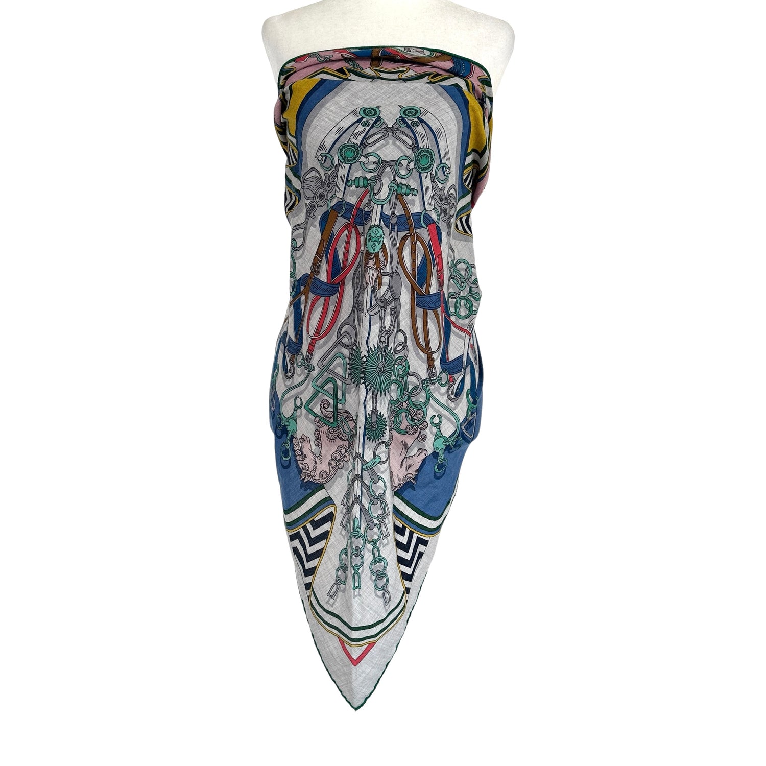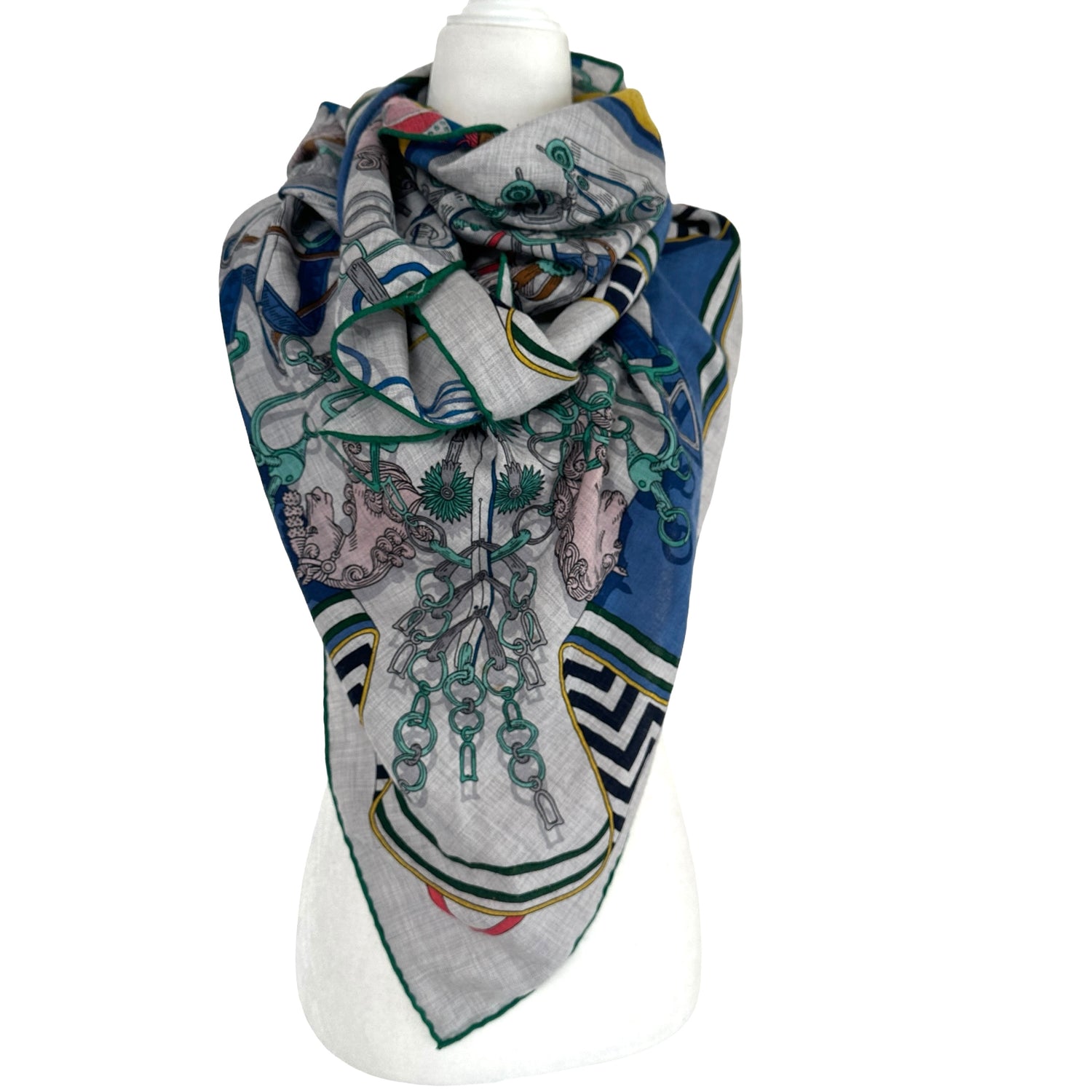 Hermes triangle shawl. This piece is multifunctional can be worn as a scarf, a top or a dress. Beautiful equestrian pattern in grey, blue, green and reds. Very soft.
