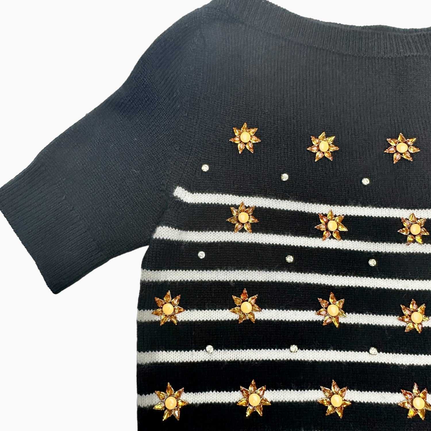 Gucci cashmere top with crystal embellishments at front. From the Spring/Summer 2015 Collection by Frida. Black and white striped cashmere. Short sleeves. This top is a dream of softness against the skin. Designer size XS.